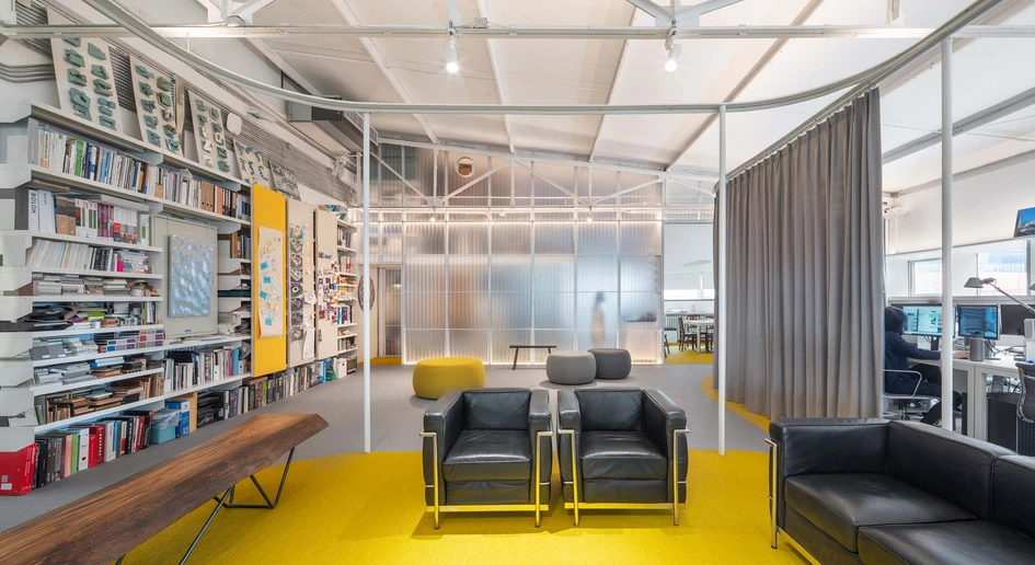 A functional strip offers separated meeting rooms, a kitchen, storage, and rest areas that are included in a former repurposed mezzanine level to maximize organization. These rooms are physically separated with a semi-transparent double-layered wall made from polycarbonate corrugated panels. The West wall is the only continuous solid wall without windows, which accommodates a vast hang shelving that includes the material and reference library, together with a selection of models and a Crossboundaries Award display.