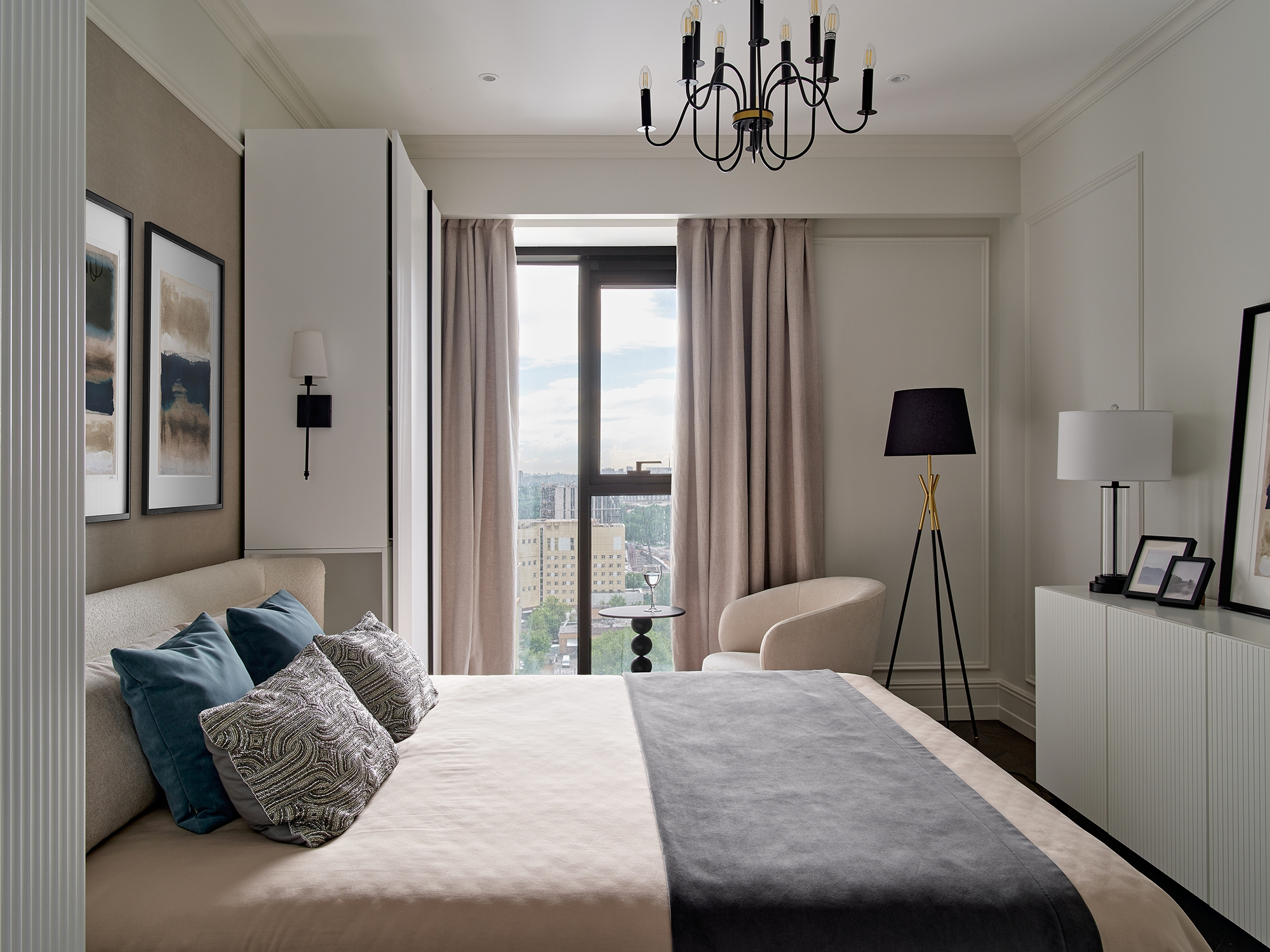 The bedroom features neutral tones to create a serene and uncluttered feel. Carefully chosen ADJ accessories maintain a minimalist elegance without overloading the space.