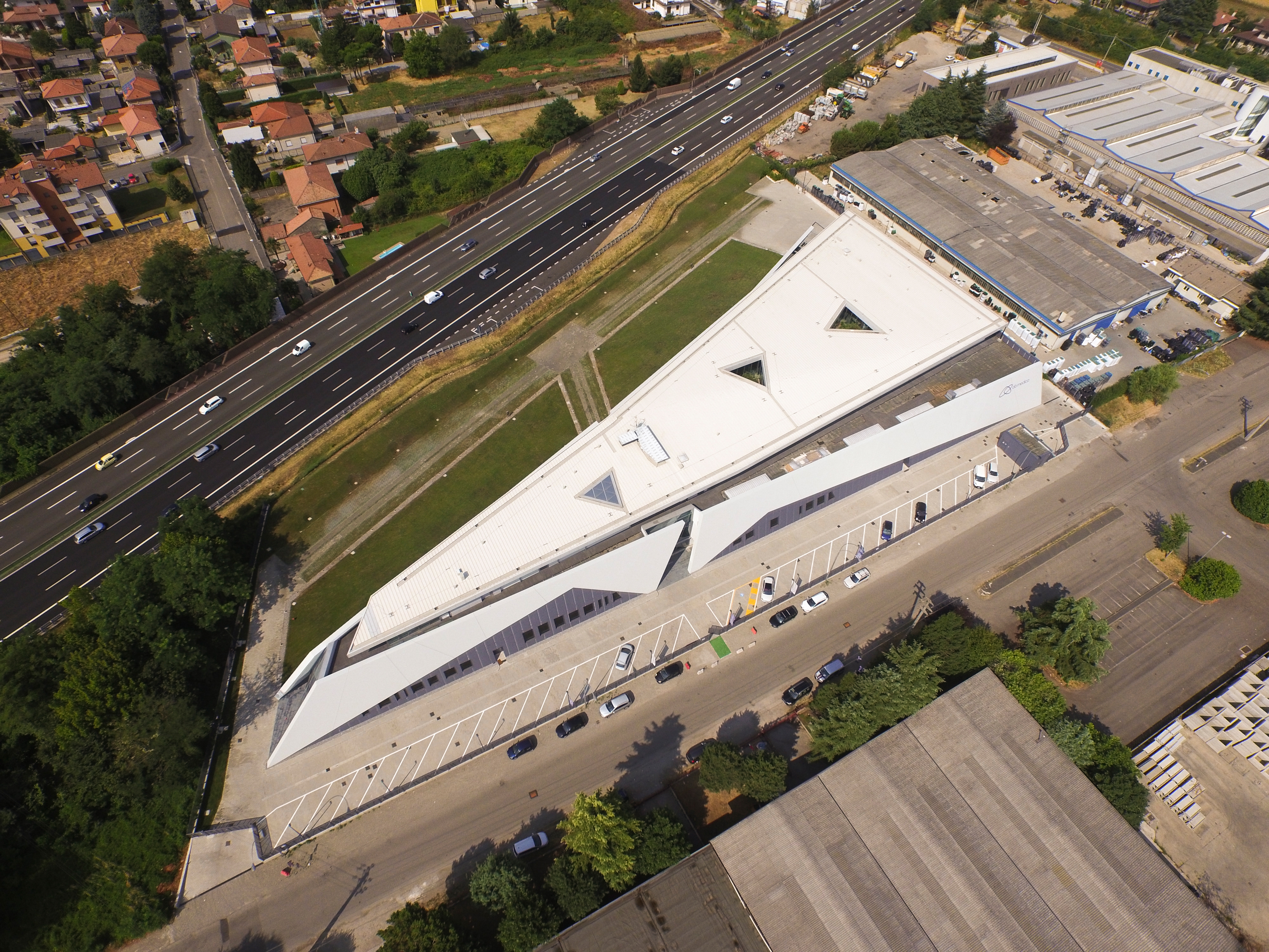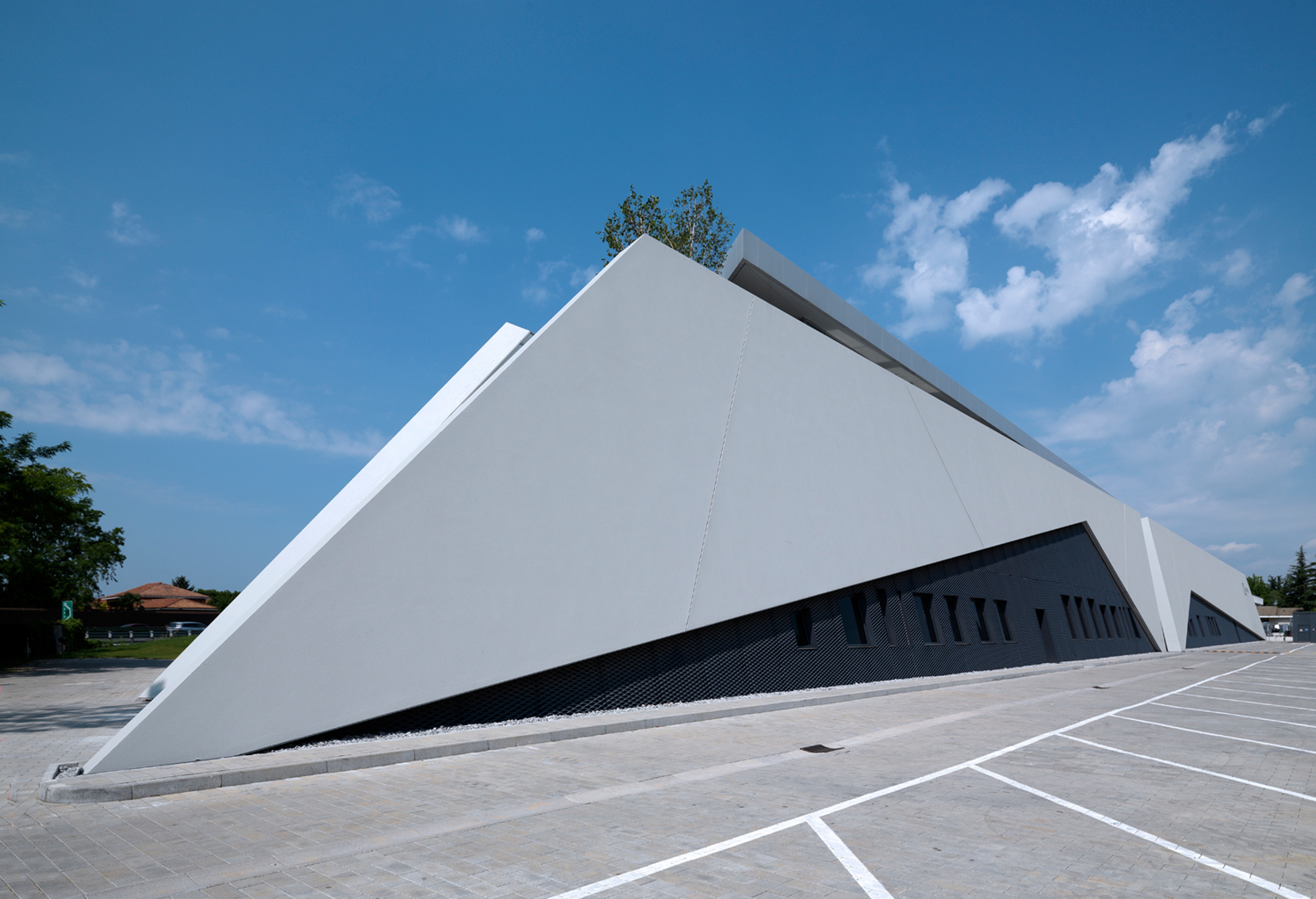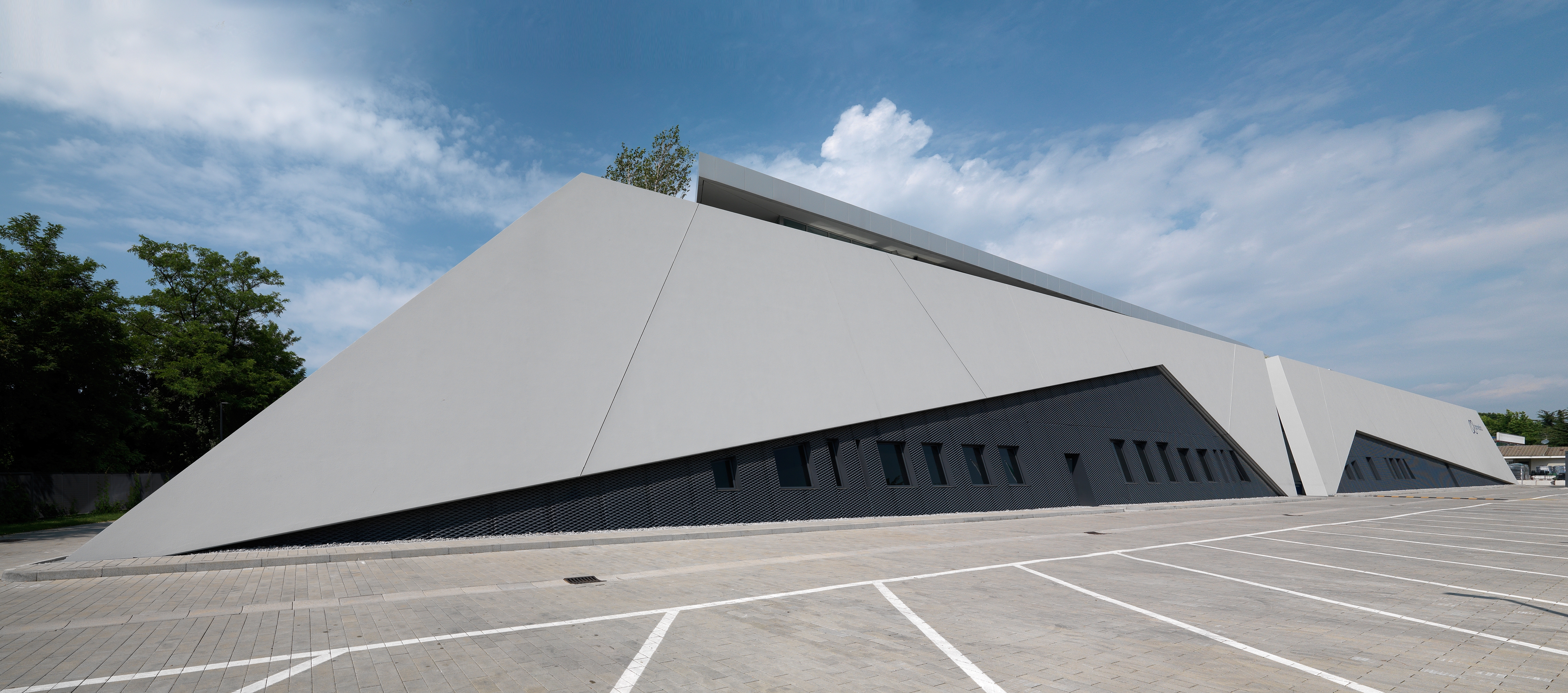 The basic volume recalls a streamlined prism with pre-coated aluminum cladding and an elongated triangular layout. Even at a glance, the exterior façades suggest the complexity of the partitions and help convey, especially through the shapes, a sense of "speed" that refers not only to the architectural design, but also the rapidity with which the company conceives and develops ideas, and innovates.