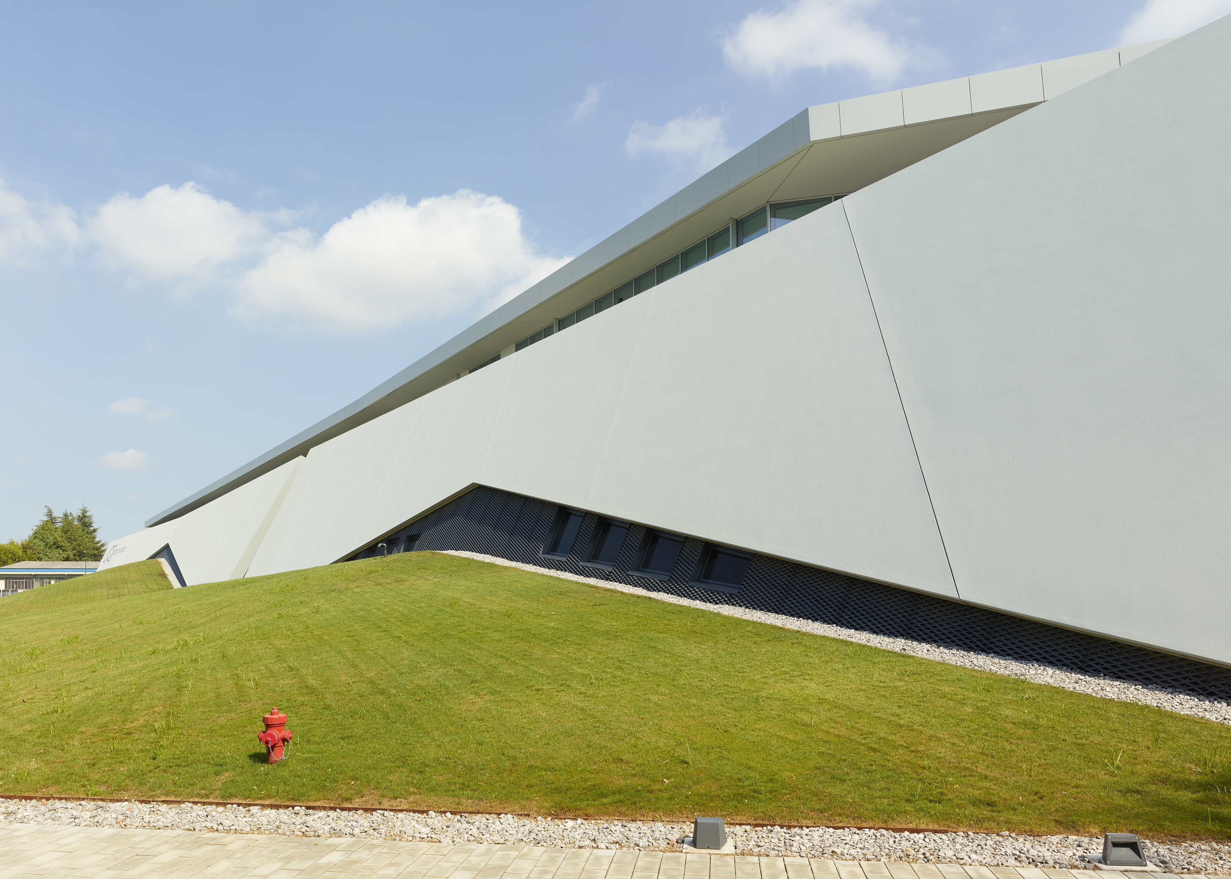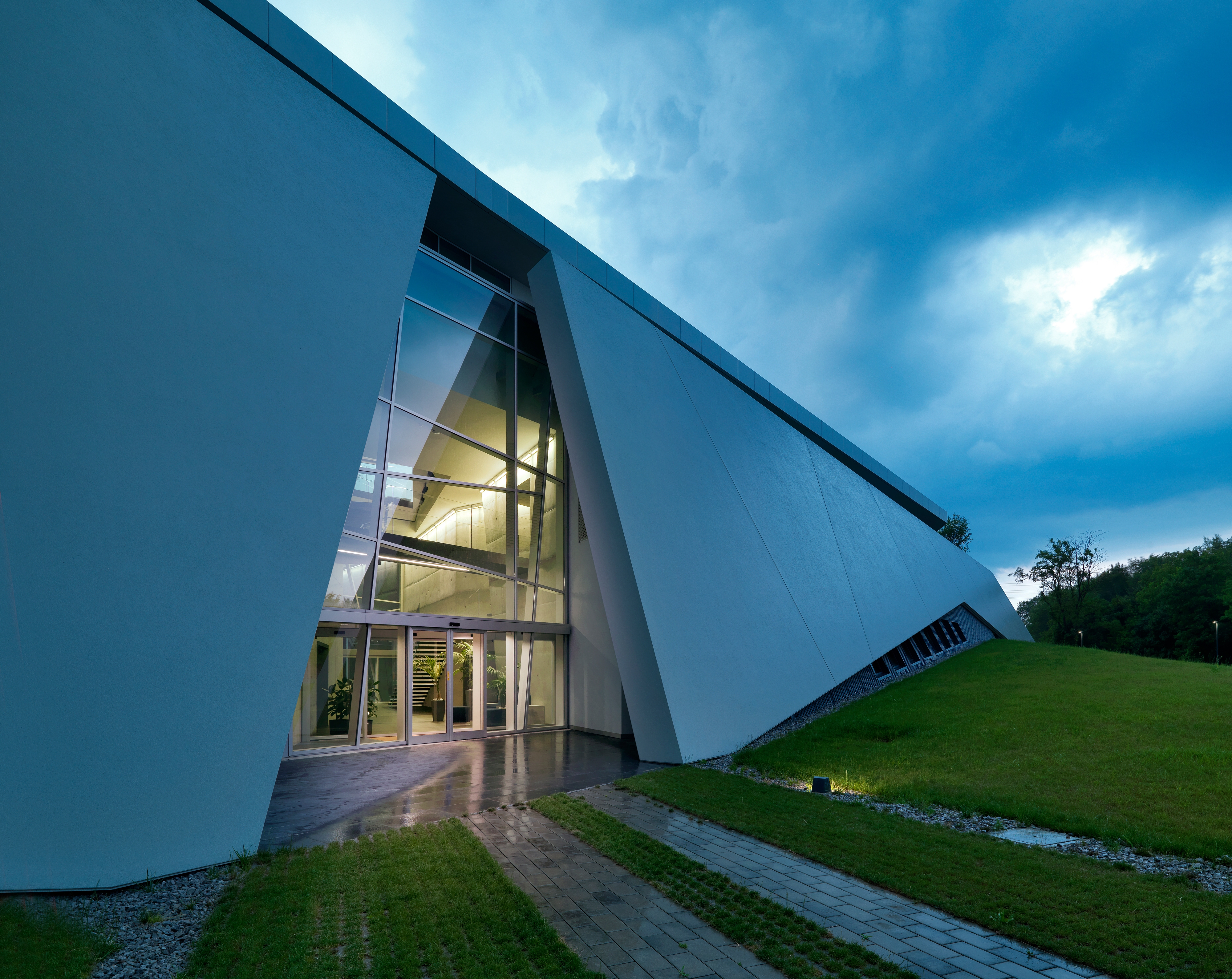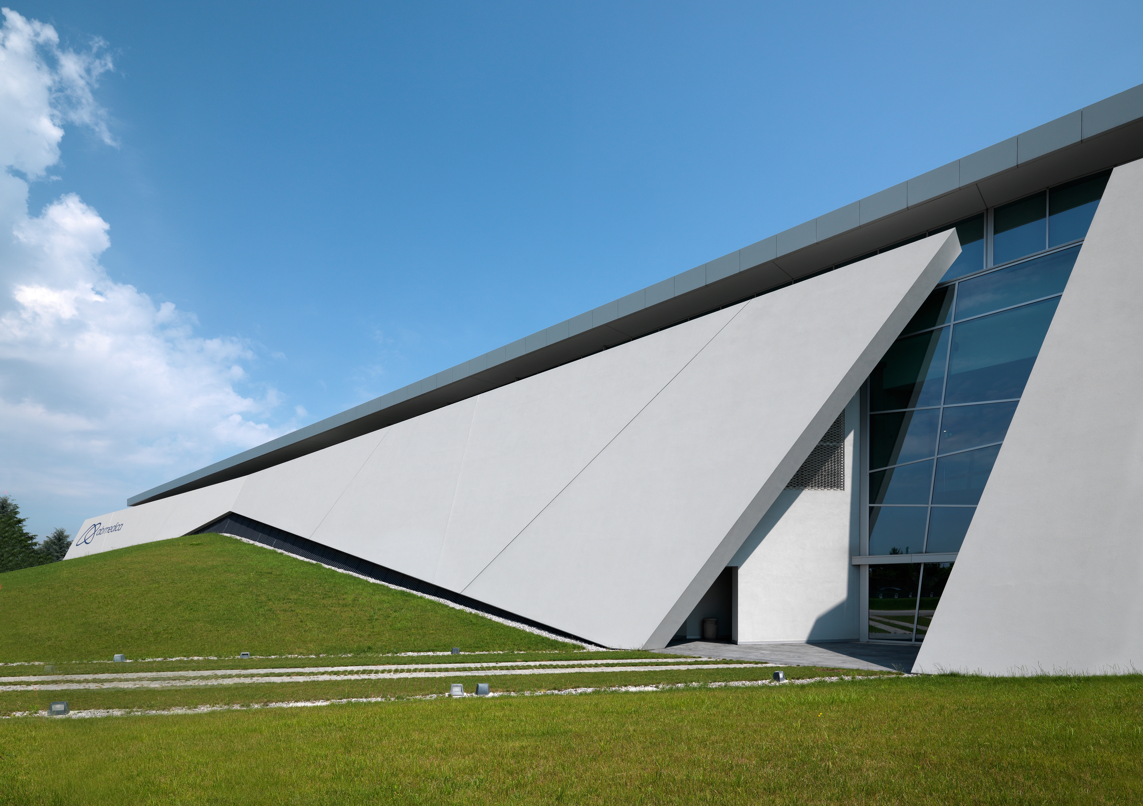 The basic volume recalls a streamlined prism with pre-coated aluminum cladding and an elongated triangular layout. Even at a glance, the exterior façades suggest the complexity of the partitions and help convey, especially through the shapes, a sense of "speed" that refers not only to the architectural design, but also the rapidity with which the company conceives and develops ideas, and innovates.