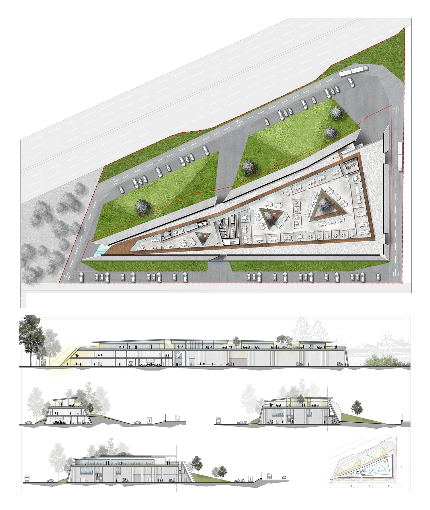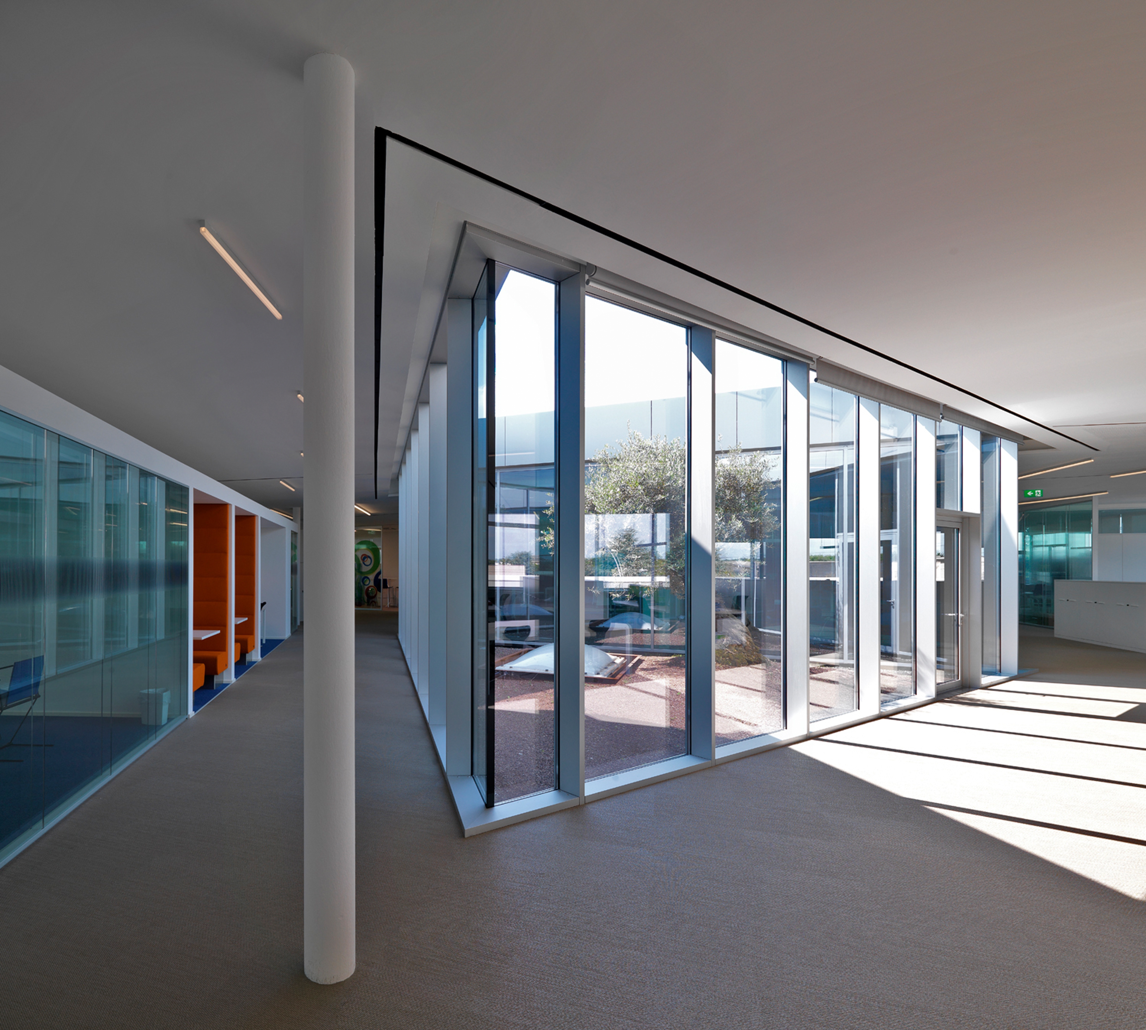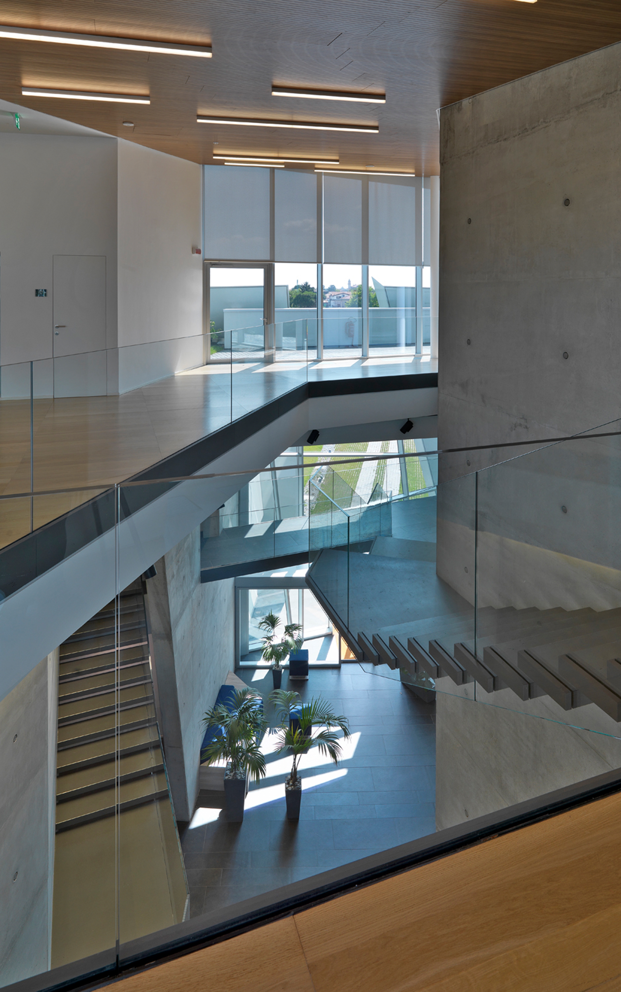 The construction restrictions created by the buffer area between the complex and the highway, and the limits of the buildable area resulted in a focal point that became the nucleus for this dynamic architectural vision and the internal composition. Inside, functionality and the relations between elements define the appearance.