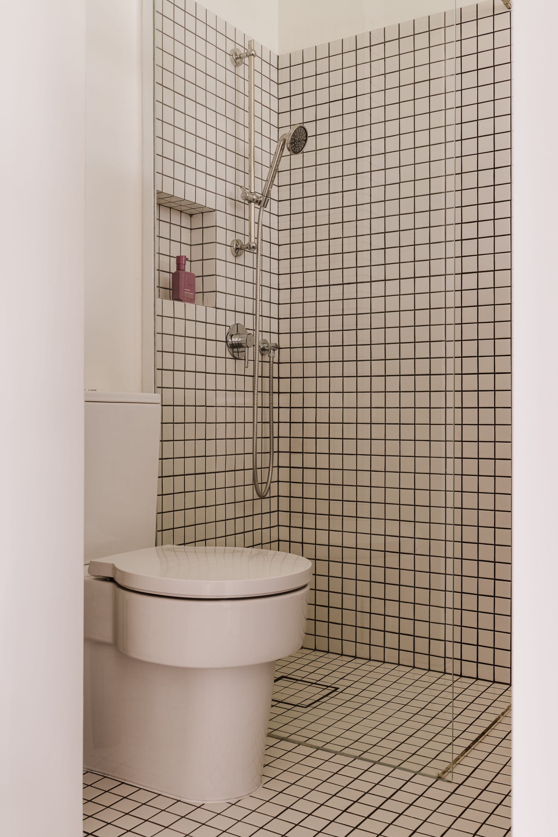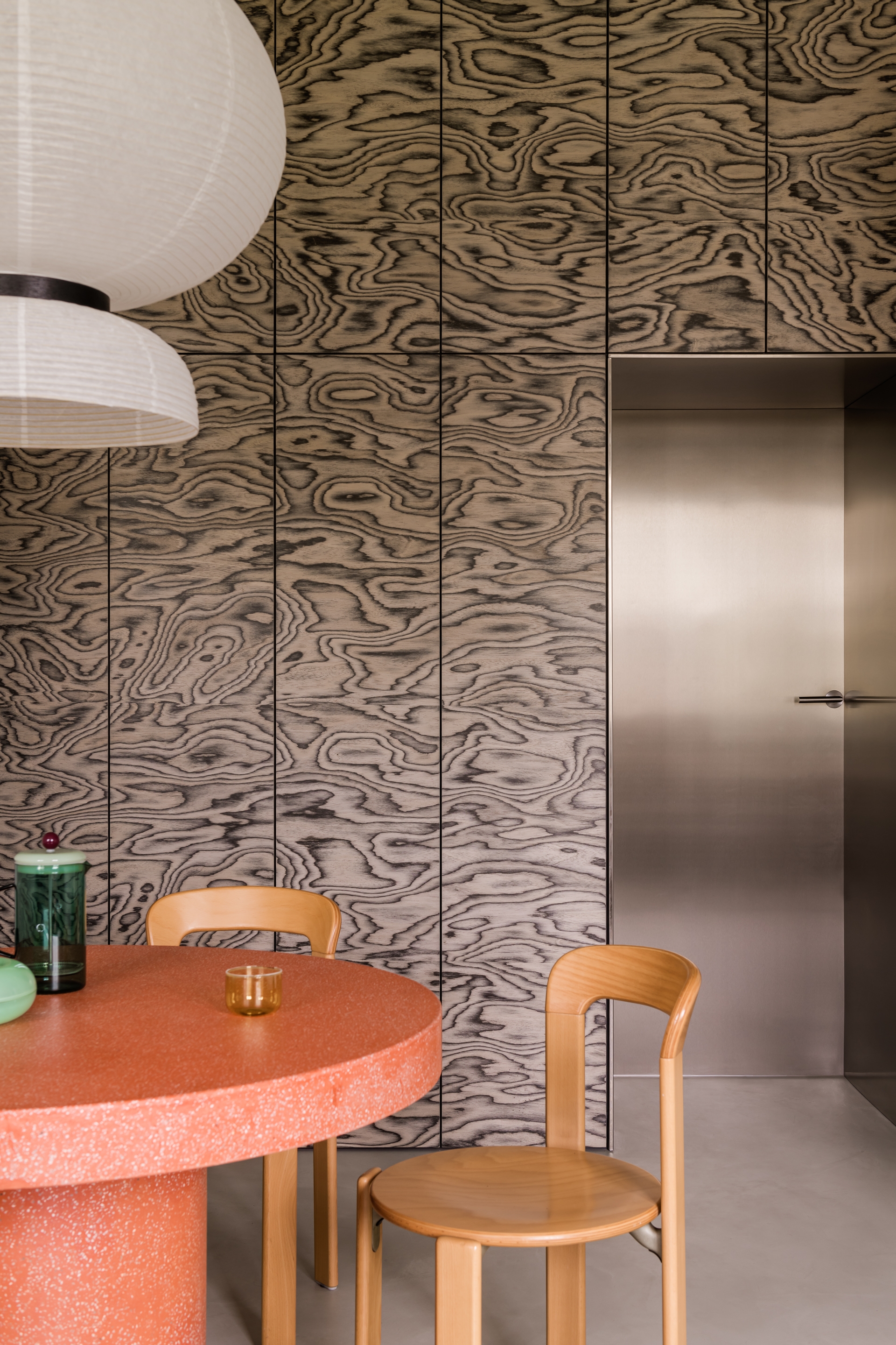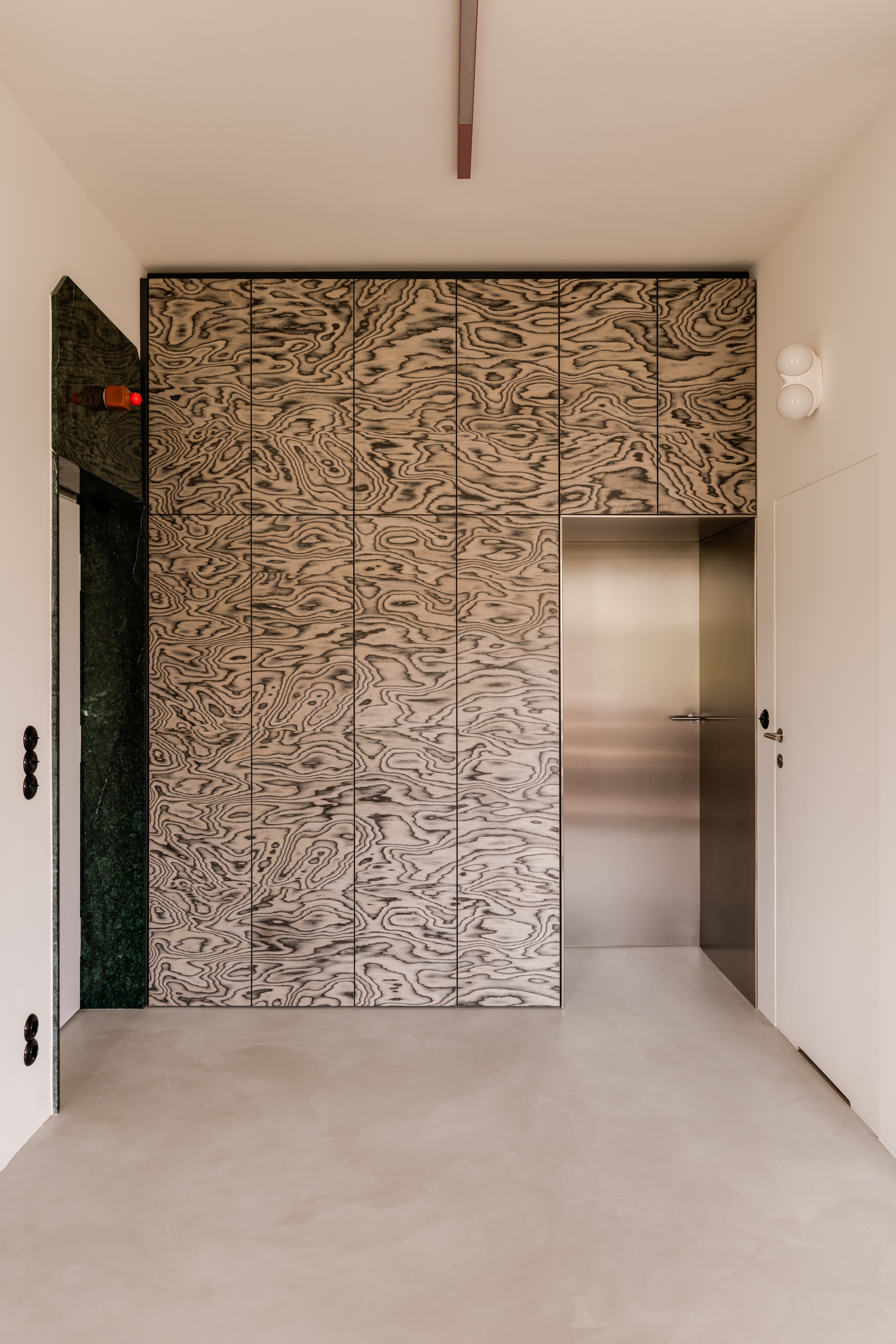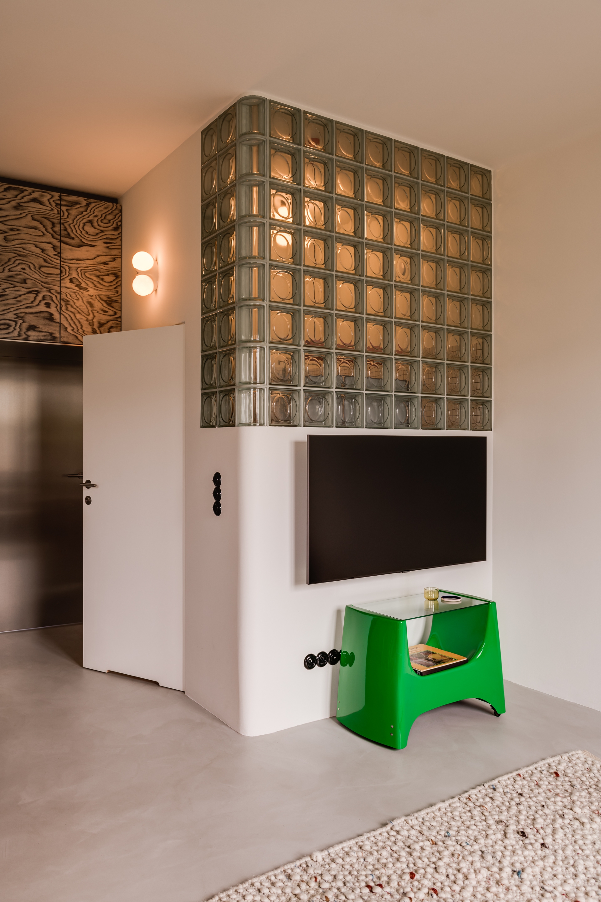 The owner’s dream was to have light grey microcement floor. Stainless steel, veneer, and glass bricks also figured on her wish list. All the elements were combined into a neat puzzle.