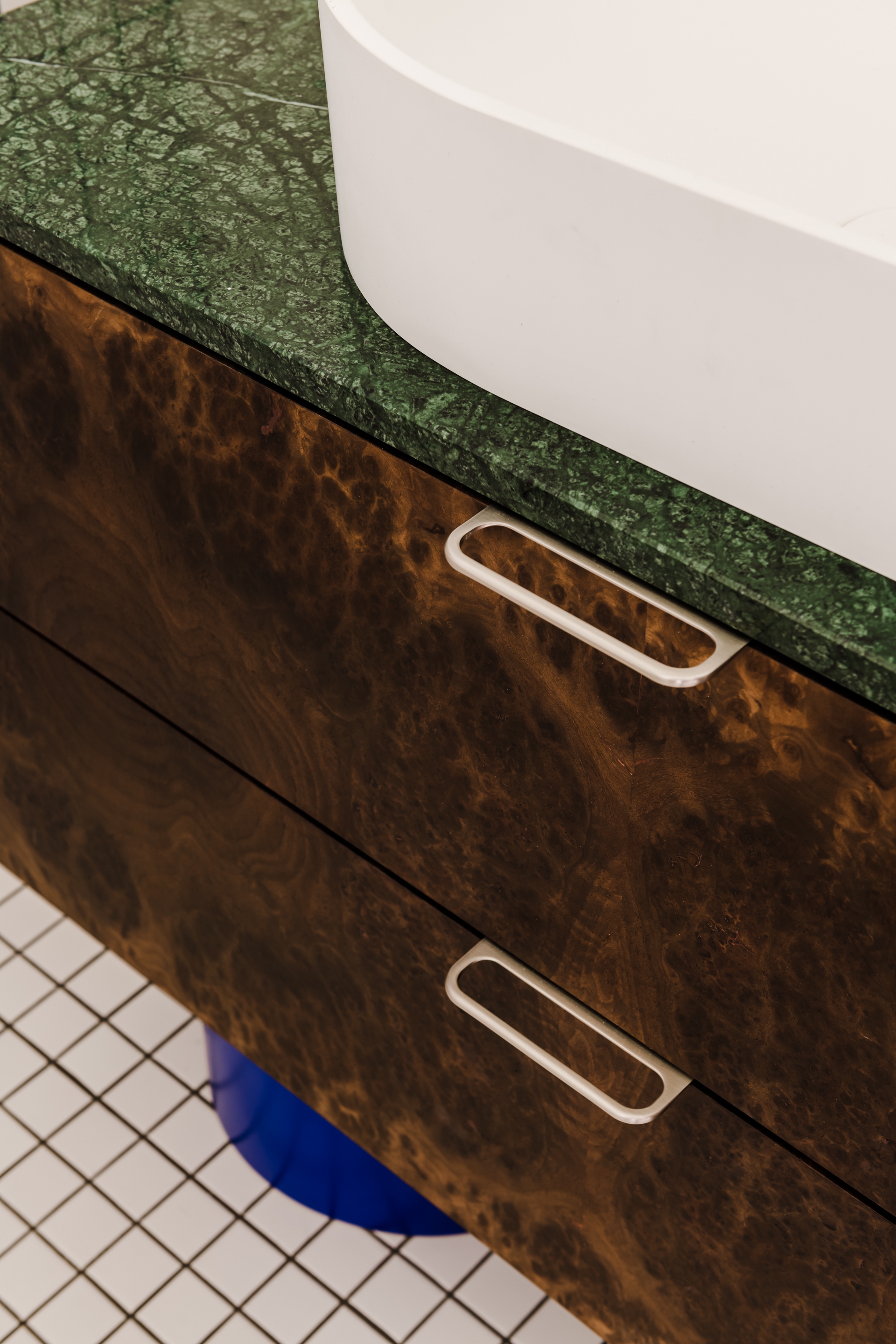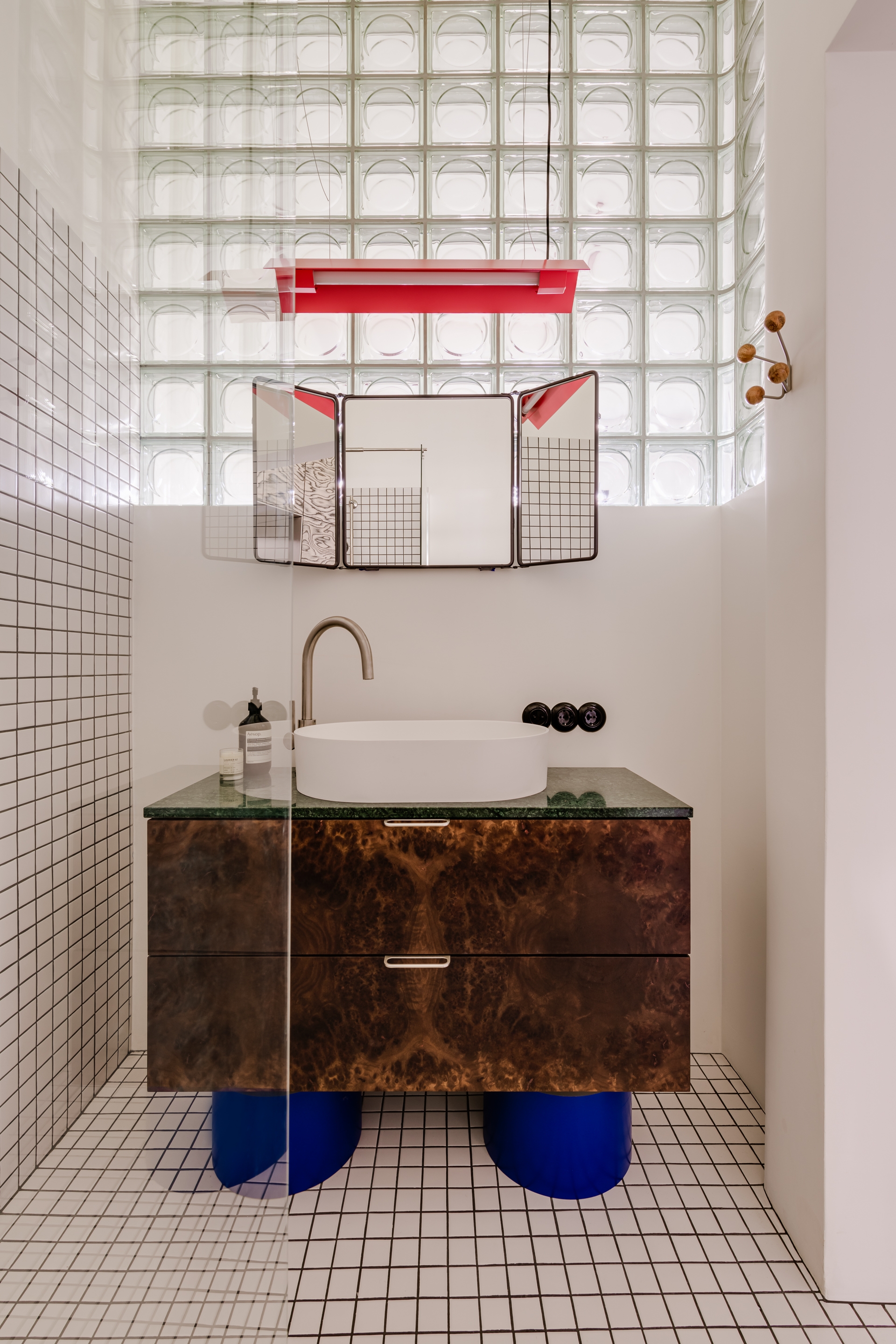 A small bathroom constitutes the last element of this elaborate puzzle. It has been reduced to the necessary minimum, but this does not mean that it’s missing unconventional solutions. A curved wall made of glass bricks is visible from the outside. Paulina’s beloved glass bricks allow sunlight to filter in, turning this previously dark room bright. A custom-designed bathroom cabinet shaped like a chest of drawers on squat legs in an intense shade of cobalt stands out against the raw pool tiles chosen by designers from the Mistovia studio. A skilful eye will notice that the cabinet was made of the same veneer as the built-in furniture in the kitchen, and that the countertop is decorated with the same green marble decorating the front door's portal. Everything is perfectly complemented by a pink lamp by the Polish brand Lexavala. Panes of a three-dimensional mirror reflect and multiply bold patterns at different angles – more is more!
