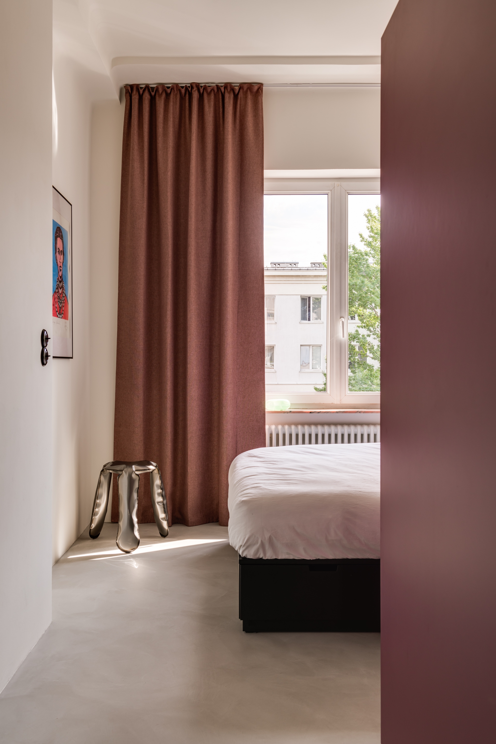 The apartment is based on several dominant "cubes". Each of them has a different function, accentuated by various patterns through the use of veneer or colour. In the kitchen, the tall built-in furniture finished with veneer made of an extremely impressive American walnut burl constitutes the main feature. The mesmerizing organic pattern contrasts perfectly with the smooth surface of the brushed steel cabinets and the rigorous geometry of simple white tiles lining part of the wall. Accent number two welcomes guests upon entering the apartment – after crossing the portal finished with Brazilian green marble, their eyes take in the truly psychedelic motif, originally created by nature, but later refined by post-modernist Ettore Sottsass. It houses a wardrobe finished with an impressive veneer, designed by Sottsass in 1985. The pink terrazzo round table and the vintage oblong chairs designed by Bruno Rey pay homage to the colourful aesthetics of the Memphis Group. The steel door placed in the closet leads to the bedroom, dominated by the colour purple mixed with navy accents (porcelain sconces and Italian tiles on the bed’s headboard). The large size of the room accommodated also a functional, cube-shaped wardrobe and a utility room, concealed by white built-in furniture. This way, the living area is effectively separated from the private part of the apartment.