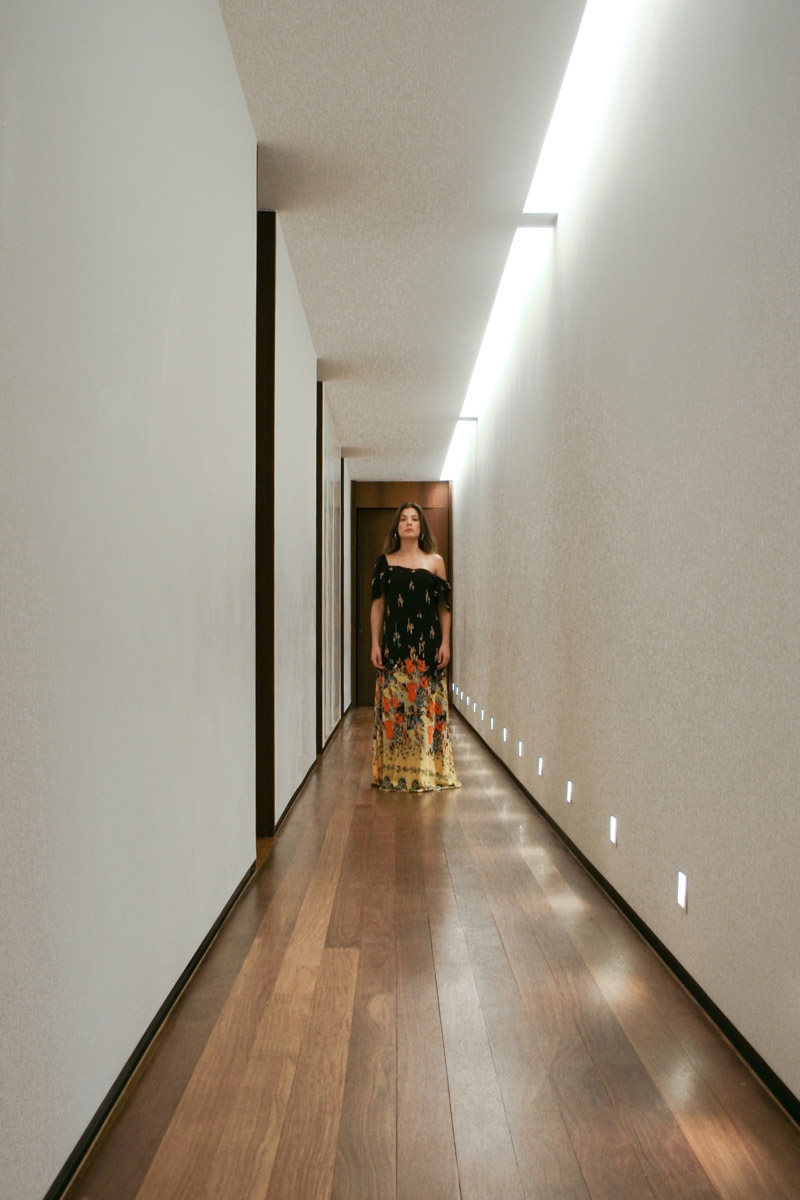 “Less is more” are the words that best translate the building. Using the sloping site for its own benefits, the 600m² house was embedded, like an uncovered box, inside 7, 5 meters high walls, which is ideal to keep the family’s privacy and security from the busy streets of this small city in south Brazil. The steep site granted two stories to the house, both located around the patio and pool. By the street level, the intimate area, consisted of 4 suites and an office can be discreetly accessed. The social and services areas are located in the basement level, inside a big rectangular volume, covering the lot from end to end and facing the patio in its totality. To obtain natural light in the basement area, skylights were strategically placed all over the roof, filling the needs for artificial light during the day.