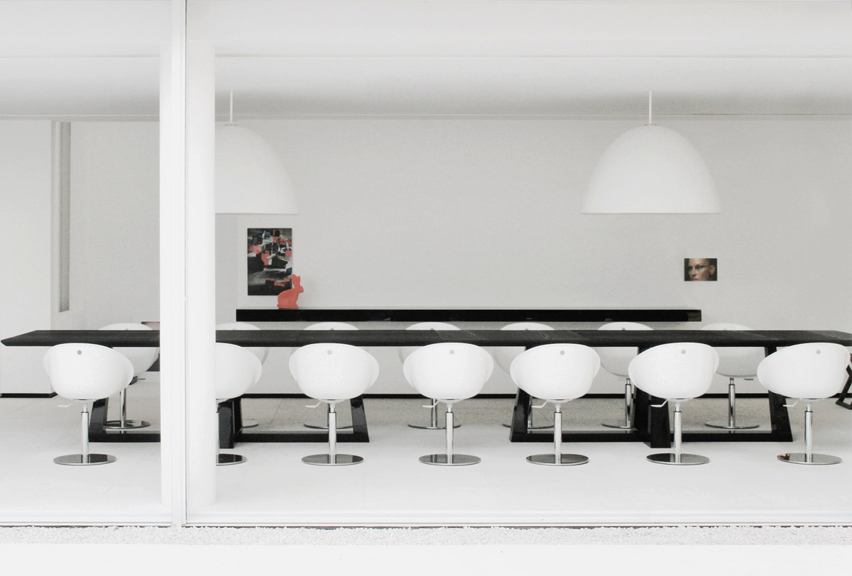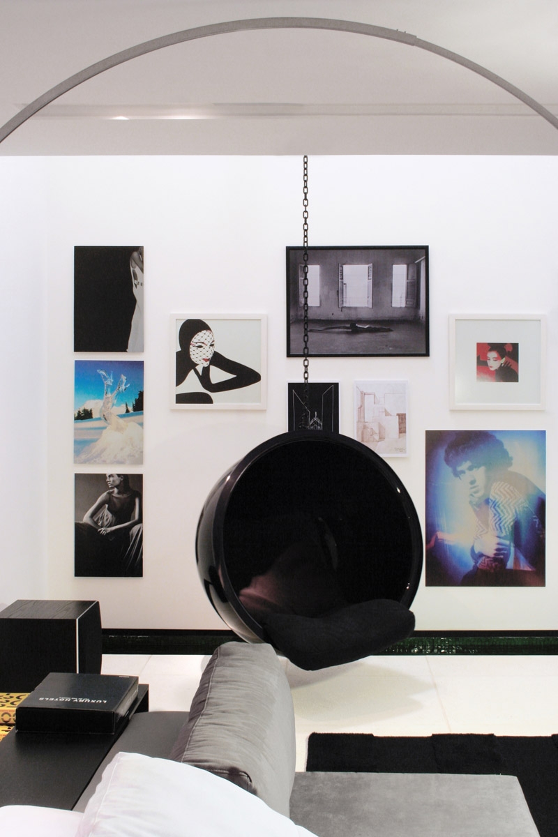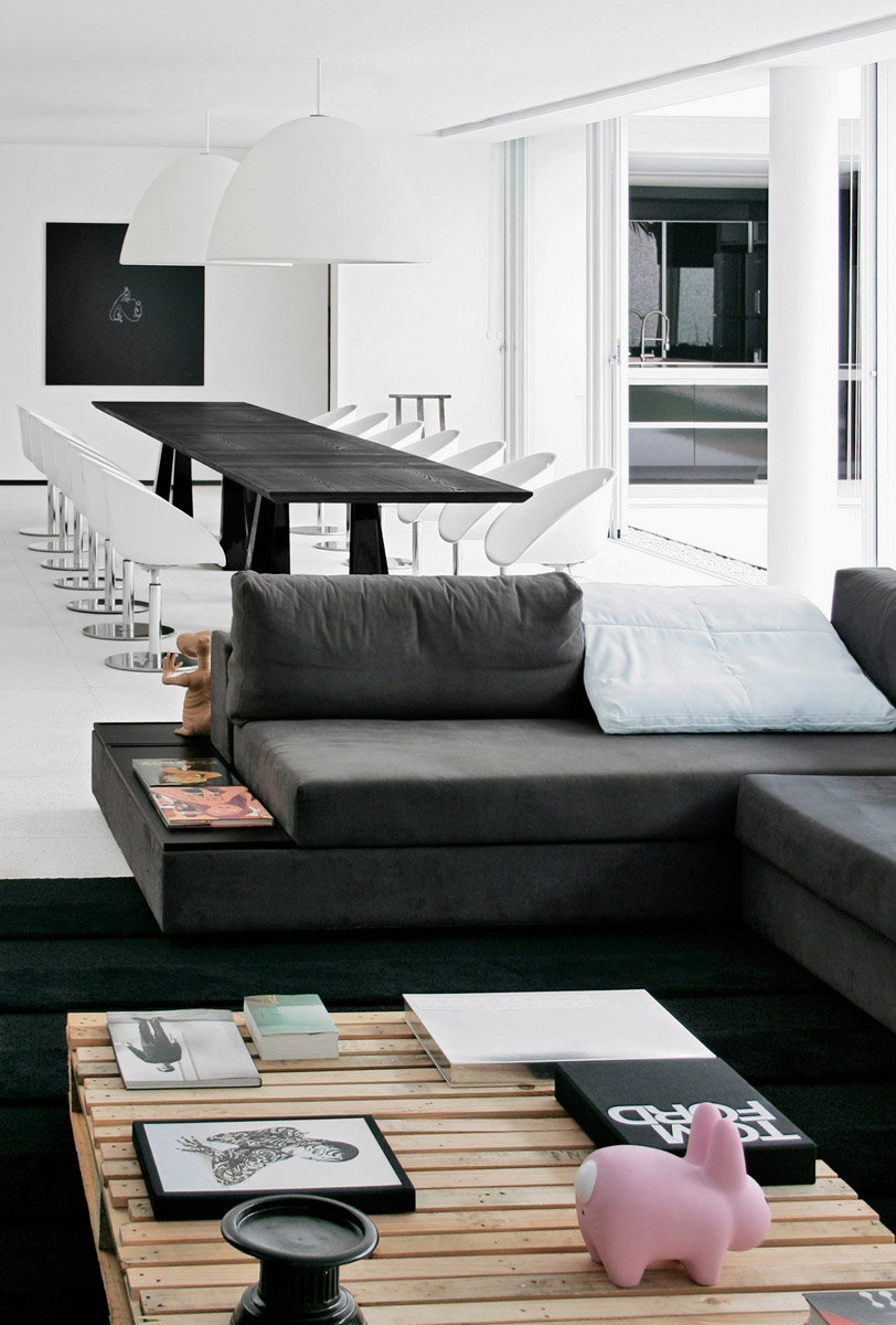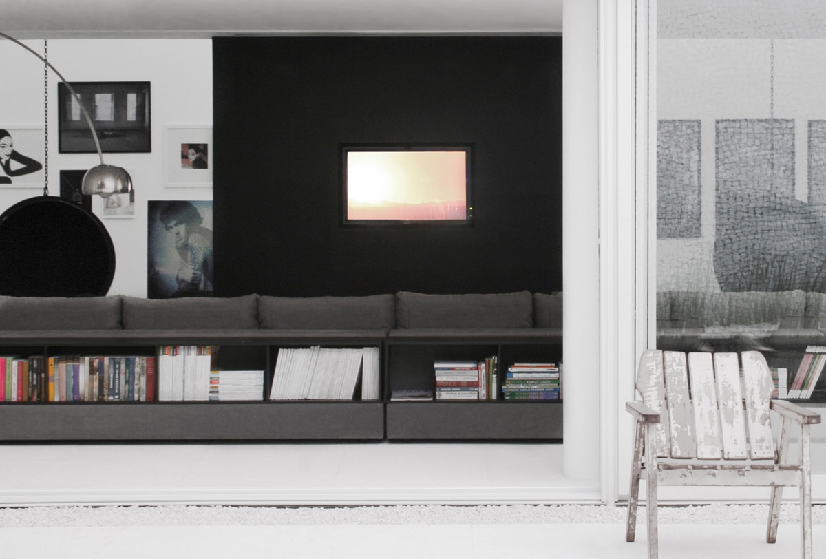 The bedroom floors were done in cumaru wood, while white cement was used in the social areas. The furniture was oversized to receive the numerous guests: a 7 meters long table and a 10 meters long sofa. The idea is the contrast between black and white, a chromatic game which is also repeated on the exterior. The patio has no gardens, just palm trees around the pool. Loyal to the sustainable beliefs, the coffee table gathers construction pallets picked up on the streets, recycled and combined to create a generous supporting surface, a simple detail that became the owner’s favorite object.