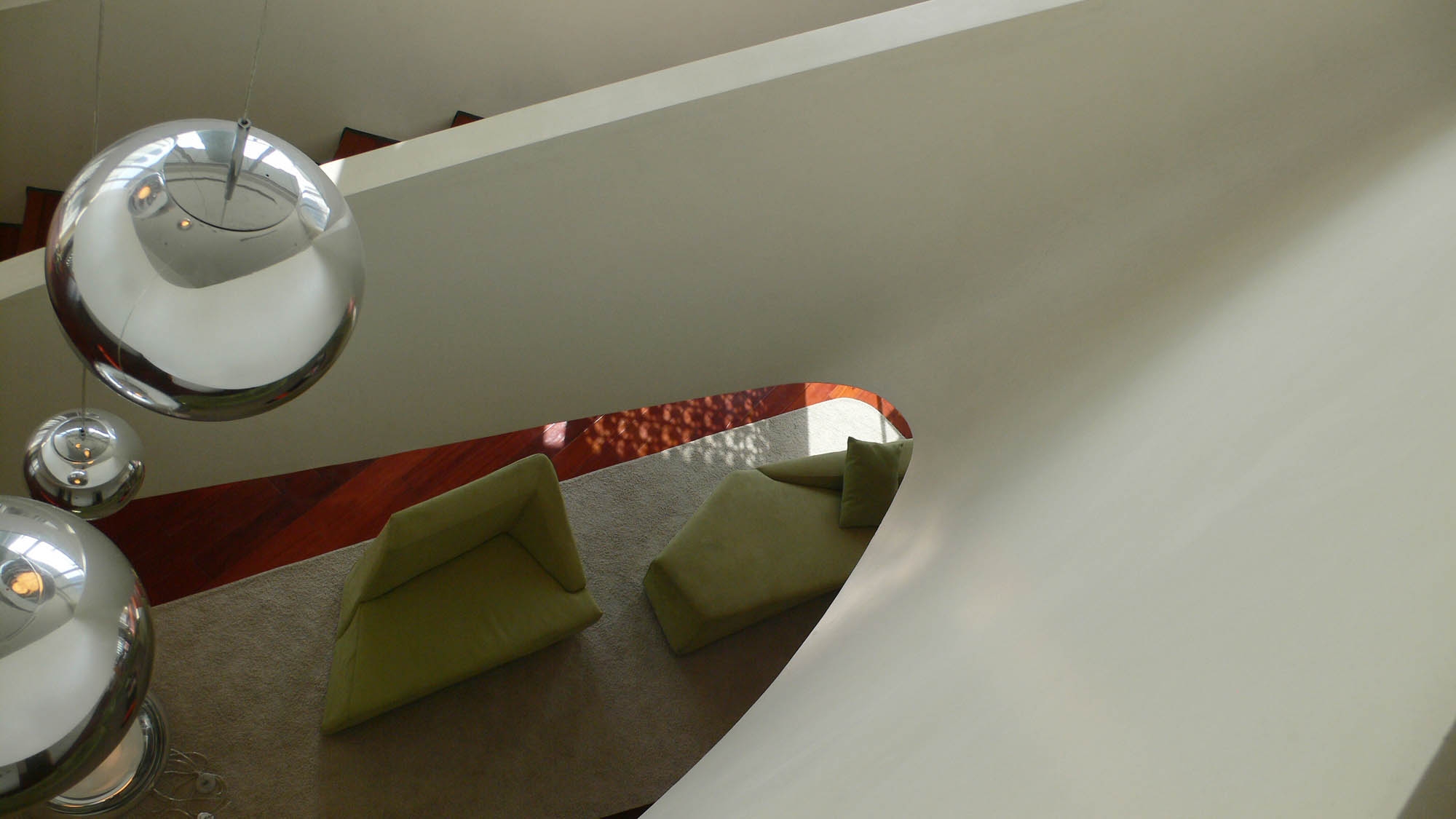 A sculptural open stair is leading up to the private master bedroom with terrace and library as an extension to the main representative areas.