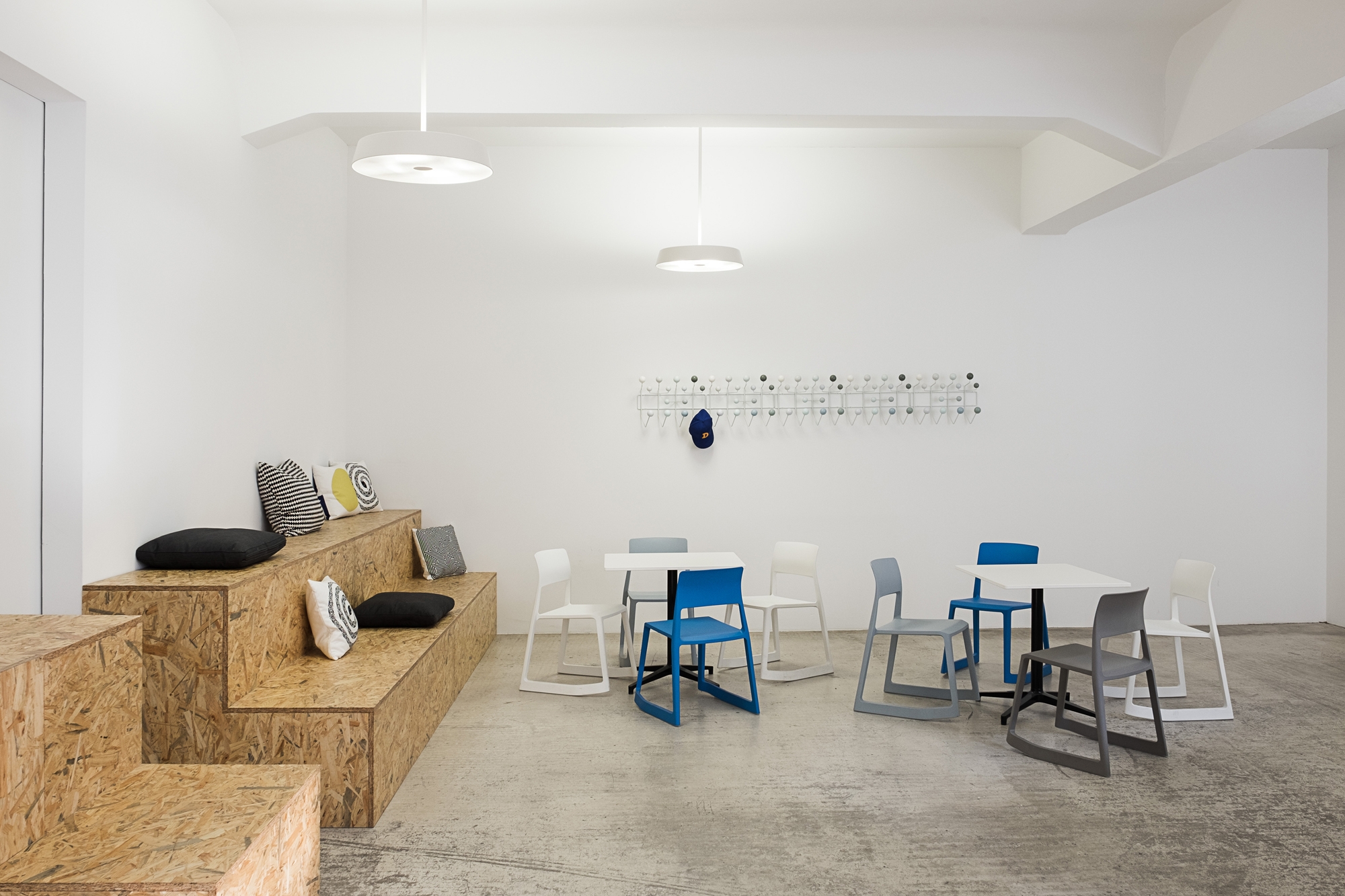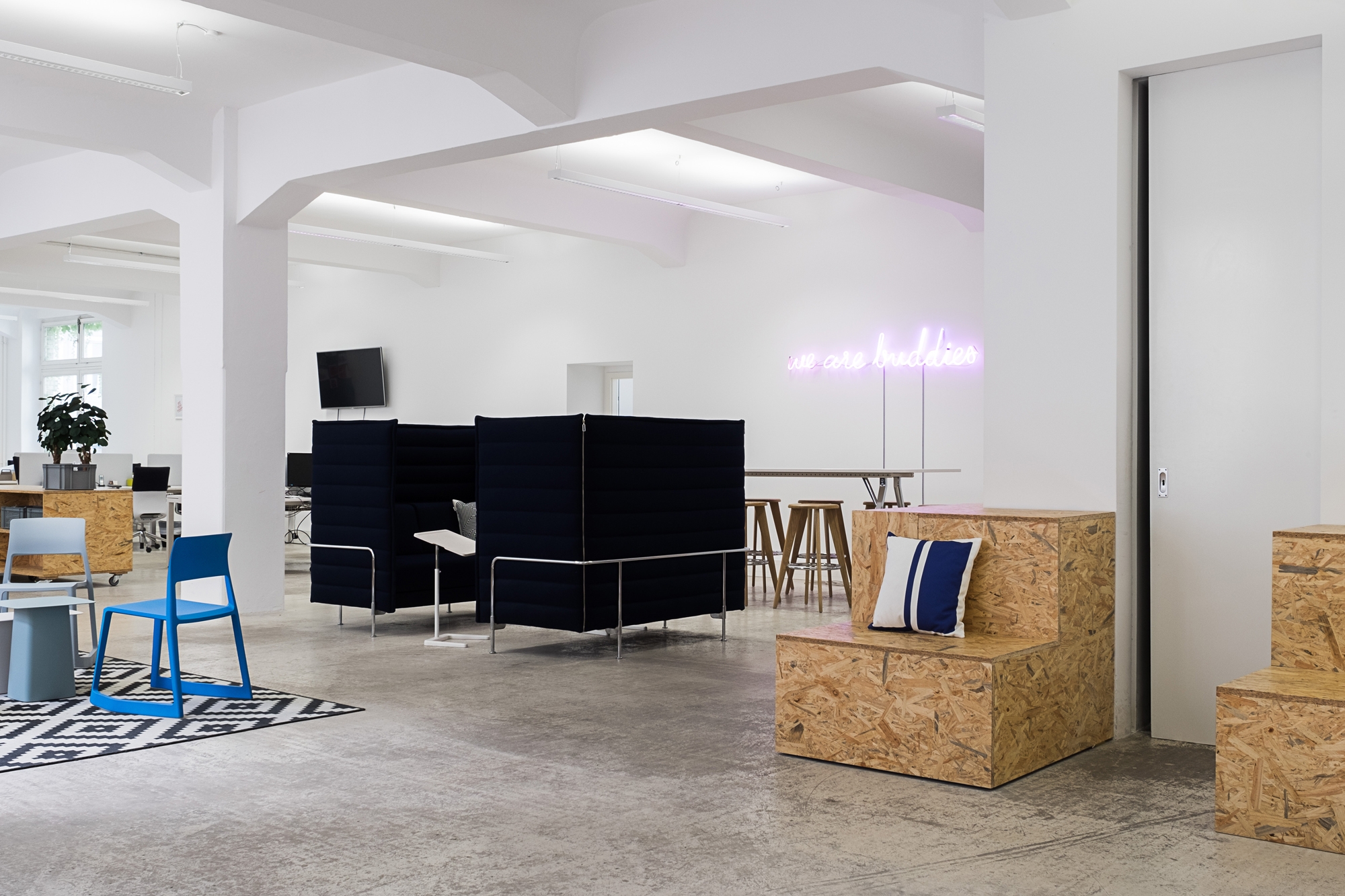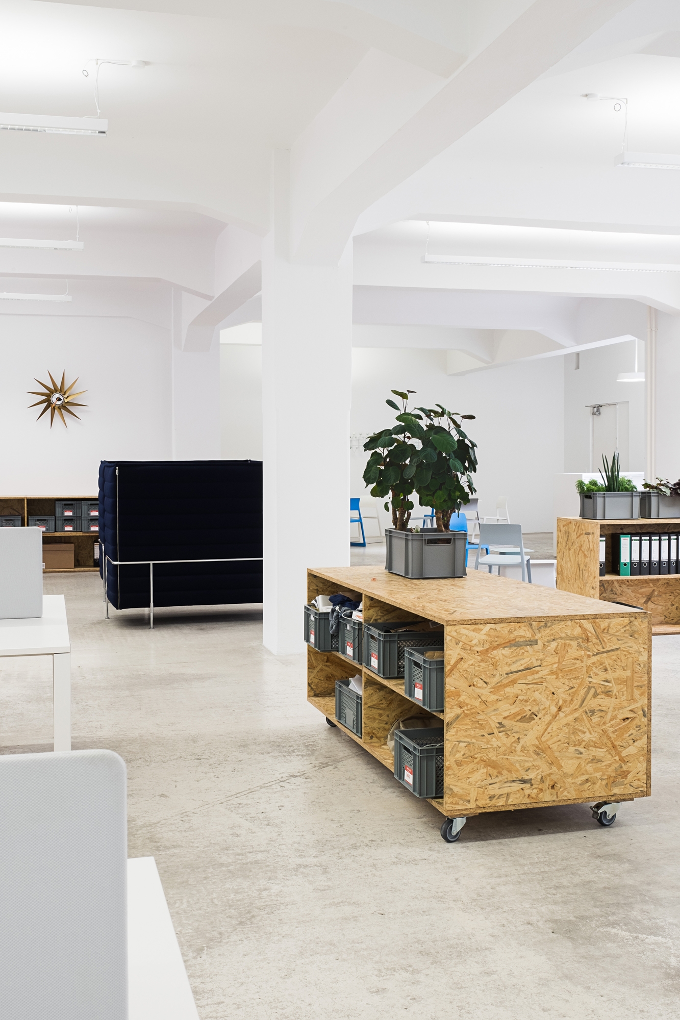 Simple OSB Modules for seating and storage were added to the original concrete flooring and newly white washed walls. Those function as blank canvas for Vitra's furniture and accessories.