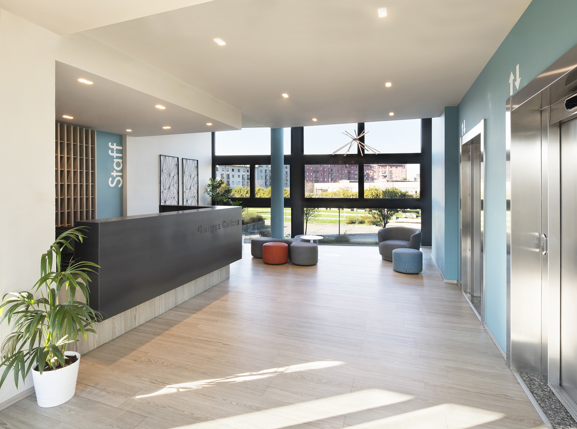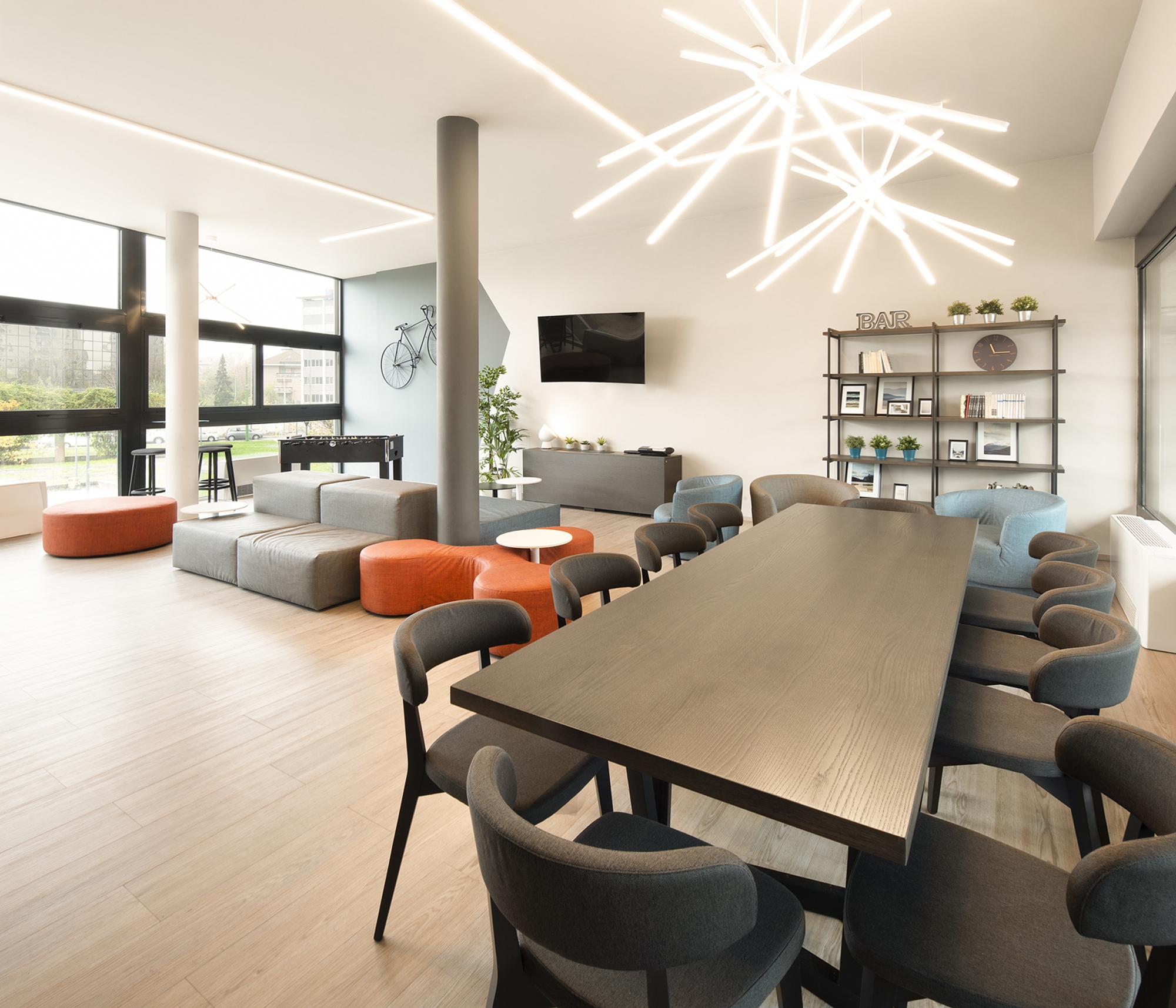 At the client’s request (the campus is owned by InvestiRe Sgr and is managed by In Domus, as are the other student residences at Bicocca in the Lambrate area) Giuseppe Tortato Architetti developed and designed a project for the complete restyling of the building interiors, starting with the common areas. The goal was to renovate the complex’s image and at the same time make it more welcoming.