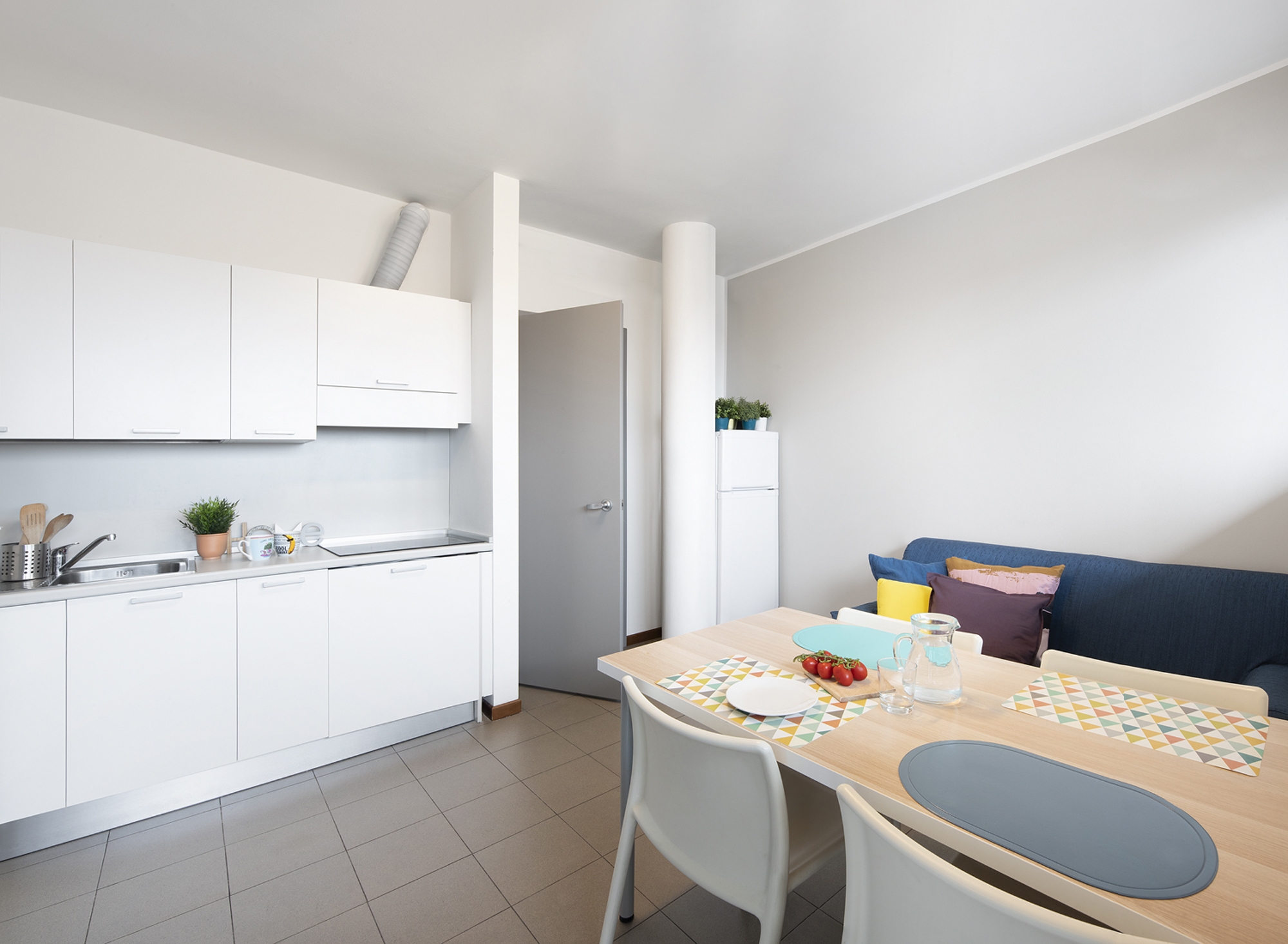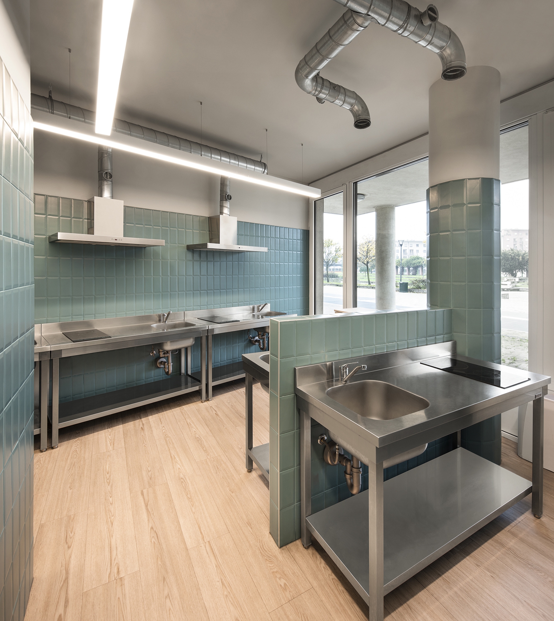The central building and the ground floors of the two towers have now been adapted to house reception and common areas as well as gathering places. Here you will find spaces like the study rooms reserved for guests of the campus, with a smaller room intended to accommodate up to 15 people and a larger one that can seat about 40; the designated workout area, featuring a large window overlooking the square, and finally the kitchen area.