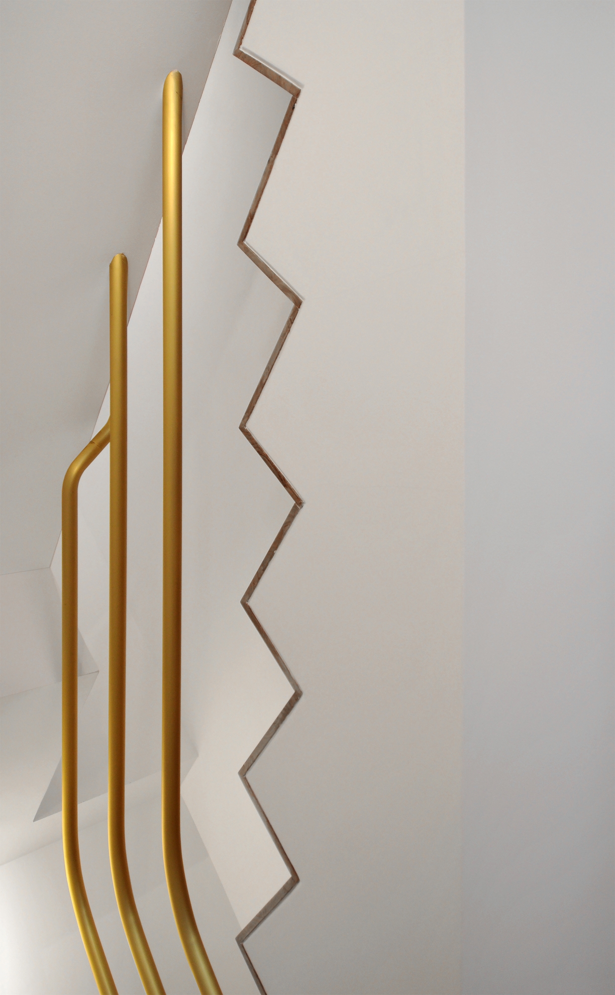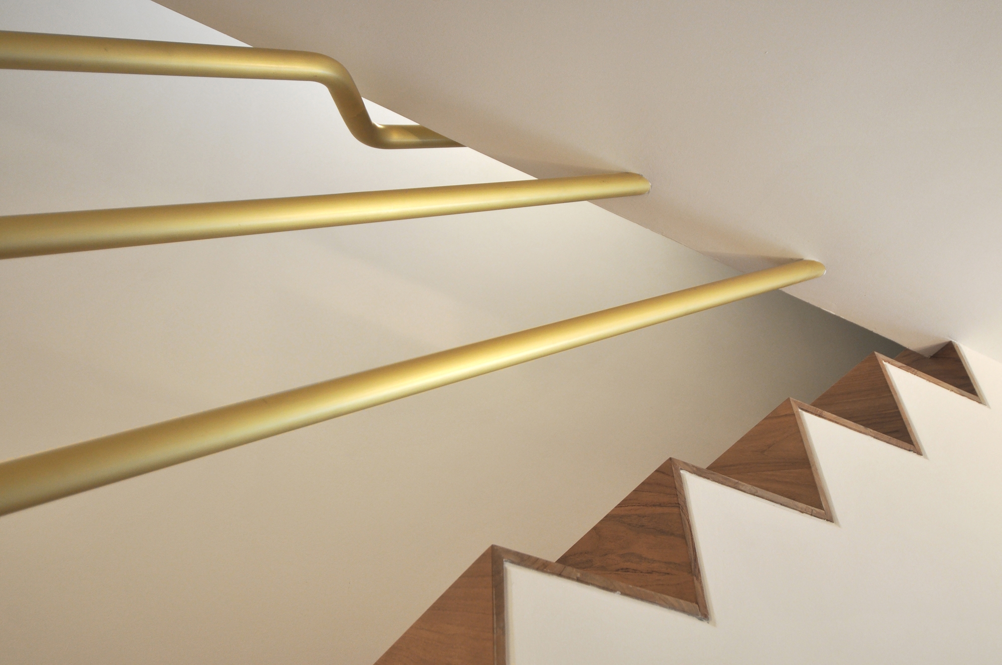 The succession of the various environments gives life to a sequence of three elements: the golden yellow of the tinted mirrors and the brushed brass handrail, the pure white of the walls and furniture, and the natural wooden floor. It is this narrative rather than any other design choice that gives consistency to the intervention, just as “Ariadne's thread” unravels throughout the itinerary to mark and highlight the changes brought about by the renovation.