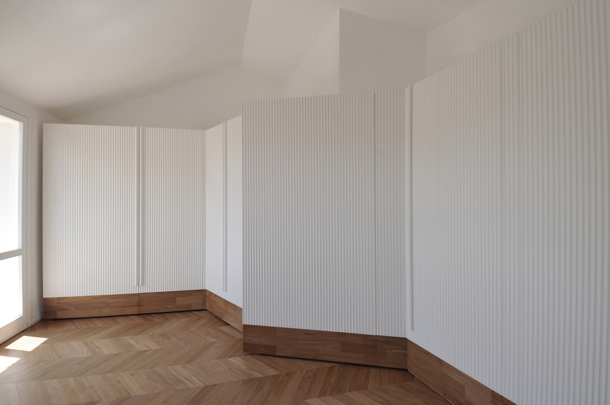 The exposed surface, a steady background in the kitchen and in the living room, a more articulated envelope in the bedroom, reveals in its opening and decomposition secret rooms, spaces not-perceivable in advance, varying depths depending on the needs and constraints. The shutters rotate, slide, overlap according to the specific situation.