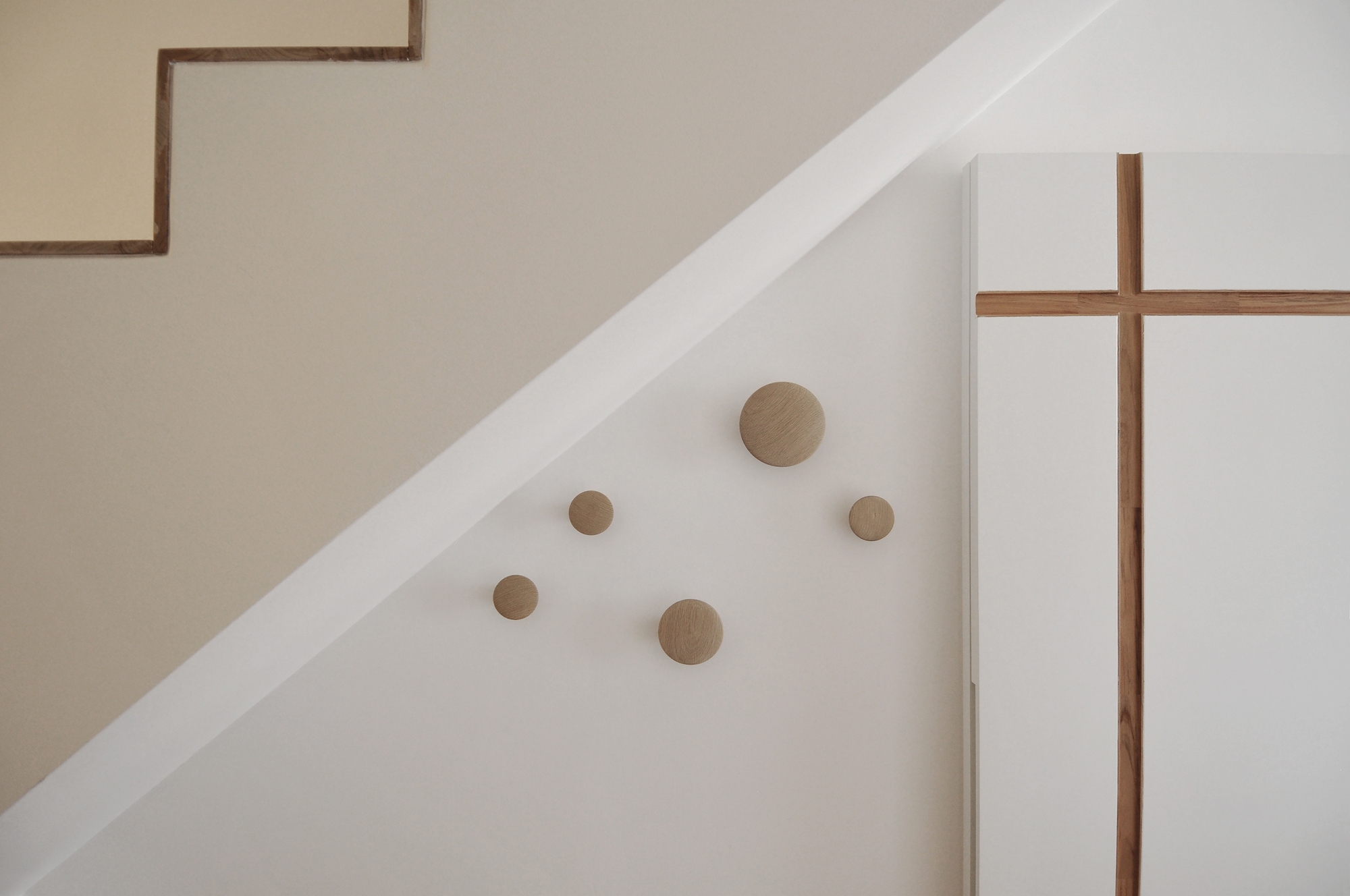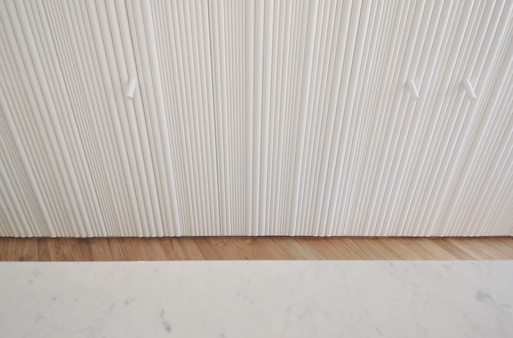 The external treatment adopted for all of the elements, entirely made in wooden structure, expresses the many possibilities offered by the same material when it goes trough different operations: in the kitchen wardrobe, cylinders of varying diameter made of lacquered wood are joined together following the panels module; in the living room is the same floor to bend on the vertical surface of the shutters, whereas in the bedroom is just the base for the wide white panels carved in a continuous lacquered fluting, a real counter-form of the dowels used in the kitchen.