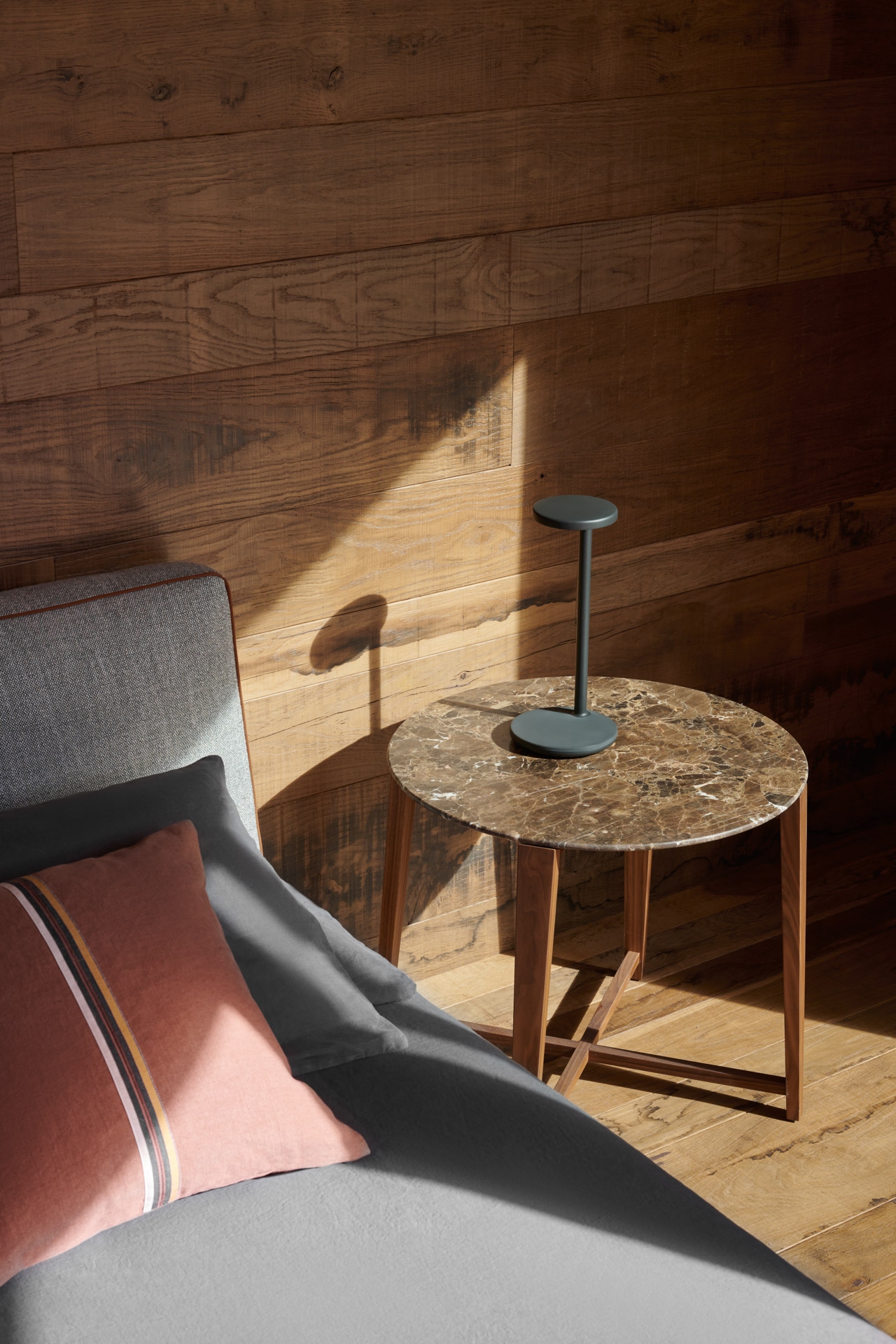 In the bedrooms, the Gregory bed and Tris side tables enhance and complement the visual warmth provided by the wood paneling on the walls.