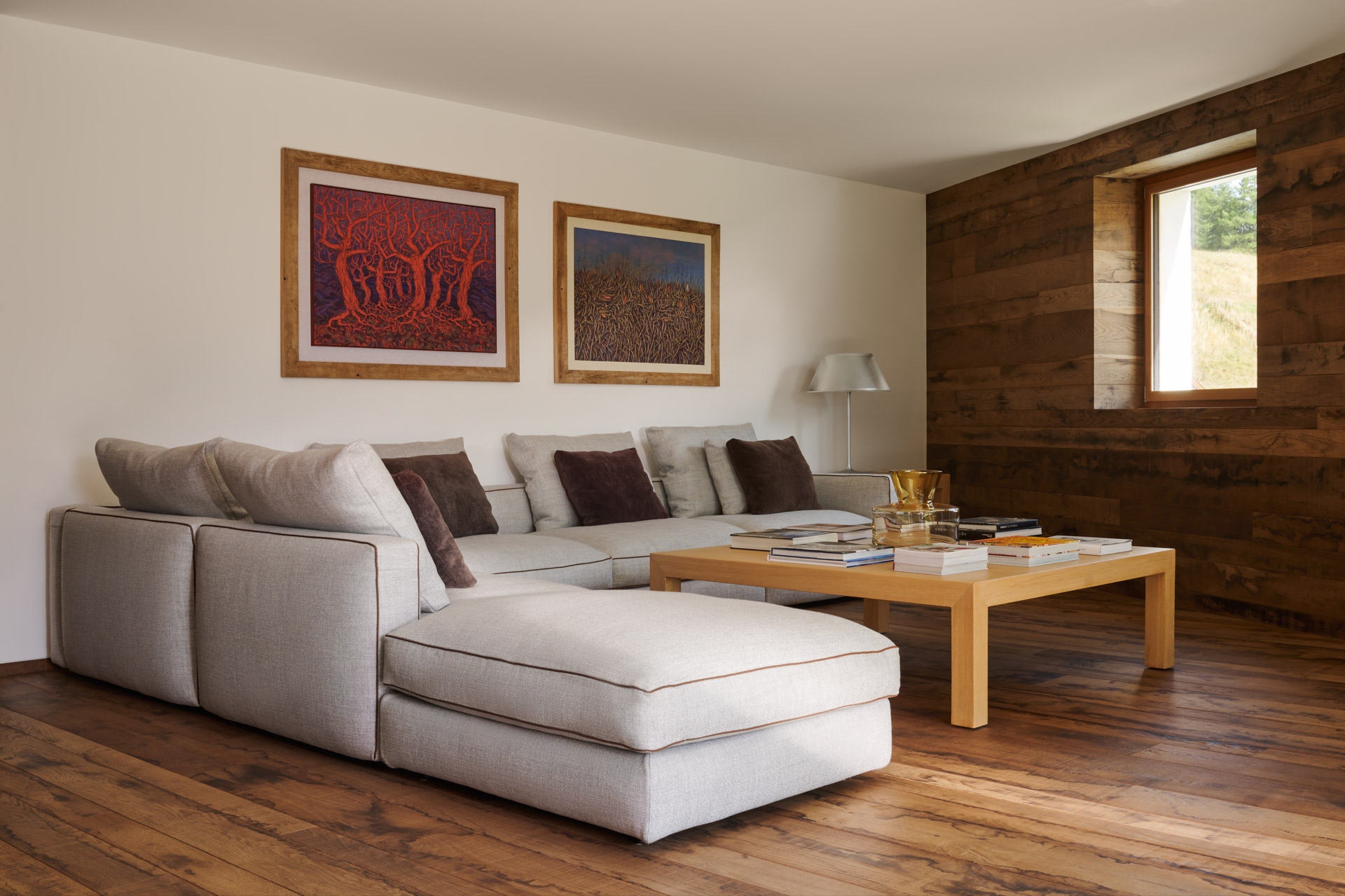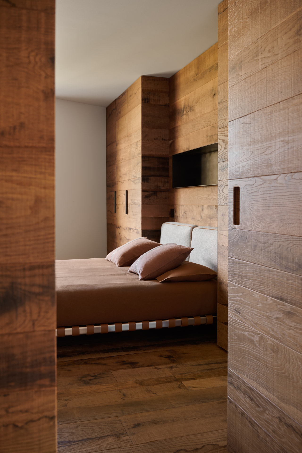 The floors, paneling and custom furnishings are all made of first-patina stained oak, a choice that speaks to tradition, yet is reinterpreted in a minimalist, contemporary manner.