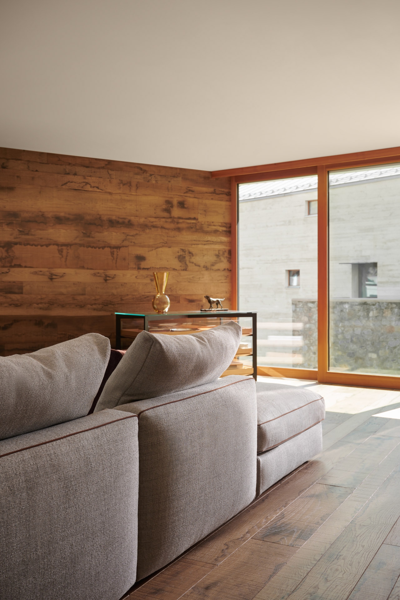 The facade is made of a particular kind of cast concrete that changes color depending on the weather and season, while the windows, doors and shutters are made of bronze and larch.