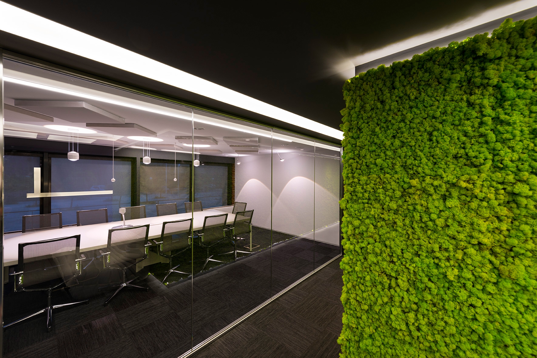 On the Ground floor the dark woven vinyl floor in all areas takes center stage. The walls, the false ceiling at the entrance and the main corridor leading to the main Conference Room, are in the same dark grey color, giving the illusion that we are inside a grey box. All the above create a unique background for the “all in white” existence of the furniture and the lighting. At the center of the plan the main volume is covered externally with moss. Inside you can find a storage room and a staircase leading to the mezzanine. The vertical garden in “wasabi” color, in combination with the dark grey and the white elements, are specifically designed to improve the working environment. The two meeting rooms running alongside the moss wall, are separated from the corridor by transparent walls/partitions consisted of steel frame and glass.