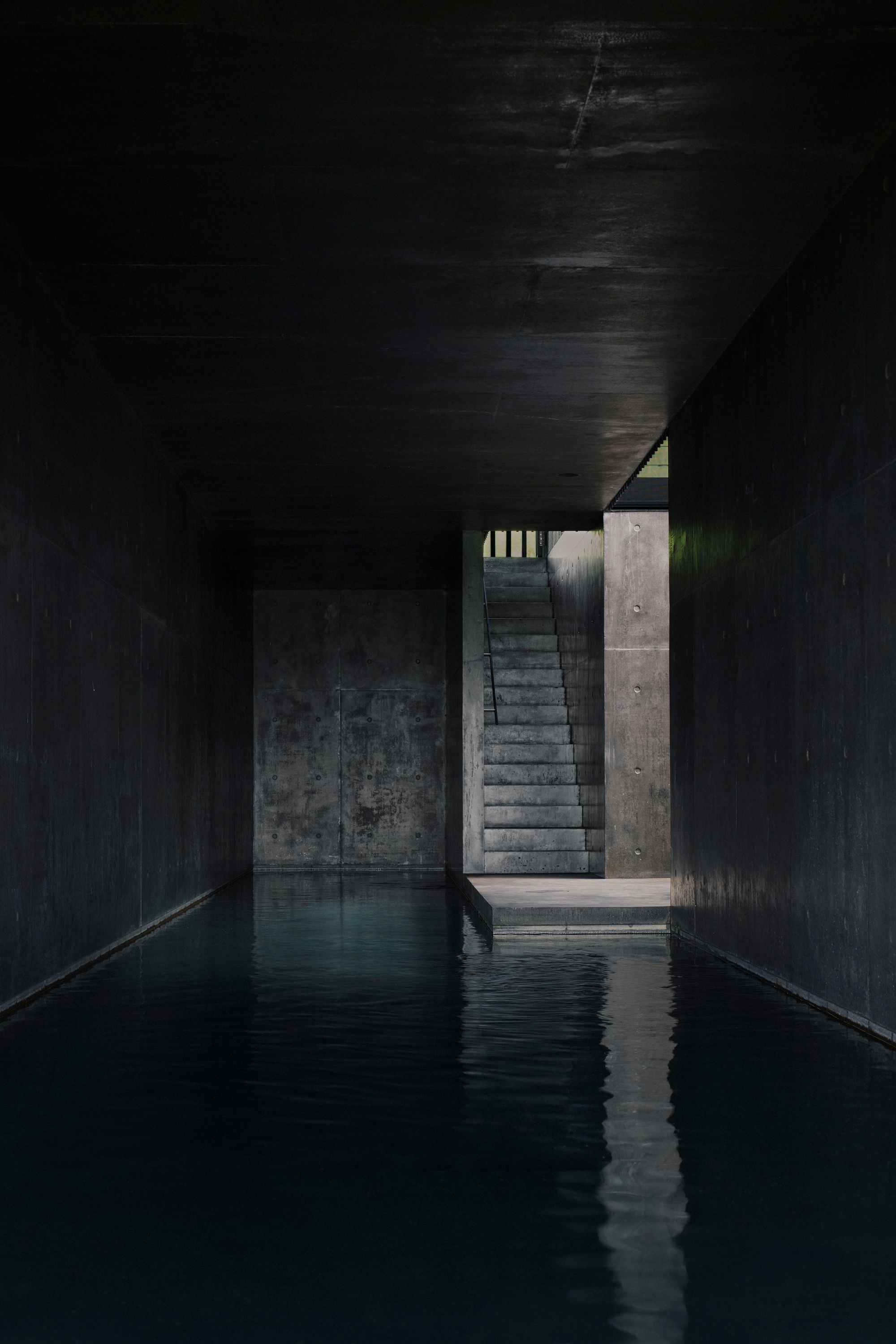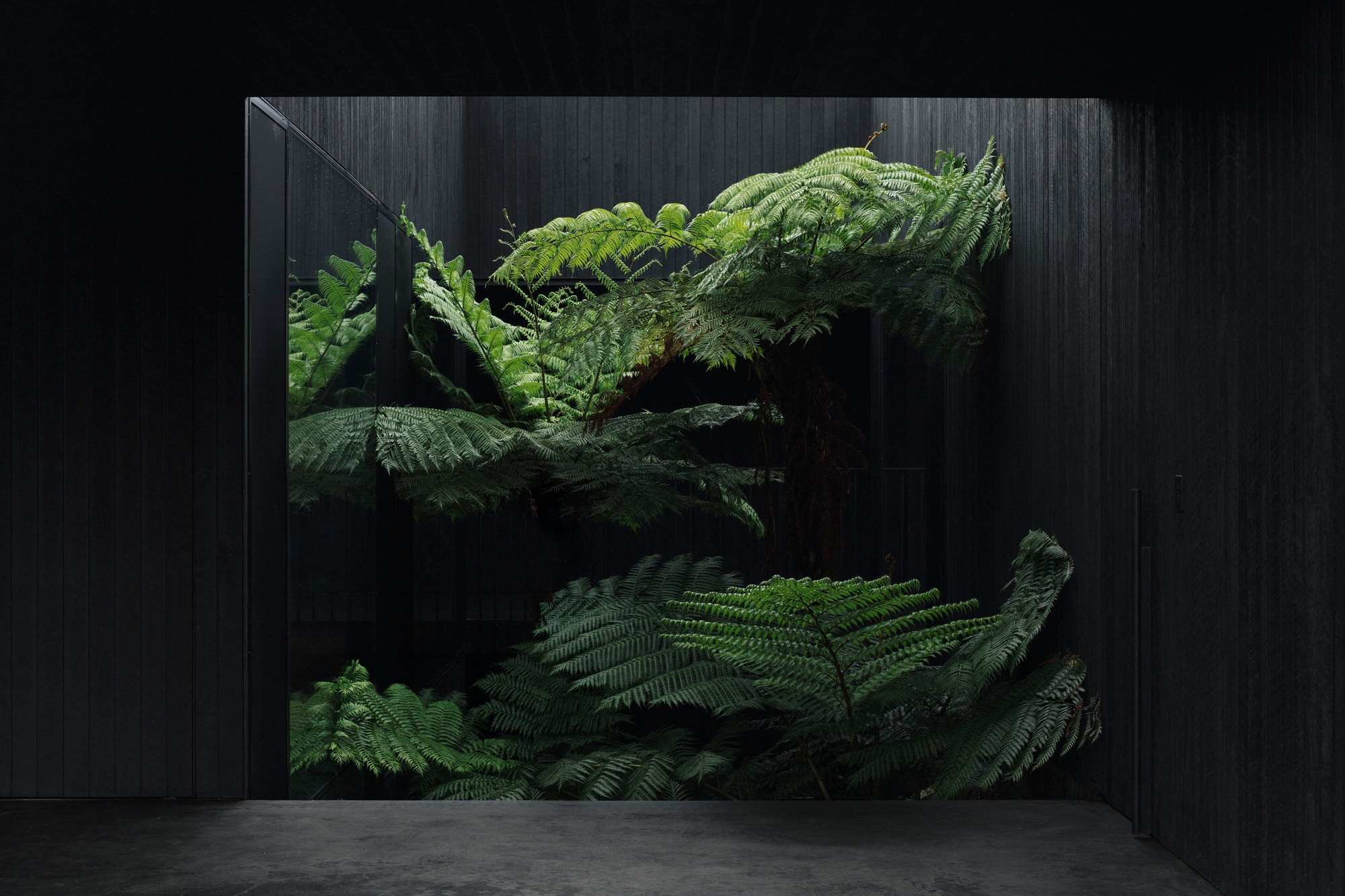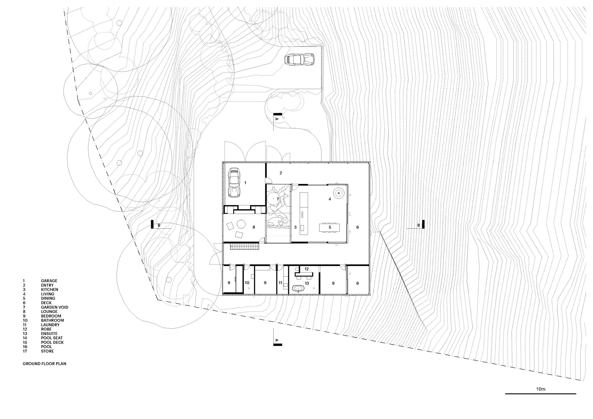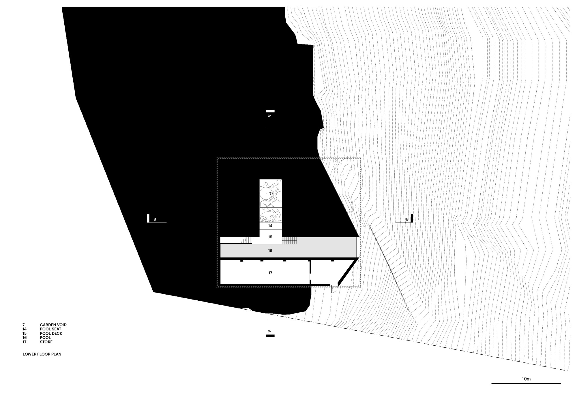 Anchoring the project beneath the upper platform is a subterranean pool, linked to a planted void in the heart of the home. On entry, this void allows a glimpse through ferns to the still body of water beneath. Alternate to the expanding upper level, the descent into the pool void reveals an intense interiority, the lighter upper materiality giving way to heavy mass, grounding the building and bringing with it a heightened sense of place. On entering the water, the building becomes an instrument for the phenomenological. The mirrored horizon at the end of the pool draws one to its edge, and back again to the garden platform, its cavernous volume resembling a more closely freshwater swimming hole than a classic lap pool. Discussions with the client which drew from texts byZumthor, Tanizaki, and Pallasmaa, allowed the journey into this atypical condition and they must be applauded for venturing into the unknown here.