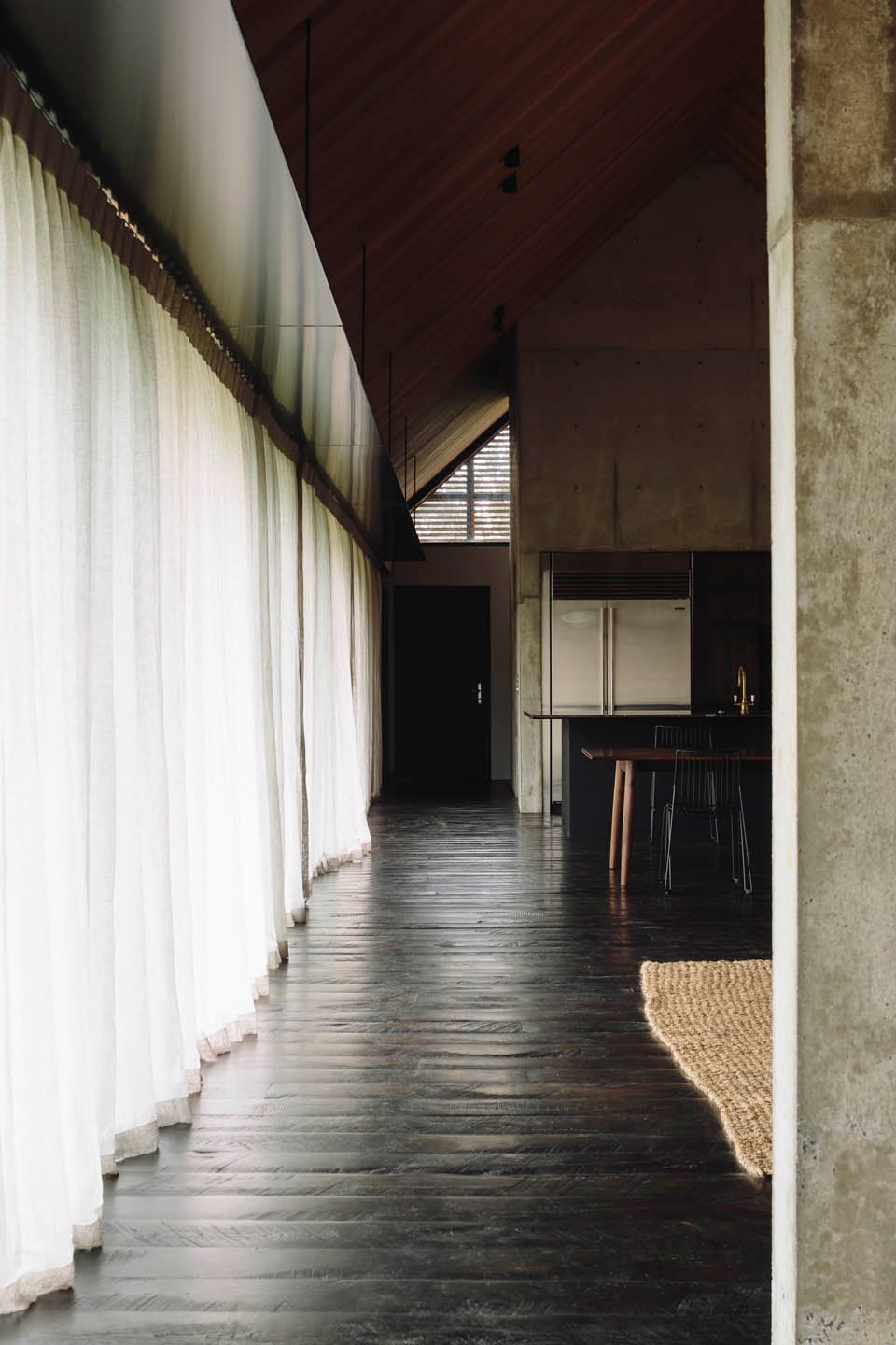 While there are some very large and rustic elements, there is a fineness and a lightness to the enclosure and layering of it. The slatted shutters can be closed to make interior spaces warm and intimate, or opened up to allow in the light that moves from north to west. Exterior shells of native timber boards and shingle roof are founded over cast in situ concrete masses, bracketing the interior spaces within and adding a weight and strength to the voluminous interiors. The roof form and materiality allowed us to develop a strong sense of continuity between the separate buildings.