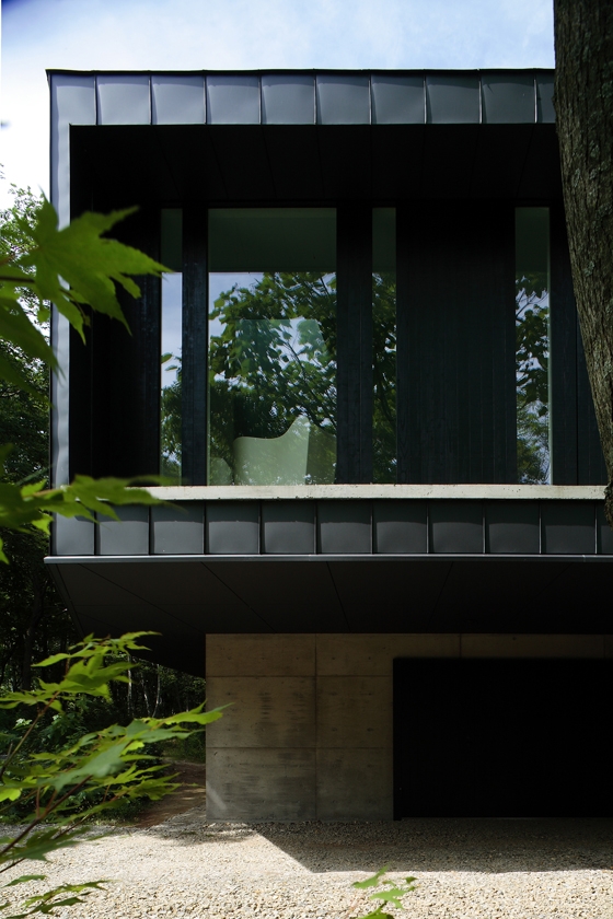 This small residence is built in Kitahiroshima City, right next to Sapporo, the capital city of Hokkaido. The building is located on the edge of the residential area, where the front road is still unpaved, with very little traffic. About the size of 300 square meters, the premises with large trees almost look like a part of the surrounding forest, since the land merges into the controlled woods area with the shape like a cape. The client desired to have a residence where he can strongly feel the essence of surrounding forest. By looking through the limited opening, we thought that the client could have a deeper relation and feels closer to each tree he looks at in his daily life, rather than looking at them vaguely through the wide opening. As he moves his positions inside the building, the tree he would see through the slit window changes one to another. Among all the trees in the woods, only the certain trees will be selected to be seen because of these slit windows. Specific spot to see the specific tree would be created inside the building, according to the location of the tree; specific tree such like the tree with red fruit, the tree with beautiful shaped leaves, the tree squirrels come often, etc. On the first level, combining the entrance, there is a hobby room (client’s hobby; automobile tune-ups), where the glass-boxed stair hall stands reaching the skylight located in the center of the building. On this large glassed box, reflection of virtual imagery from the forest appears with the light through the skylight. We wanted to create the new relationships between internal and external by using the comfortable complexity that can be found in the forest; the complexity brought by the interaction from different characters of light and shadow, virtual and real scene. The accumulation snowfall in this area reaches 6 meters for a single winter. The form of this building was derived naturally from the climate of Kitahiroshima, and also legal restriction. It is formed to avoid the problems of frozen/melt from snow accumulation, to keep enough space for snow deposit falling off from the roof, to reduce snow-removal area, and to meet the wall retreat distance regulation.