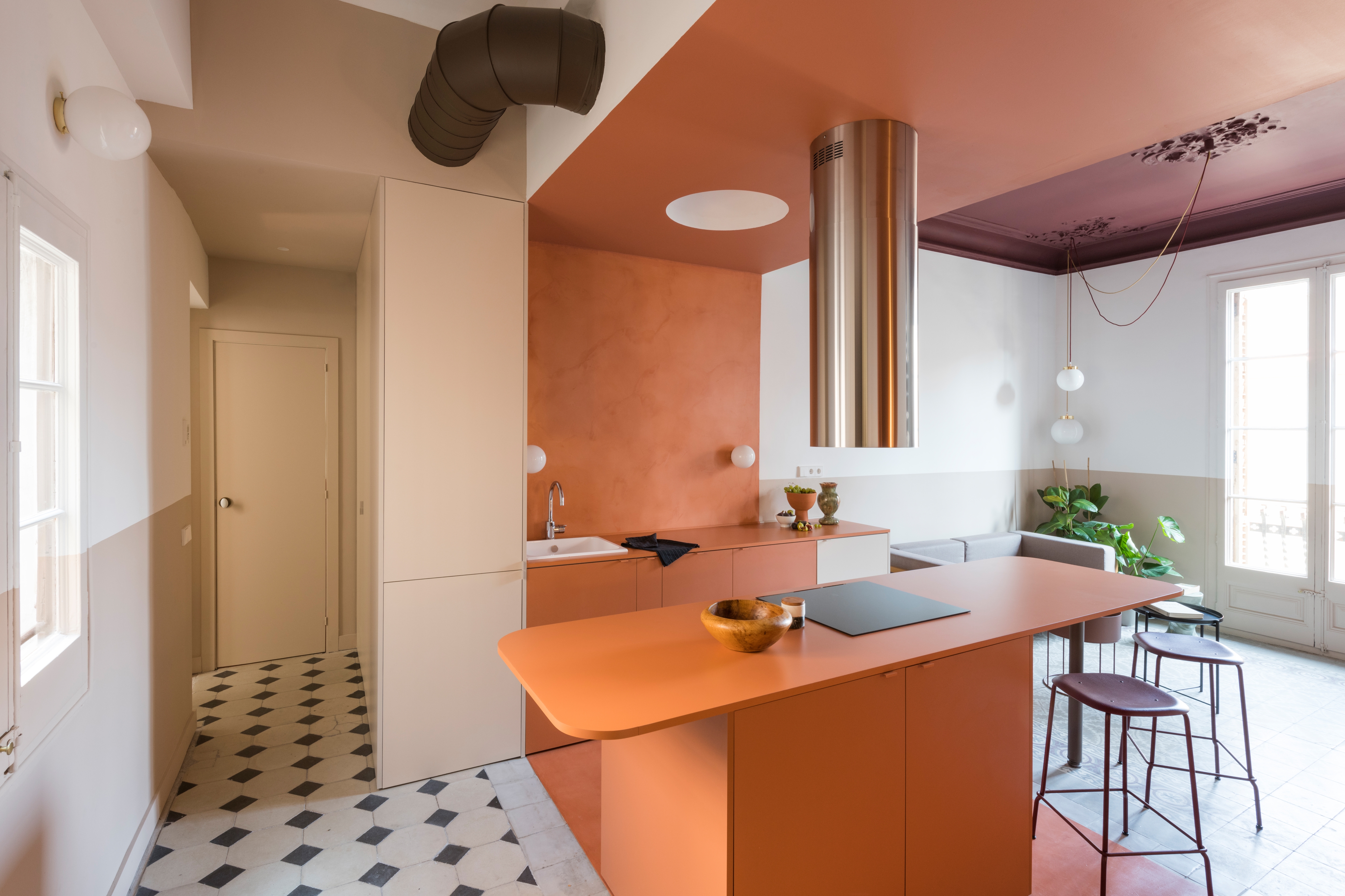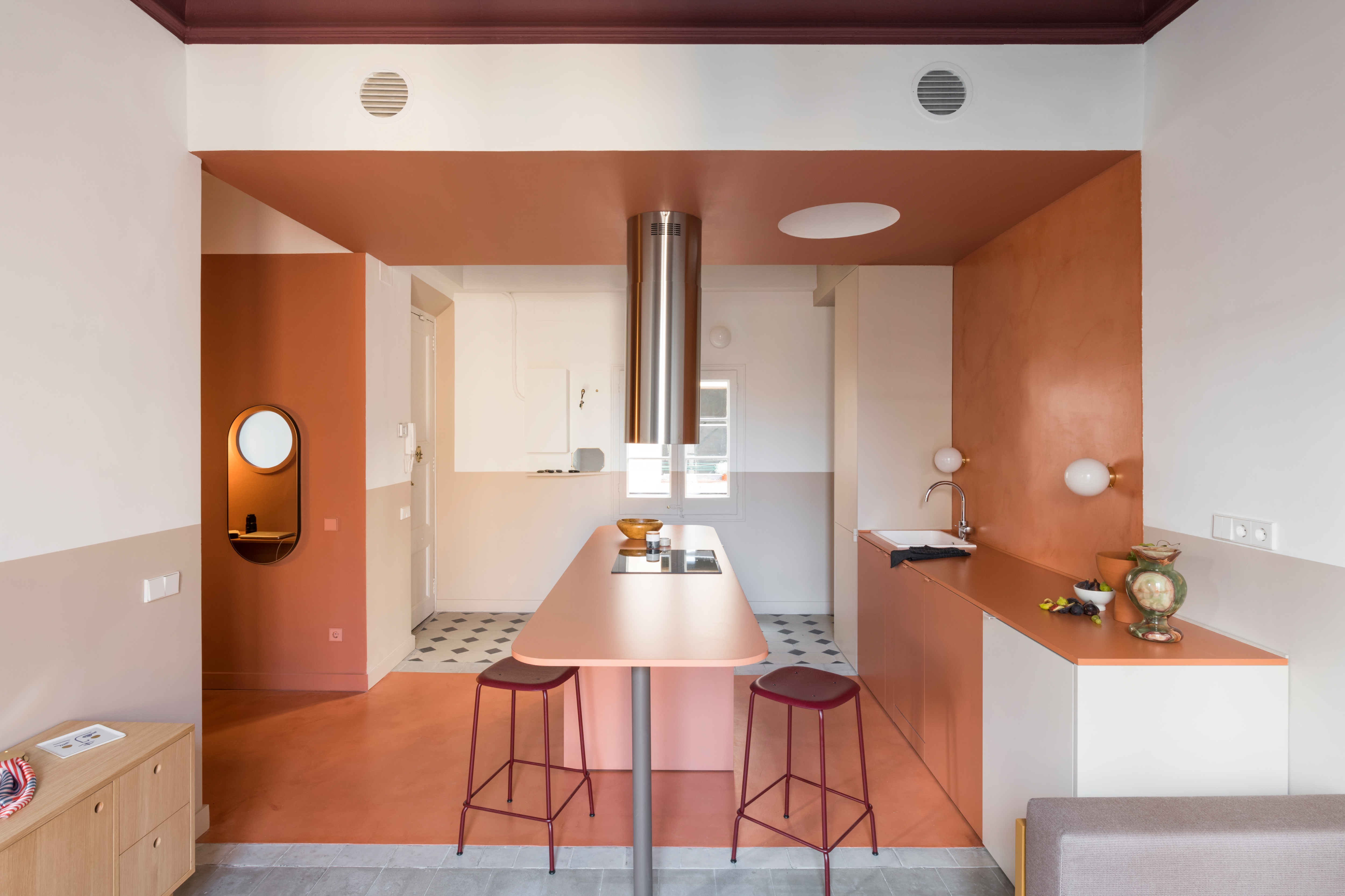 To create this distinct area, the architects decided to dip the whole space in a rich terracotta colour, including the recessed area that will be use as a quiet studio corner. The whole ceiling area above the kitchen was dropped, disguising the beam and the air conditioning ducts. Micro-cement floor of the same hue cover three different types of tiles (the least interesting ones), unifying the block and highlighting the adjoining floors, of greater value, of entrance and living room. The same earthy tone is used for the micro cement backsplash wall, the ceiling, the kitchen cabinets including the long, roundedged central island, as well as for the studio area, desk and shelves. The result is a colour-block area that makes a distinctive statement at the core of the apartment.