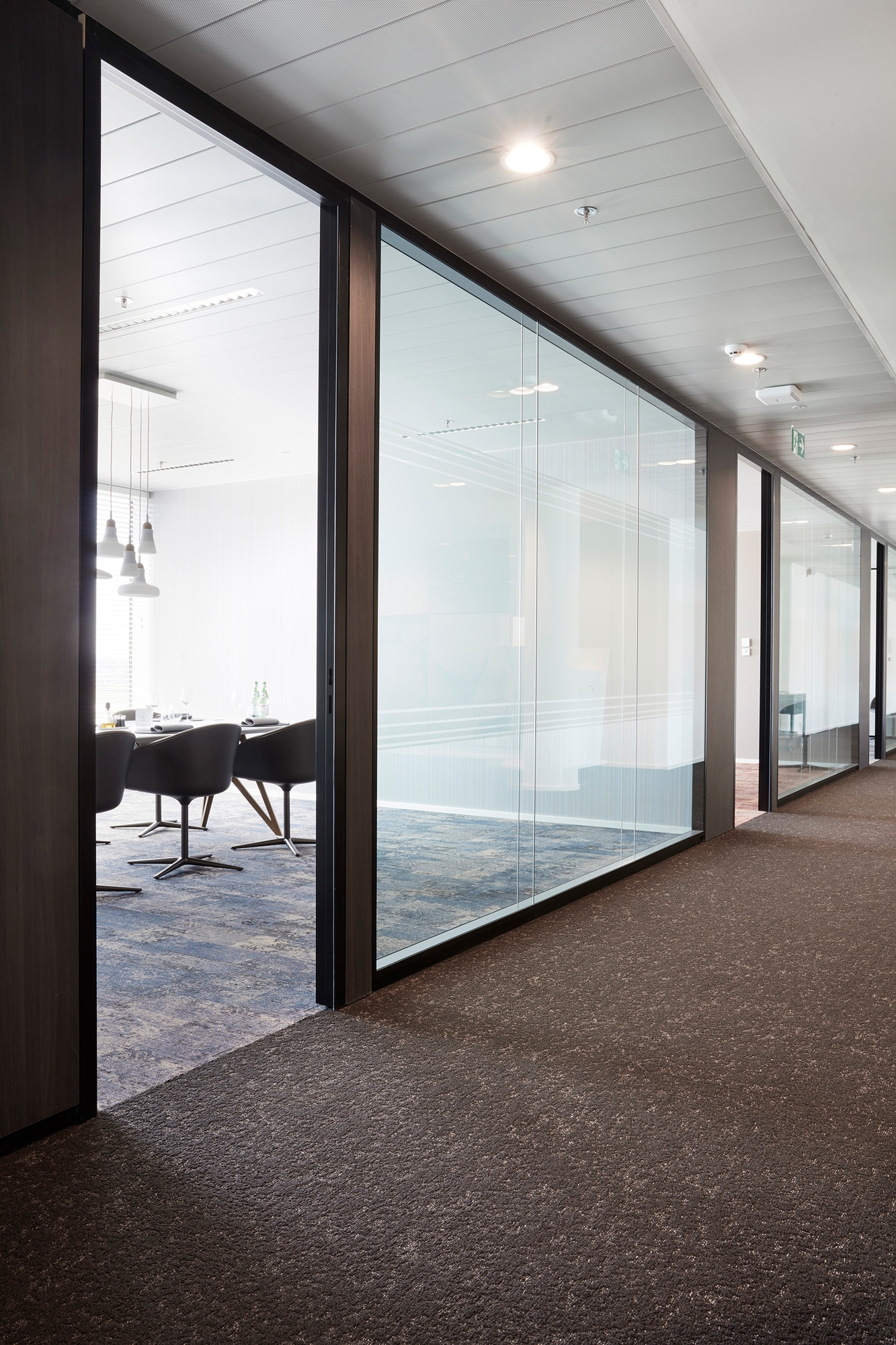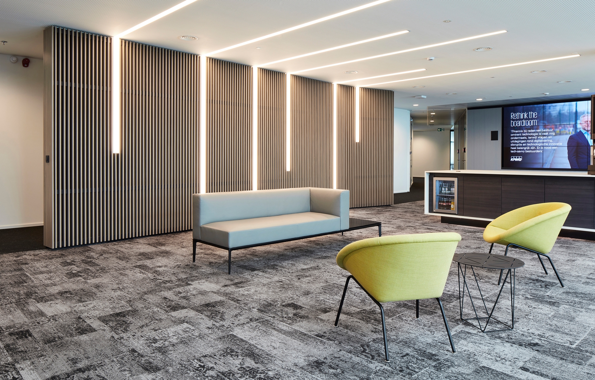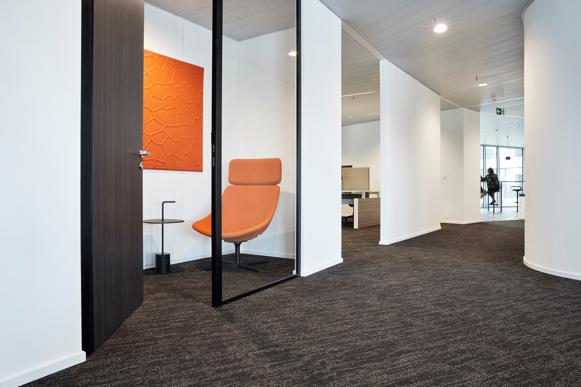 Contrary to their previous workspace – a classic American-looking environment with fragmented offices, insufficient light and blue carpets – the new space had to be open and sustainable. “We wanted to create a domestic business environment using sustainable materials,” Ingrid Sitters, Facilities Director at KPMG Belgium, elaborates. On the 4th floor, acting as a meeting place for KPMG’s clients and partners, an eyecatcher was required. This ultimately resulted in an unexpected, but intriguing, mix & match of carpet tiles.