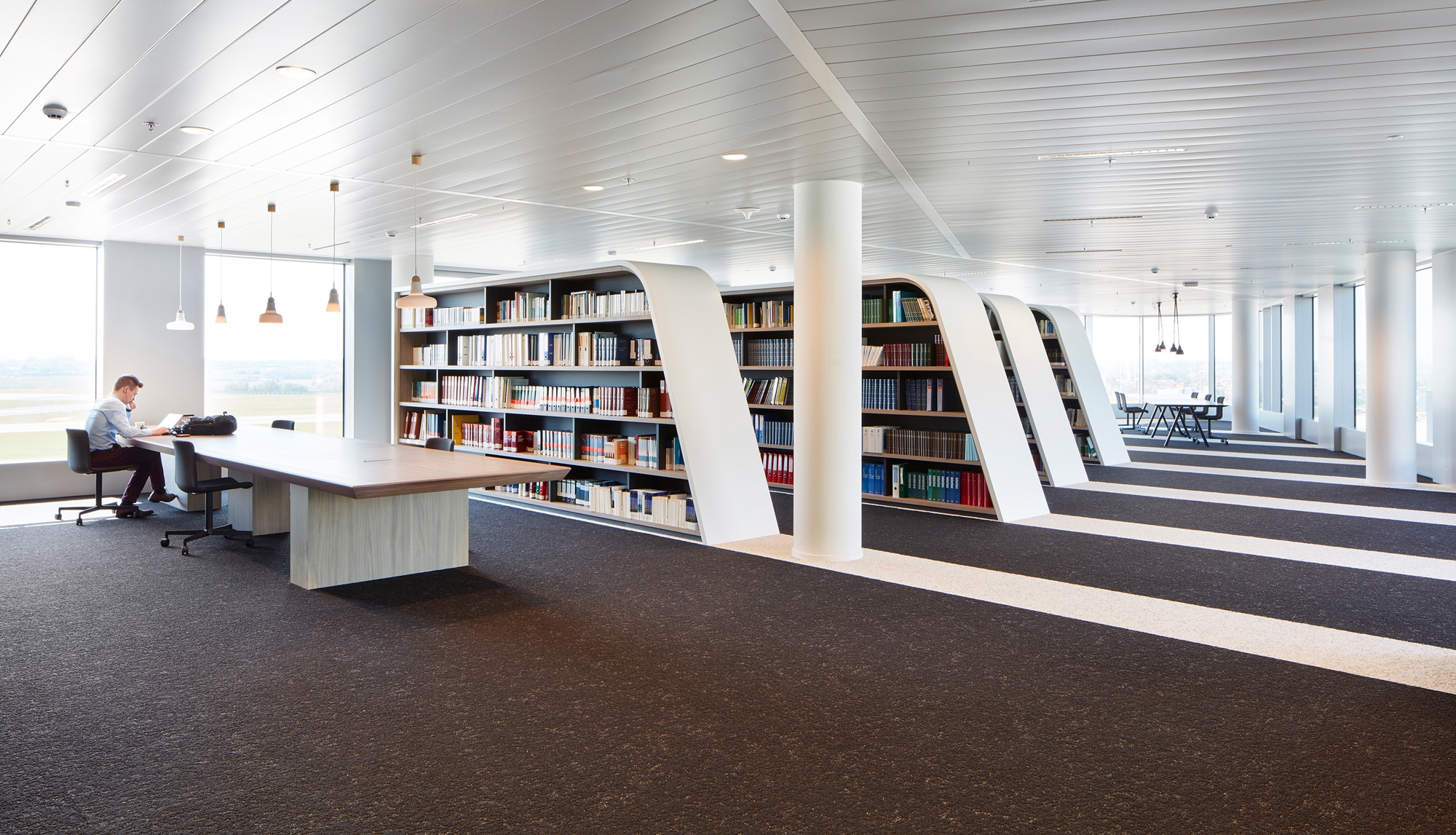 When Jaspers-Eyers Architects proposed a biophilic design that complemented the PassPort building, interior designer Natalie Schoonjans was tasked with developing the concept, using sustainable materials. Her idea was to make a fluid transition between three modulyss carpet tile collections – Moss, Leaf and Willow – that would run dynamically along the curved lines of the building. These three patterns, part of the Handcraft collection, explore the relationship between nature and craft in an organic design bringing earthy tones. Each design differs a little from the other, and can thus be combined in a perfect textural puzzle. “At KPMG,” Ingrid Sitters explains, “we opted for a calmer pattern around the workstations, and a more intricate texture for the aisles.”