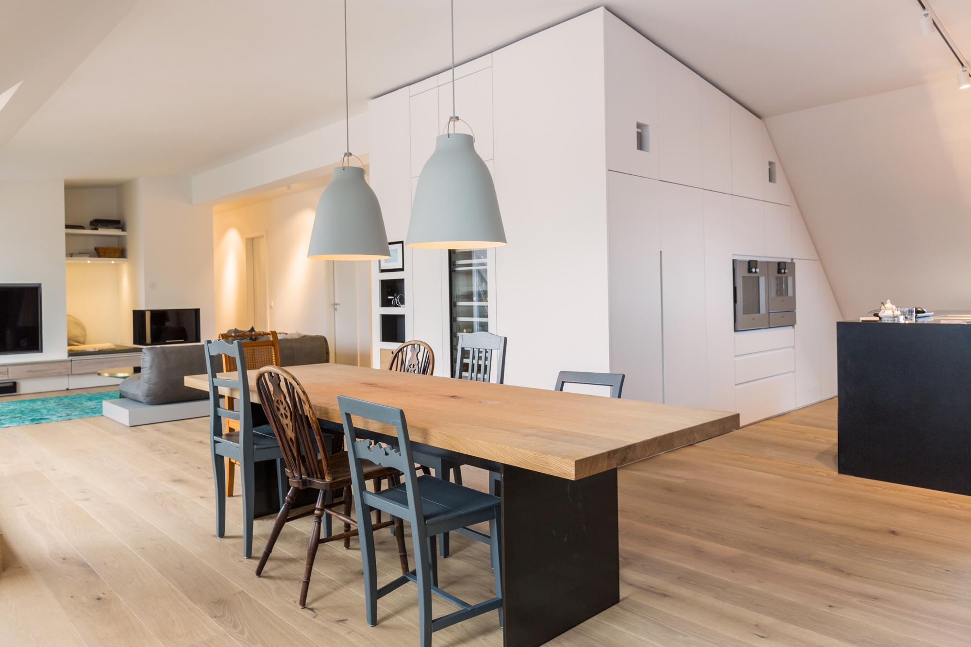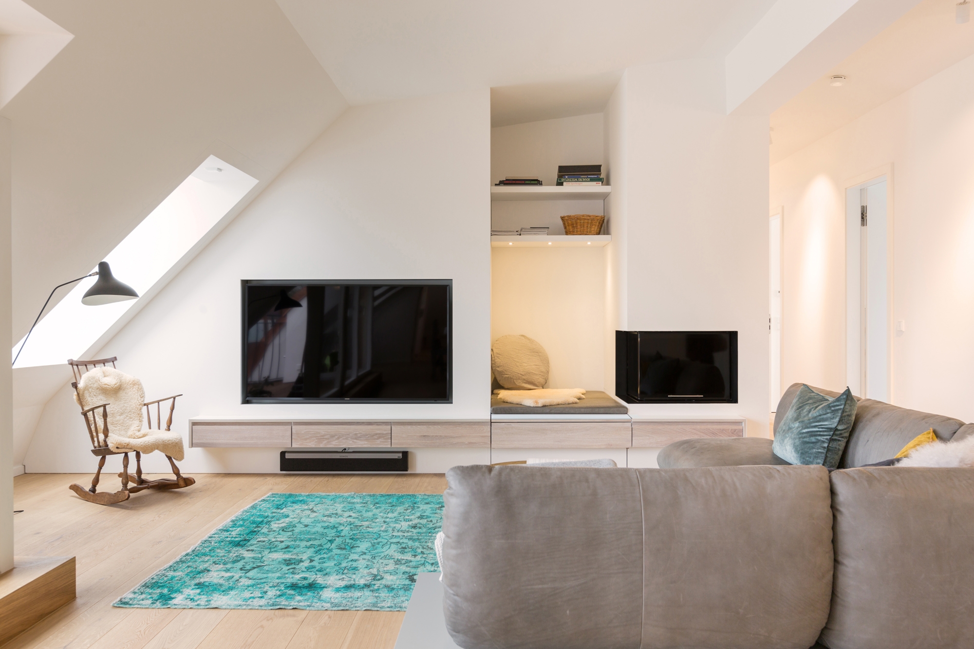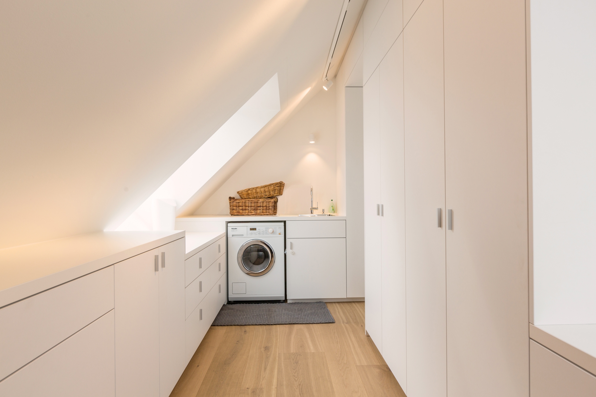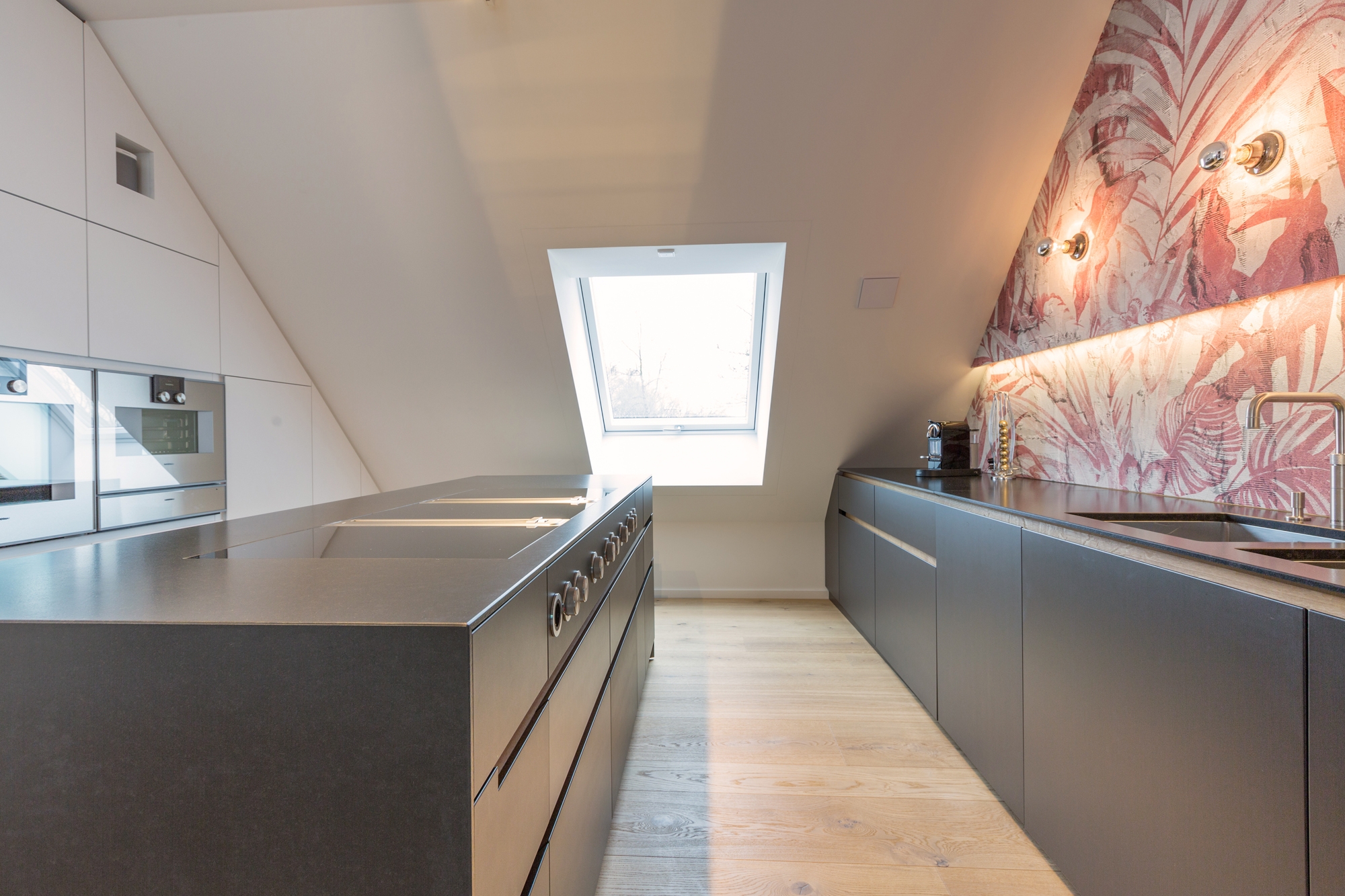 From start to finish - from optimizing the floor plan to the complete apartment. What emerged is an integrally designed penthouse with some exciting highlights and likeable details. The striking wall paper at the sink row contrasts with the black and white kitchen whose cabinet unit "round the corner" becomes the wardrobe. Behind the open dressing room hides the parents' bedroom with the incorporated chief bathroom and the unexpectedly designed WC. The nursery is a special realm for playing and sleeping.