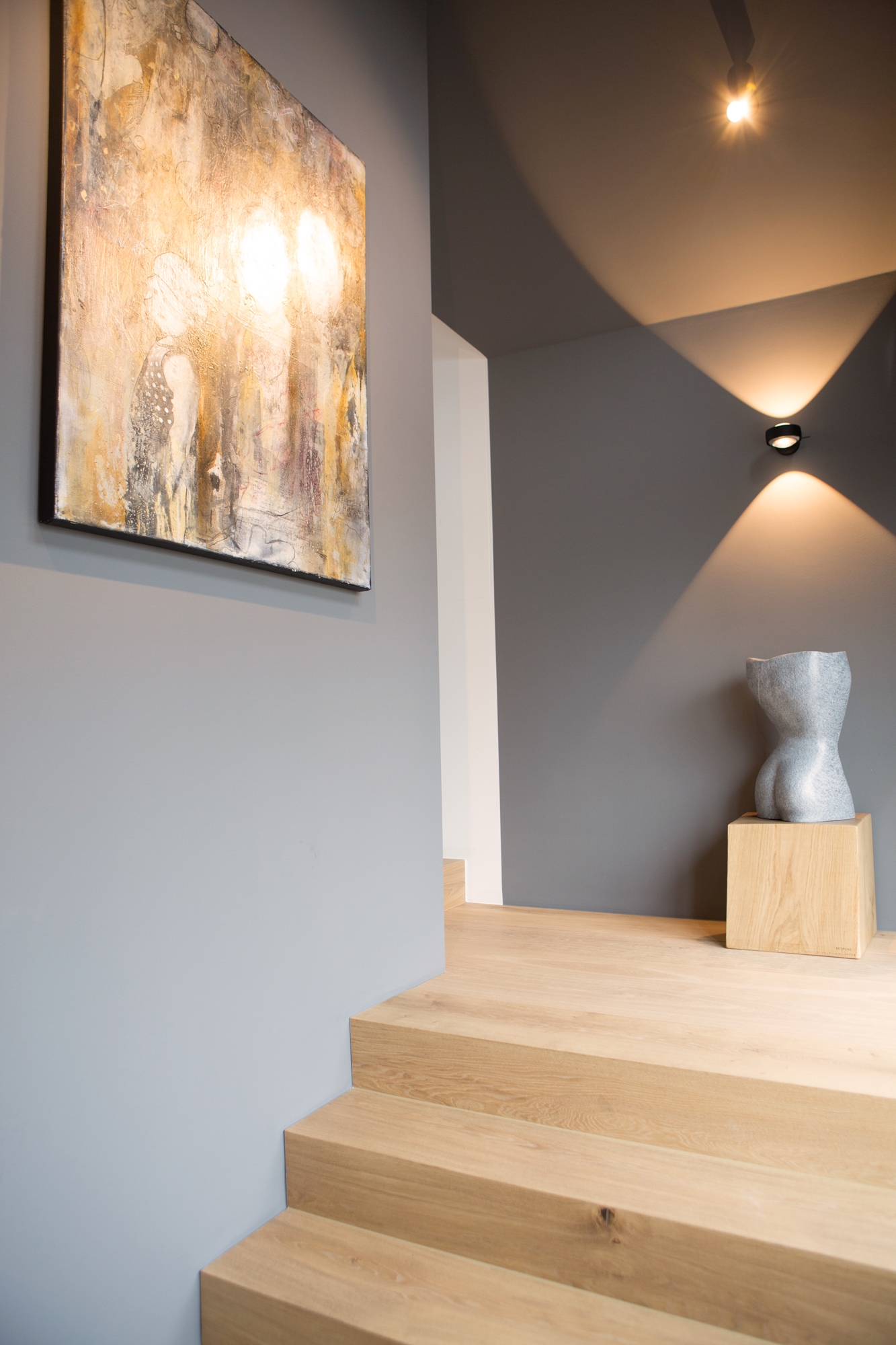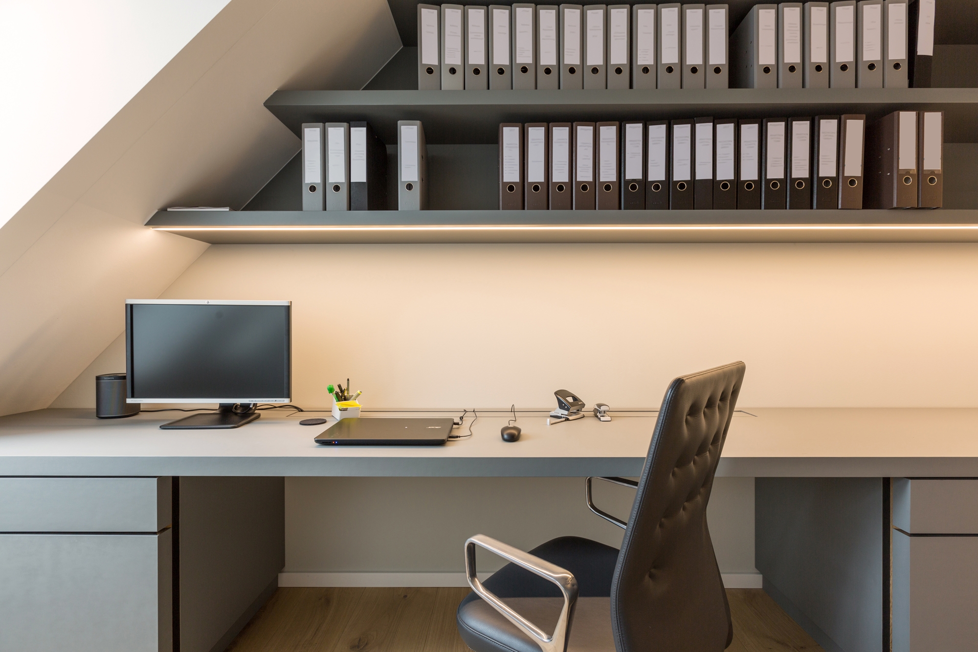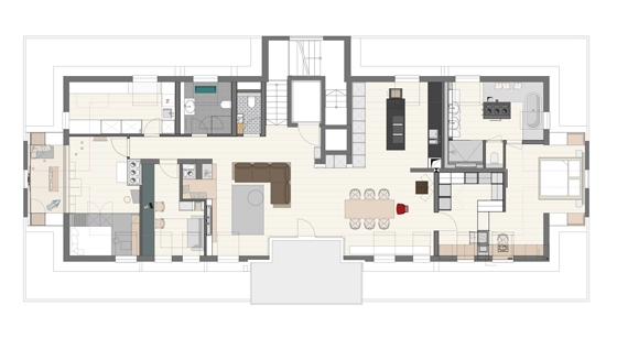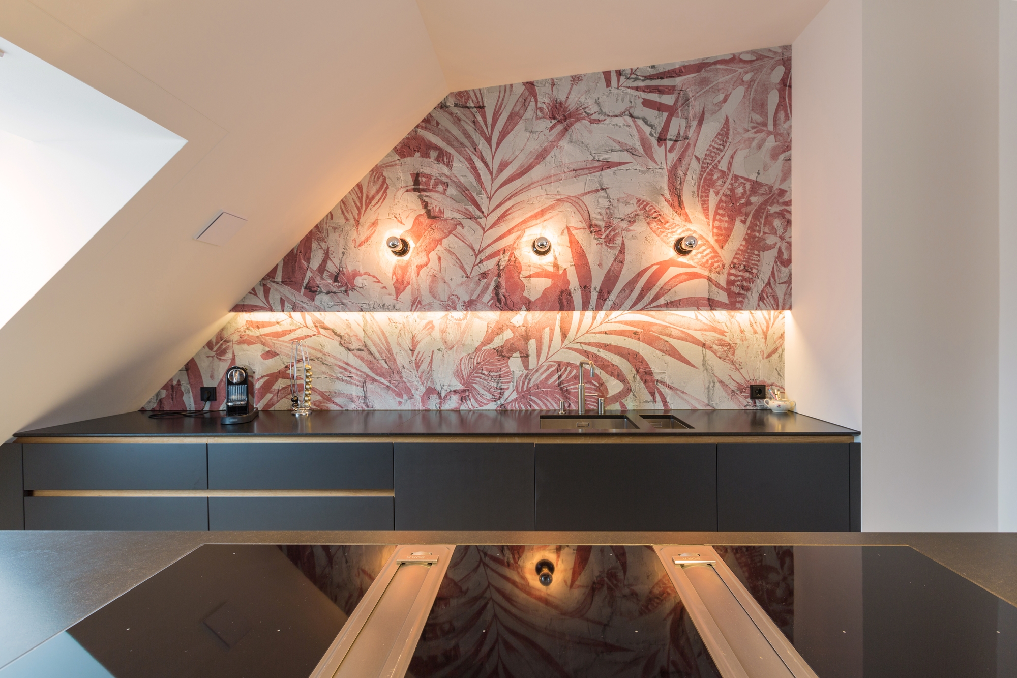 From start to finish - from optimizing the floor plan to the complete apartment. What emerged is an integrally designed penthouse with some exciting highlights and likeable details. The striking wall paper at the sink row contrasts with the black and white kitchen whose cabinet unit "round the corner" becomes the wardrobe. Behind the open dressing room hides the parents' bedroom with the incorporated chief bathroom and the unexpectedly designed WC. The nursery is a special realm for playing and sleeping.