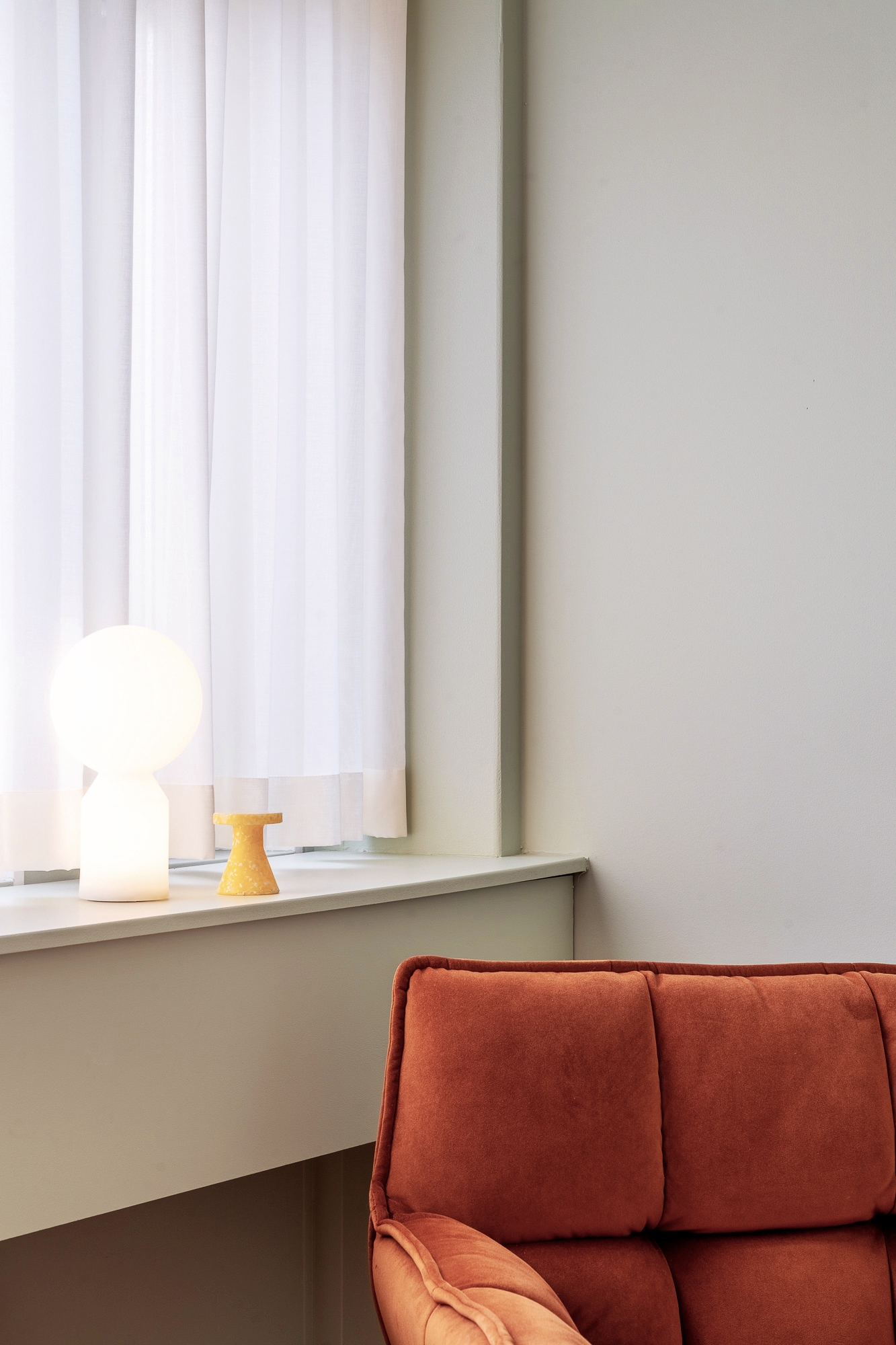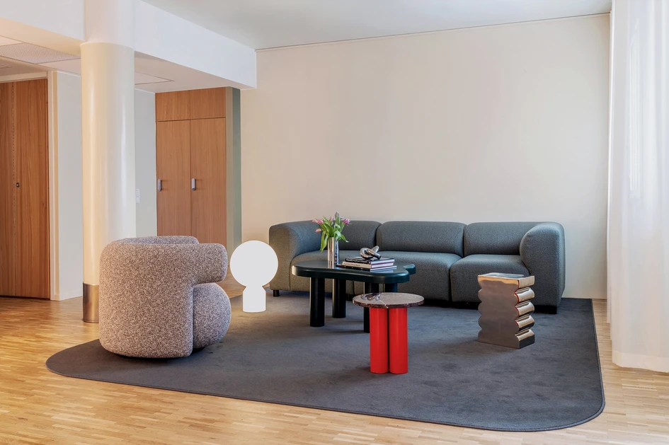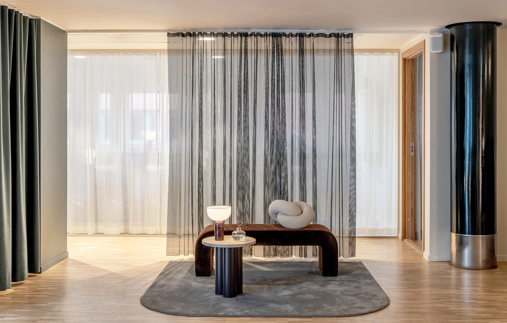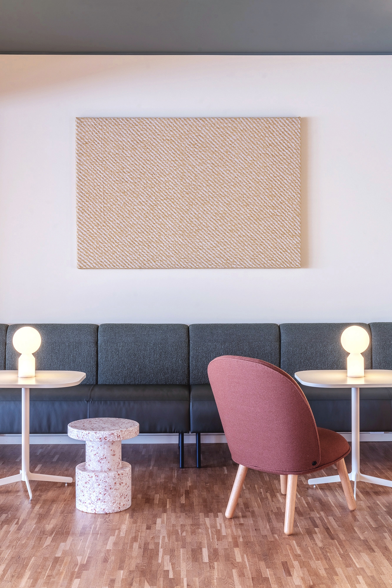 An office for the tech company Roaring in Stockholm. The palette is derived from their graphical identity, with different nuances of green and splashes of contrasting colours. The extensive space is partially divided by exclusive textile and decorated with a mix of high end design and more affordable and upcycled pieces of furniture.