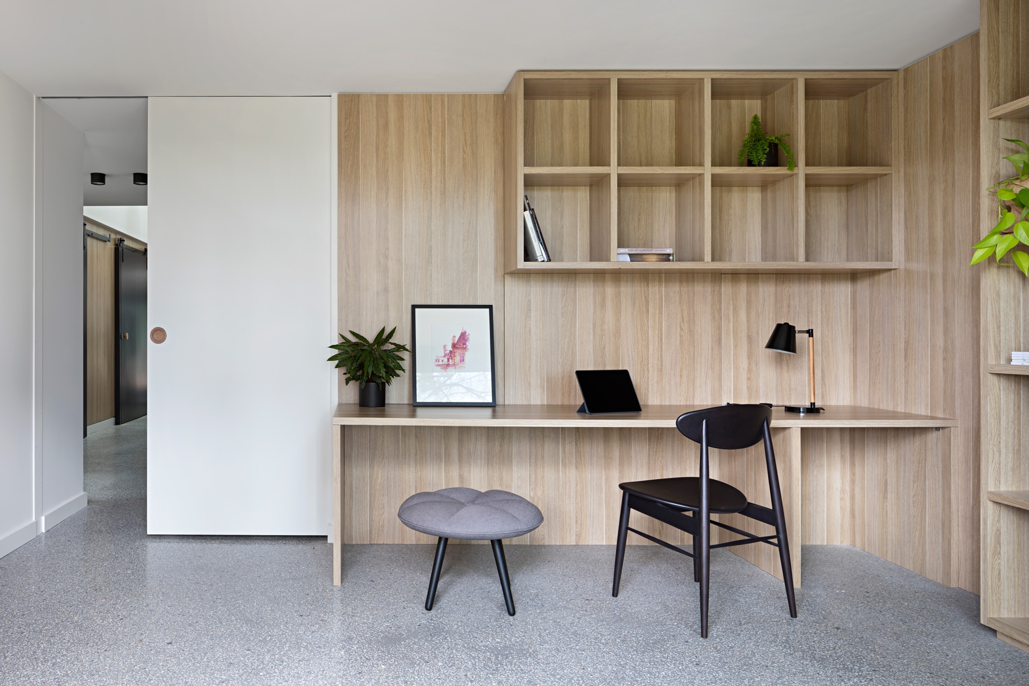 • Music room and TV pit: The music room, with an oversized door opening was designed to feel like part of the open living space. Utilising the existing split level in the room, a TV pit was created in the music room with the entertainment cupboard hidden behind the oversized sliding door (to hide all the clutter). The kids would have to shut the door in order to watch TV. And the parents could enjoy their peace and quiet. Killed two birds with one stone!