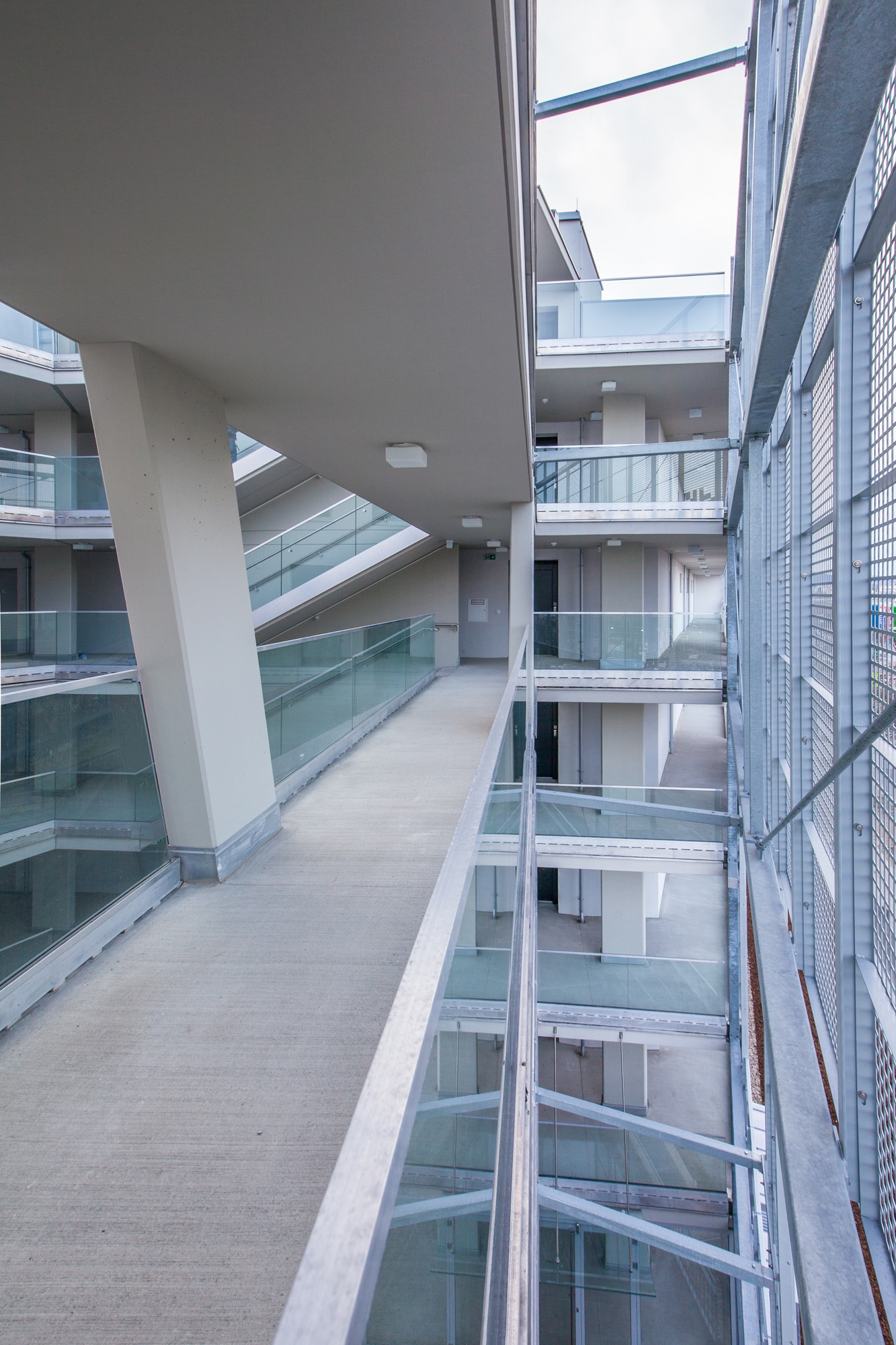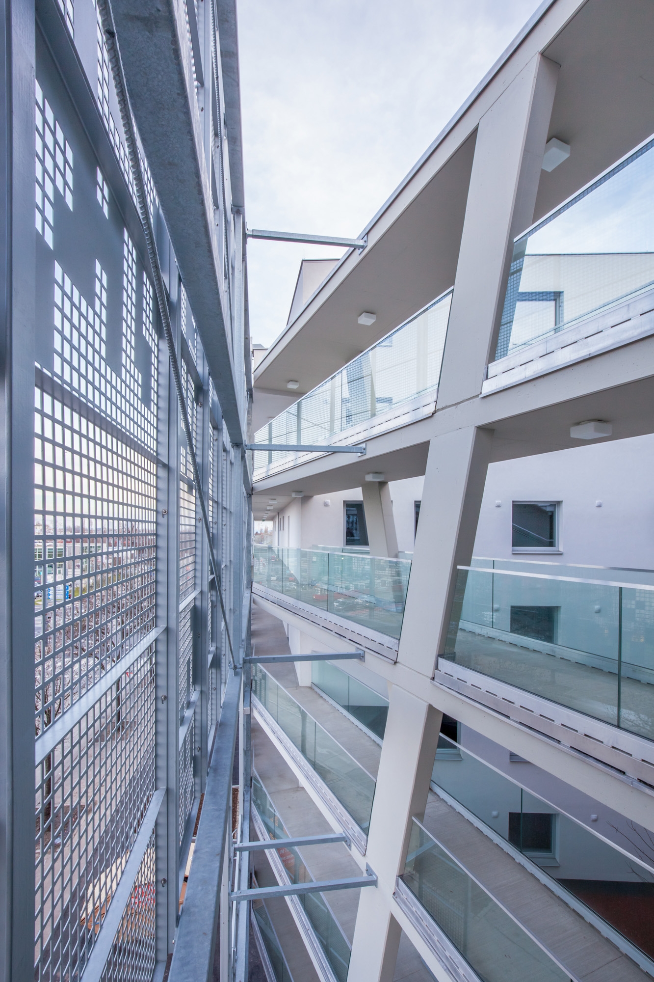 The project has a differentiated system of meeting and communication rooms with varying degrees of privacy, for example community rooms and a community kitchen. The development scheme of spatial connectivity results in small and easy to manage neighborhoods. The large diversity of free spaces strengthens the identification of the inhabitants with their residential complex. Additionally, the integration of the lower social groups in the managed apartments on the ground floor furthers the building of the community spirit and reduces prejudice.