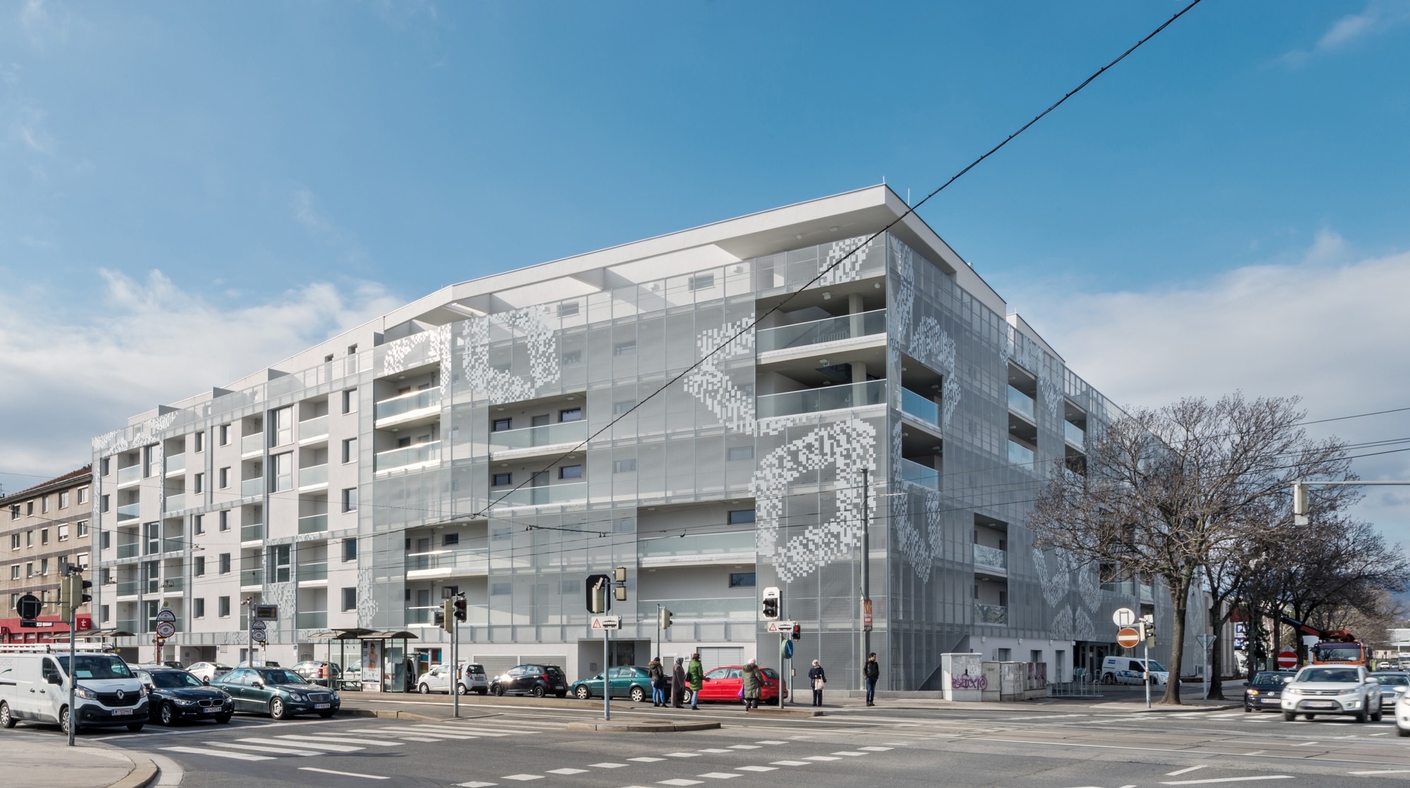 The property is located on a very busy intersection. An intervention in the existing building use class made possible better light and sun exposure conditions. In order to defuse the “T”-point, a V-shaped courtyard has been cut into the building. The paths to the access balcony and the ancillary areas are concentrated around the courtyard. A passage in the East creates a pedestrian connection between Brünnerstraße and a park in the West.