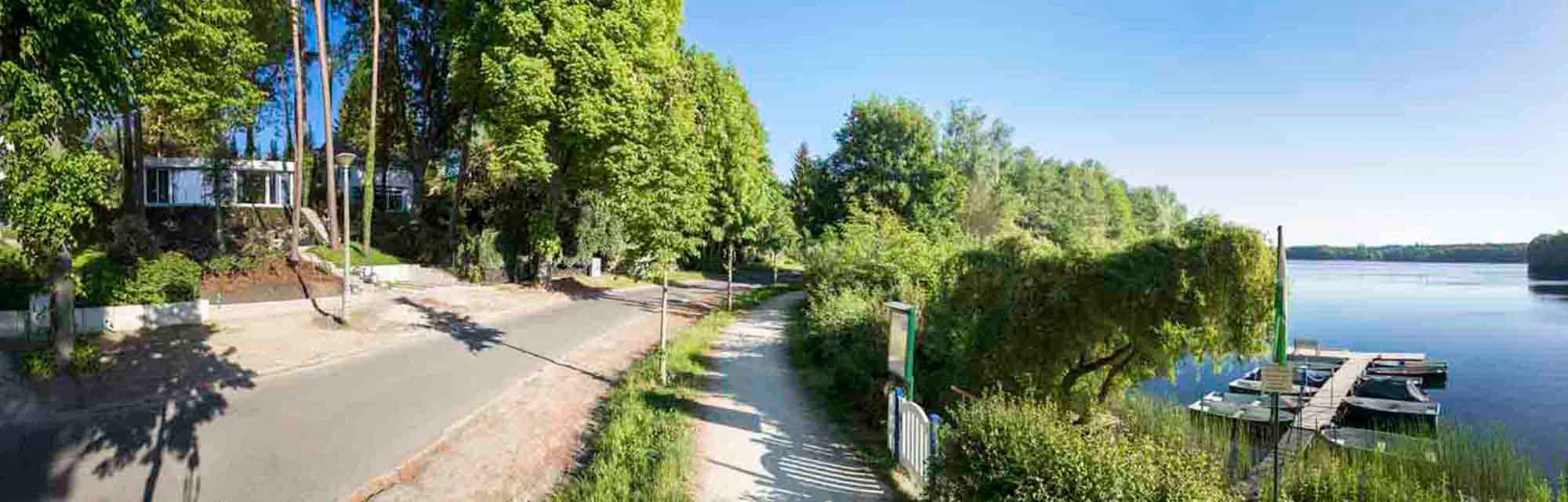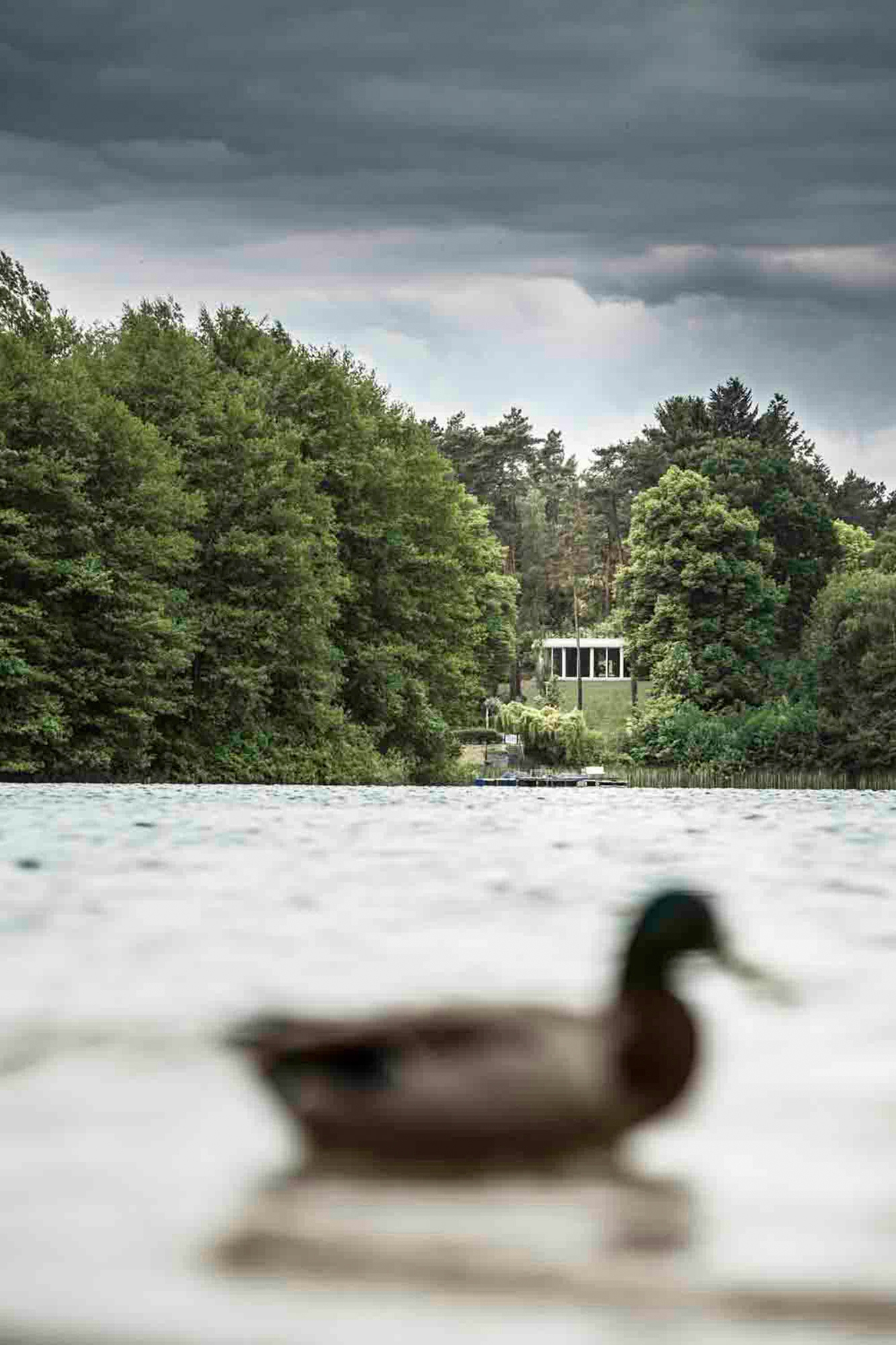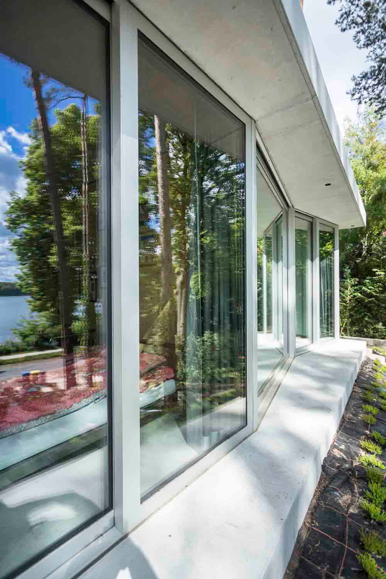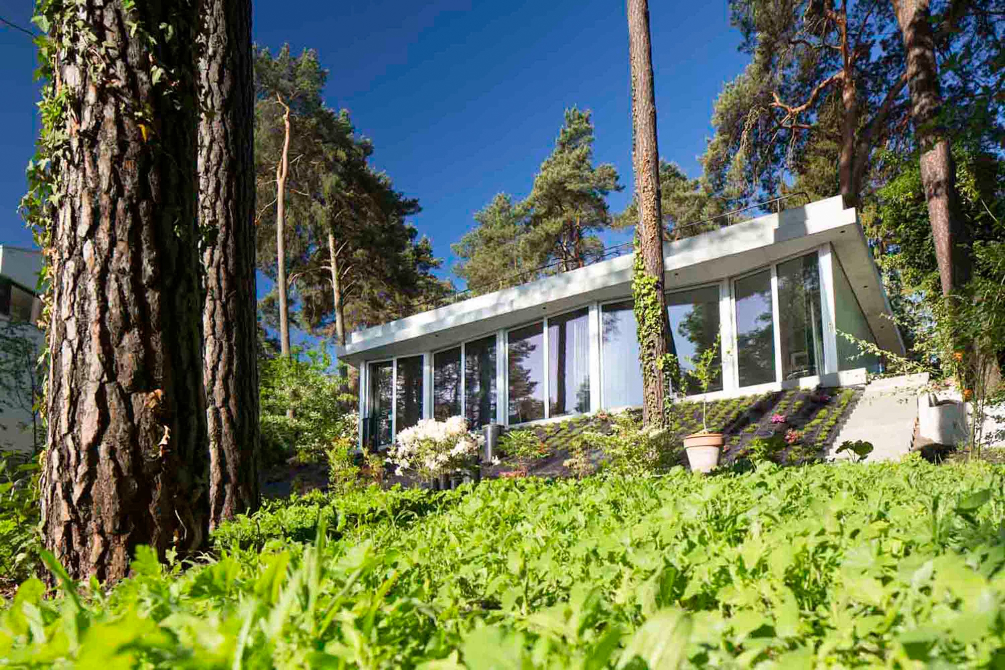 The location and the characteristics of the site could not be more beautiful. The steep hillside plot with its old, protected pine trees arises from the waterside of the Groß Glienicke Lake and offers a divine view. Due to the topographical hillside of the property with the lake situated in the northwest, the architecture deduces its primary functional and design attributes from this special situation.