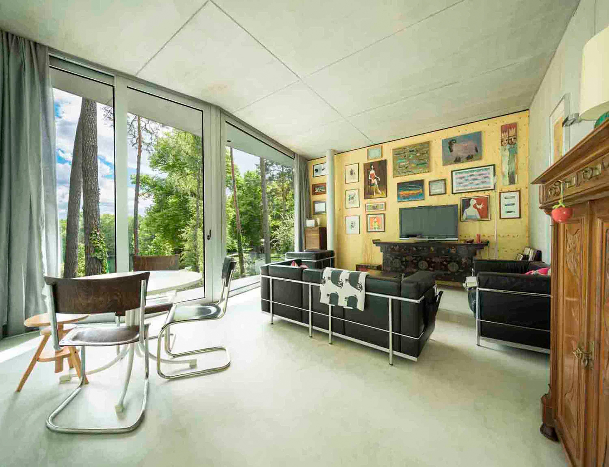 The relatively small building area of 100qm is optimally used through compact space planning and seems generous because of its circumferential glazing. Room high furniture made of Aleppo pine provides besides the bathrooms and the kitchen the storage room needed as well as the space required by the owner’s library. The material of the bright plywood creates a welcomed contrast to the concrete and glass surfaces. The compact interior is contrasted by the spacious roof terrace, which can only be reached through a hidden door inside the furniture wall. The outer space is not visible for outsiders, spans over the whole floor space and offers magnificent panoramic views over lake and landscape. Through the low height of the trapezoidal object and the overhanging roofing slab the architecture is reserved in regards to the landscape and the grown nature. Despite the compact generosity inside and the superb view on the property and the lake, the building constitutes understatement on the outside. With its proportion, chromaticity and scale it blends into the landscape situation.