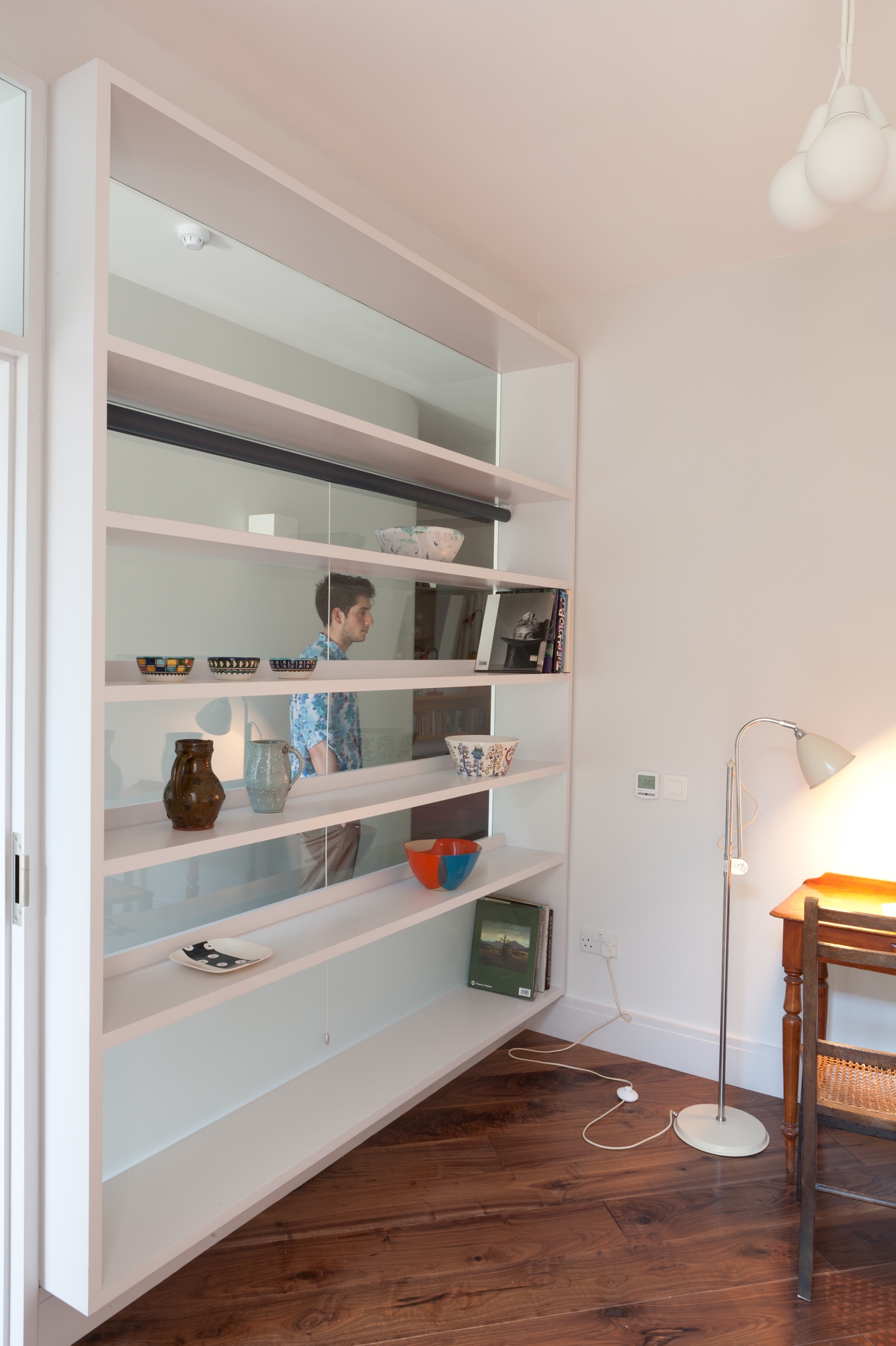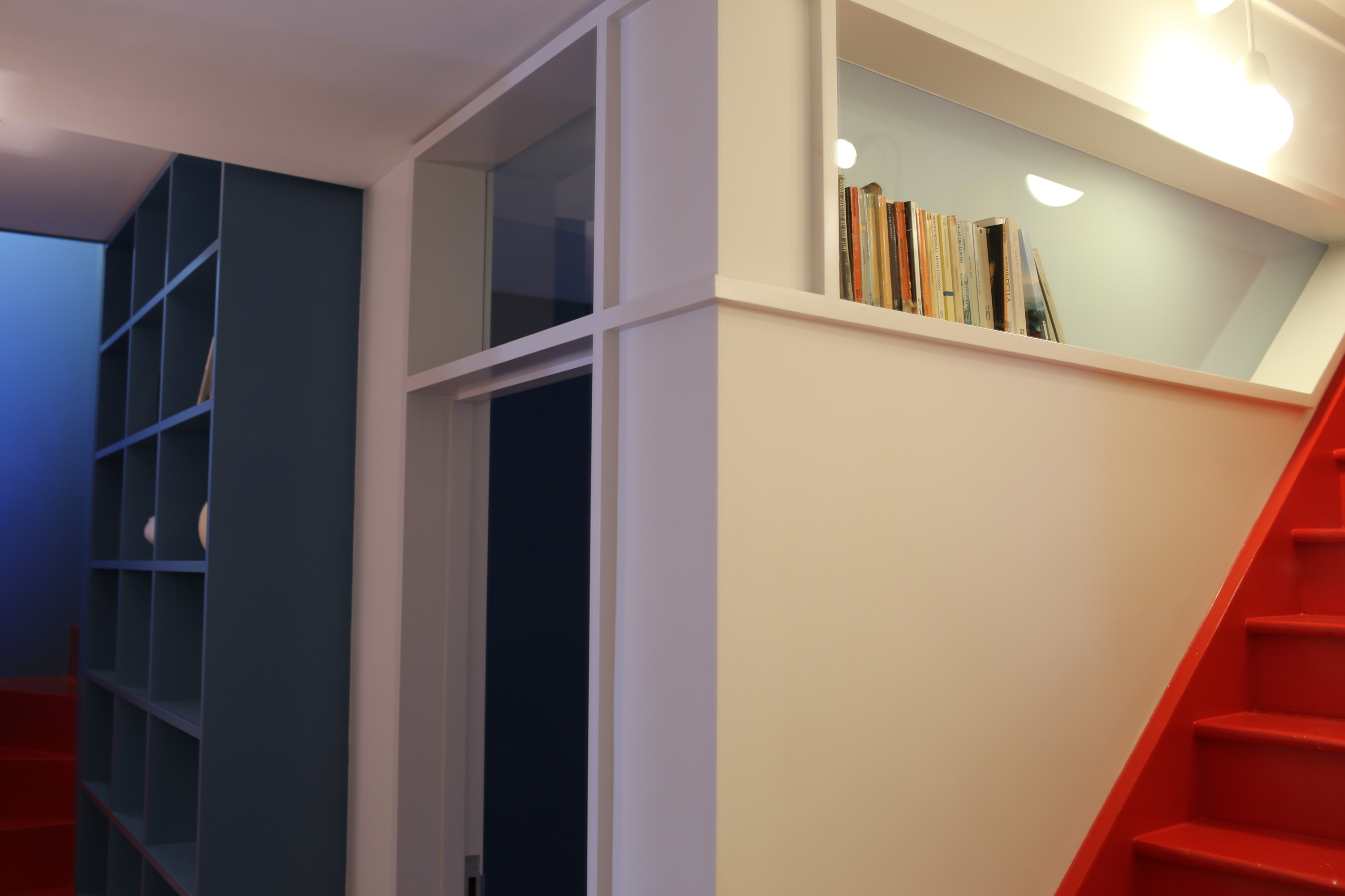 NOT using Farrow and Ball. We are confidently Dulux. A redundant staircase was converted into a library (there's a kiddy ledge that is situated near the top, not shown in the photos). Light is brought into what was previously a dark (dank, bleak) area through the use of clerestories, a large skylight spanning the width of the property (there is a grill above it for the communal terrace, which casts uncanny, Hitchcock bars of shadow through the rooms?), and a glazed wall unit (with integrated blind for privacy at night) to one side of the main corridor.