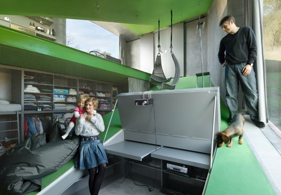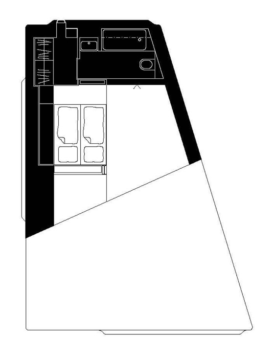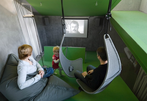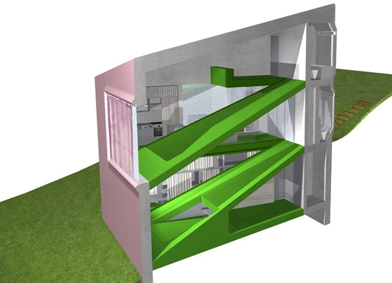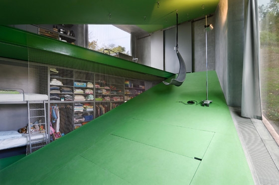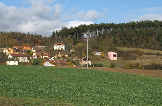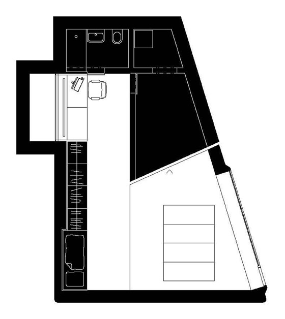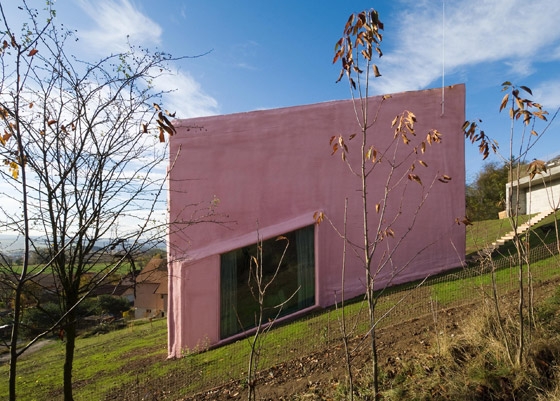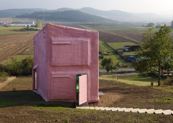 The building is situated on a sloping terrain on the outskirts of Černín, taking the same slope into its internals for floors. The interior layout is based on alternating straight and sloping floor surfaces that create the overall spiralling character of the interior and define the building’s external appearance. However, the use of the sloping floor on the ground floor is not purposeless – it is there on investor´s reguest to accomodate movie projections as a small movie theatre. Windows and other openings are placed with respect of the external façade – each of the walls only has one opening. For thermal and water insulation a polyurethane spray with pink coat is used, meant as a credit to our favourite building of Versuchsanstalt fur Wasserbau und Schiffbau by Ludwig Leo.