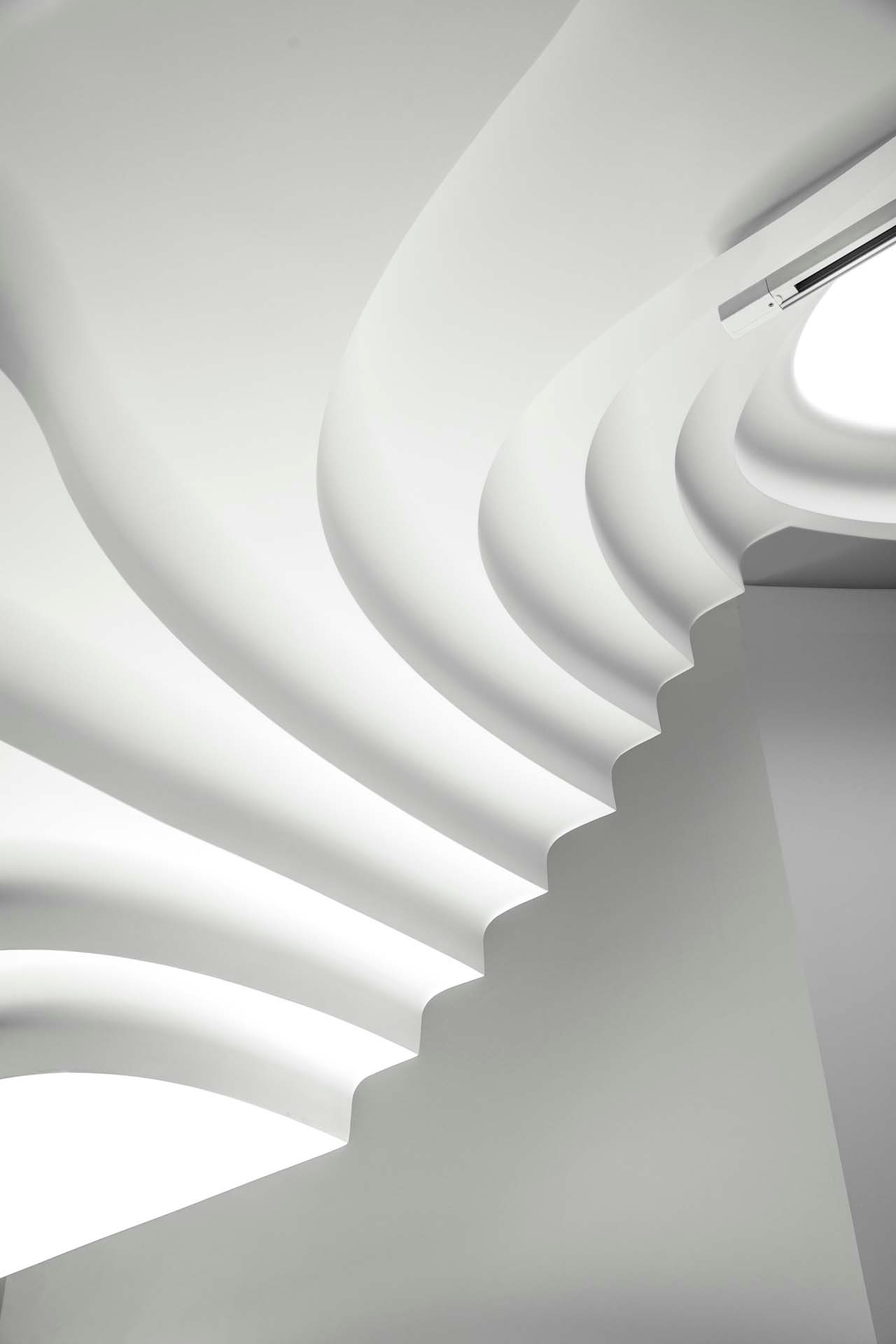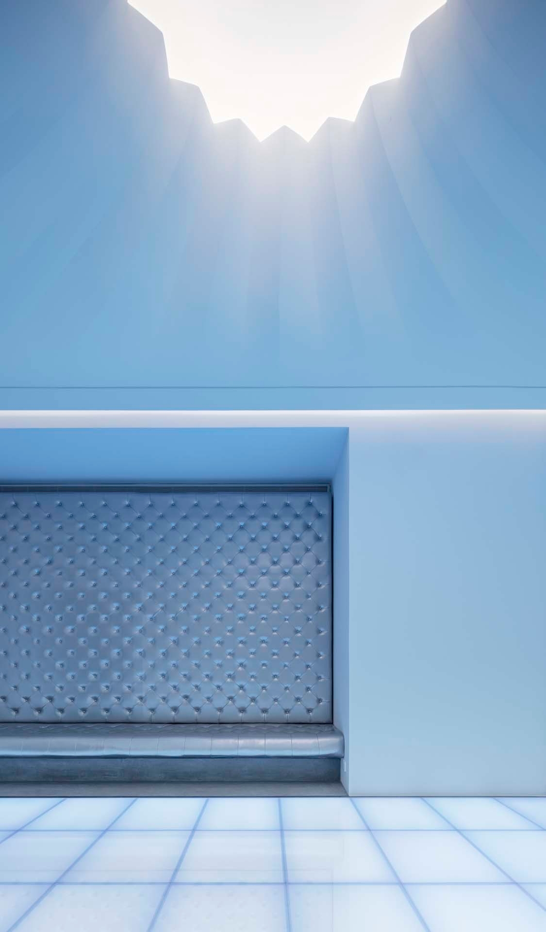 The interior space is a canvas of white walls and concrete floors, with a ceiling that animates the space. In order to secure as much of the spatial height as possible, the ceiling’s surface swells like waves, creating high and low areas that organically, and intuitively, conceal piping, such as existing ducts. Lighting is placed within the highest points of the ceiling, creating the appearance of lightwells, as if natural light is pouring into the ‘cave.’
