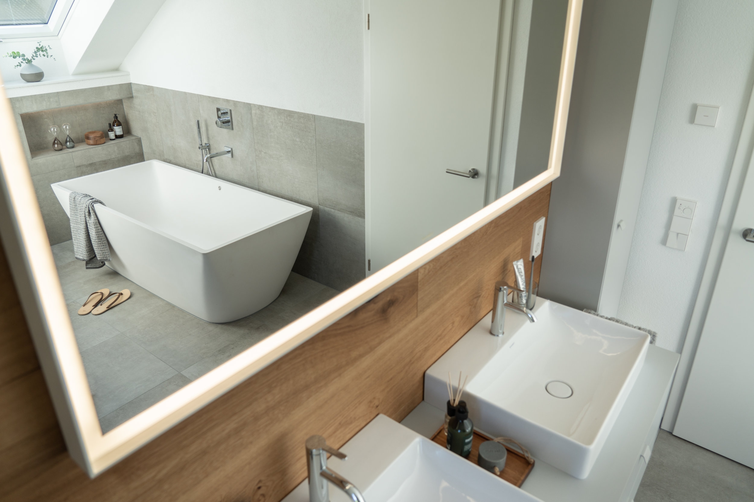 The freestanding bathtub with two back slopes and integrated air-whirlpool system is not only eye-catching, it is also a place for relaxation that the whole family can enjoy