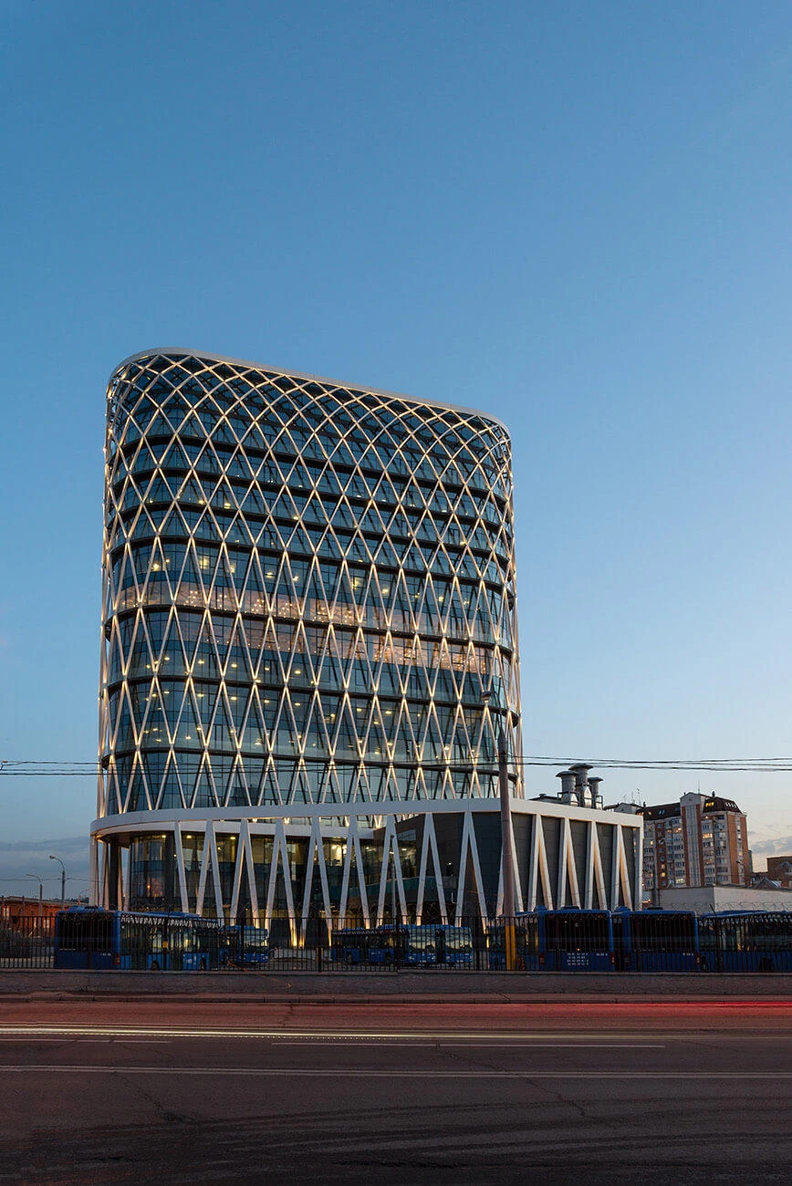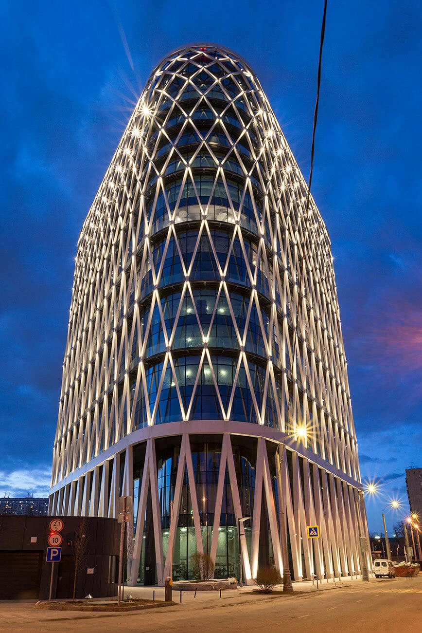 In the Zemel ‘nyi Business Center in Moscow, UNK Project and QPRO tried to minimise the effect of light pollution by orienting the luminous flux directly at the openwork metal frame of the facade. Photos: Marika Volkova
