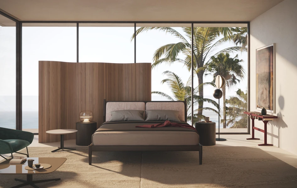 Although the products are highly functional, the level of sensory detail is also high. The bedrooms of the Sunrise House are furnished with pieces such as – the Maddox bed, featuring an airy structure and various integrated lighting options; the Eureka vanity, designed to be secretly embedded as an intimate wall cupboard; or the Tian wardrobe with transparencies that playfully reveal and blur.