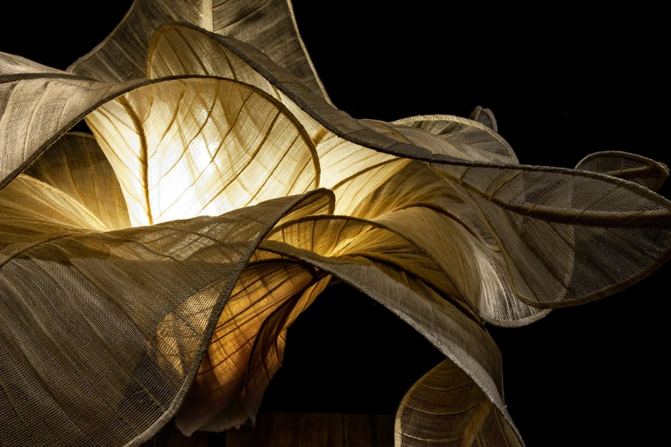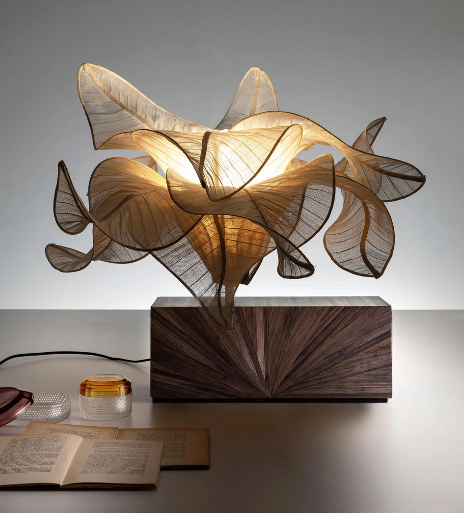 Designers of fabric-shaded lamps are able to determine the exact level of translucency they want by adjusting the tightness of the fabric’s weave. Used in Laurameroni’s Aurizia lamp, for example, the shade’s tightly woven Banaca fabric ‘leaves’ – held firm with rye straw supports – can curve over themselves to form a floral arrangement. However, with a looser weave, such as that used for the shade of in-es.design’s Trama light, intricate repetitive patterns can be projected onto nearby surfaces and objects.