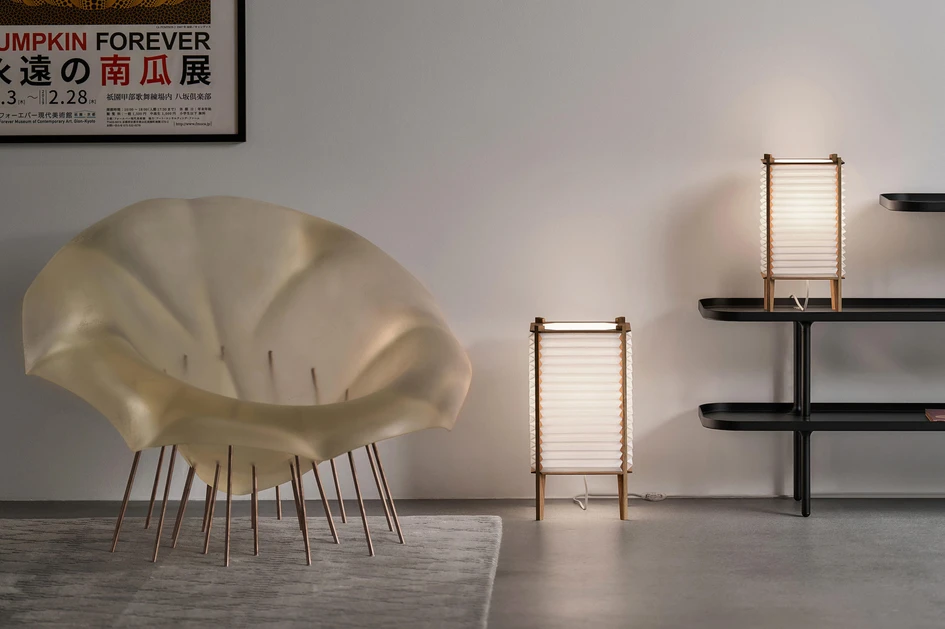 The Chou lantern lamp from lzf uses the translucency of thin natural veneer to provide a warming, fire-like glow through the wood’s natural grain