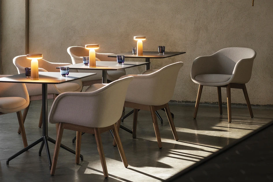 The rise of outdoor living spaces means nearby power sources can be hard to find, and the warmth of a soft-hued table light is not always possible. This is why wireless table lights you can recharge and place anywhere are also growing in popularity. Muuto’s portable Ease lamp, for example, applies one of three intensity levels of diffused downlight wherever it’s placed, giving users the light they need without distracting other users. Meanwhile, by mimicking other moveable objects and light sources, Slamp’s Clizia Battery lamp brings both the light of a candle and the beauty of a floral centrepiece to a romantic evening, indoor or out.Projekgalery
