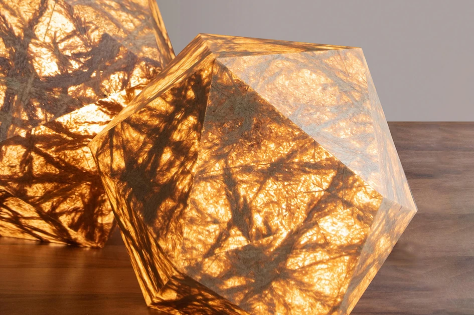 Being both rigidly ordered and mathematical as well as wildly creative and unpredictable, the natural world is the perfect place to find materials with organic patterns for diffused light. Made from bioplastic, for example, Viaplant’s Hedron lamp creates visualisations of nature’s artistic accomplishments. Looking elsewhere in the periodic table, the Fuwas lamp from Hands on Design uses translucent alabaster and lzf combines the slender form and patterning of natural veneer to surround the Chou lantern with pattern and form.