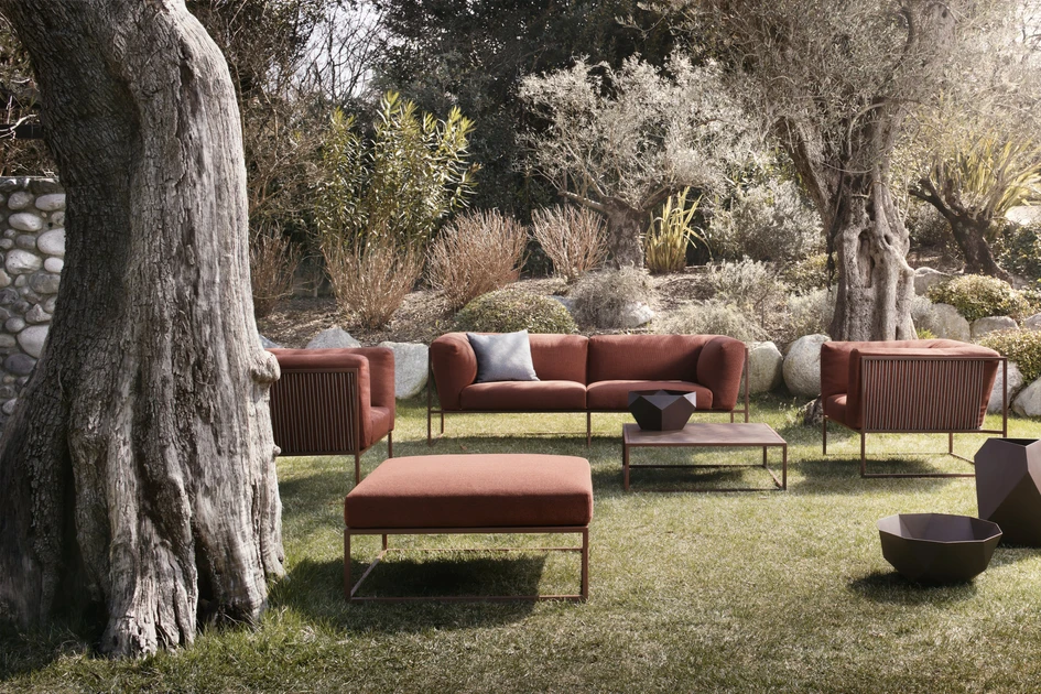The collection includes dedicated outdoor designs such as the Arpa sofas and armchairs, as well as outdoor versions of classic products like the Tense table. Photos: © Thomas Pagani