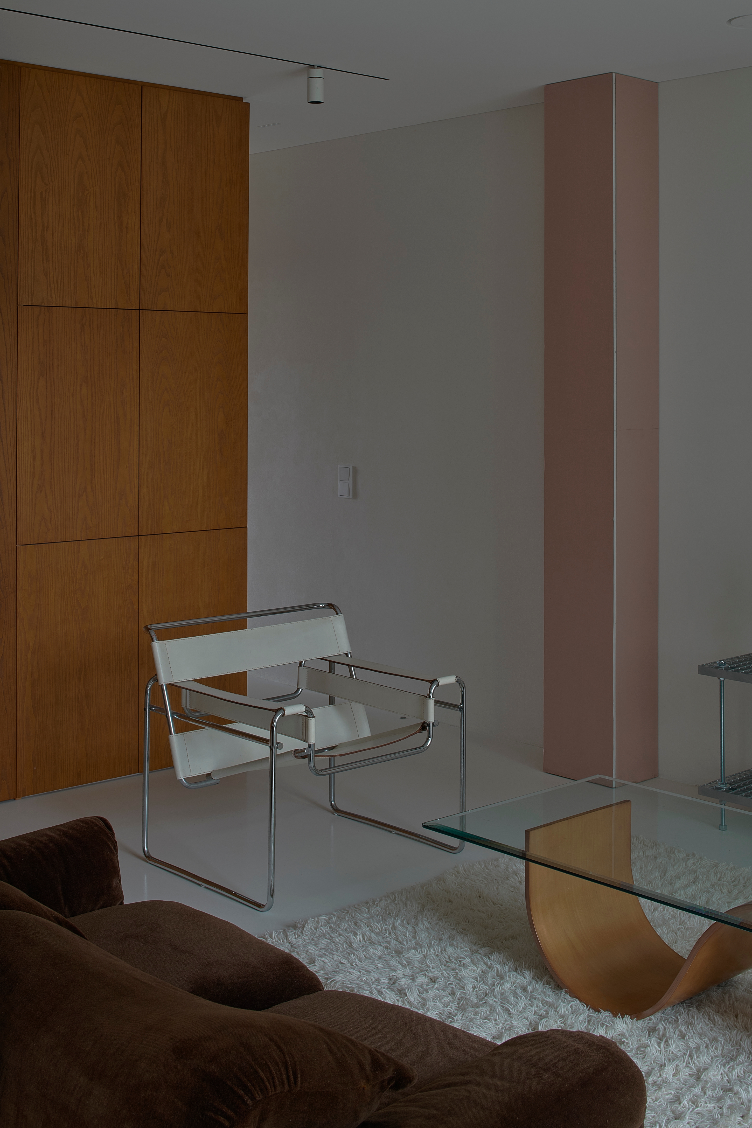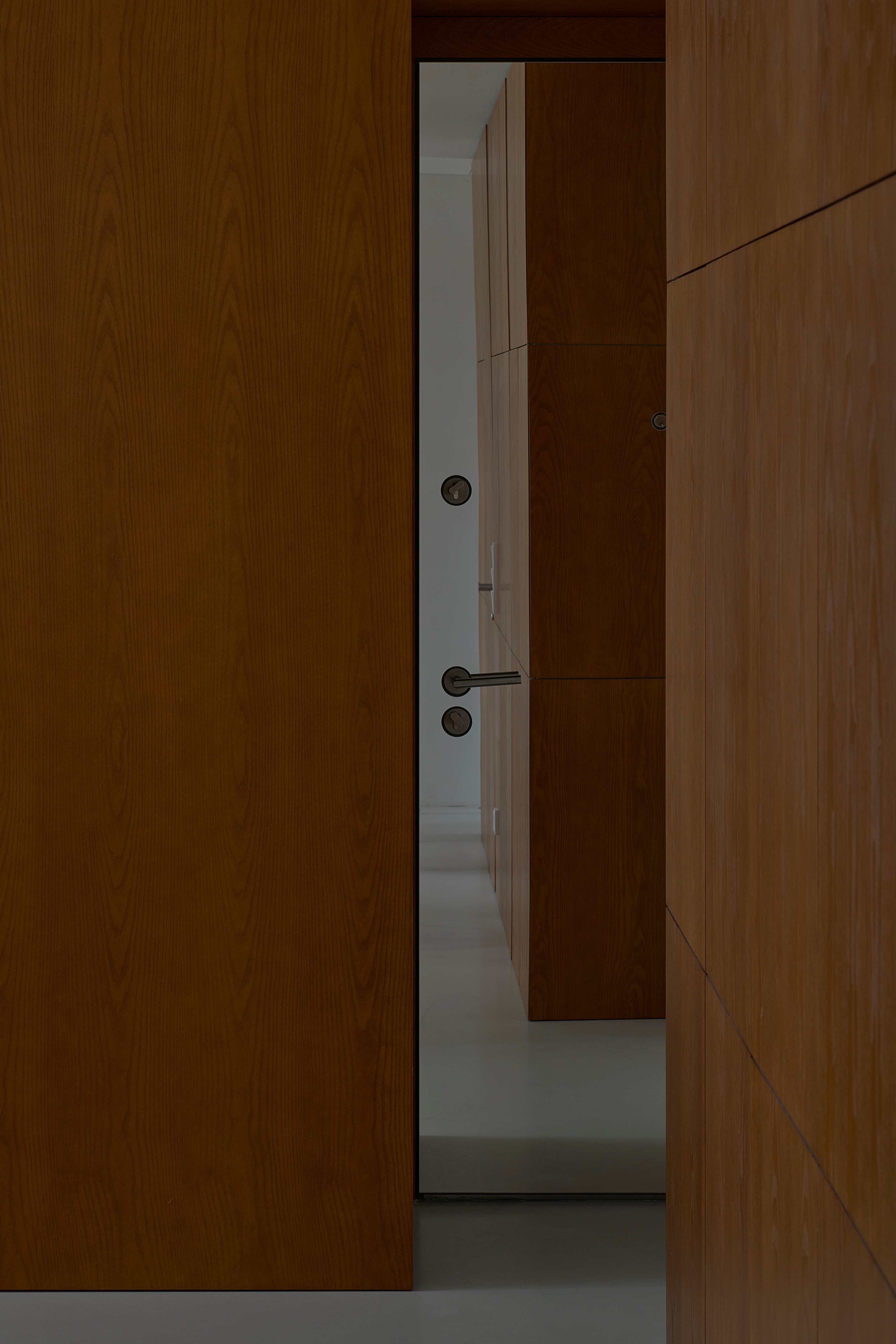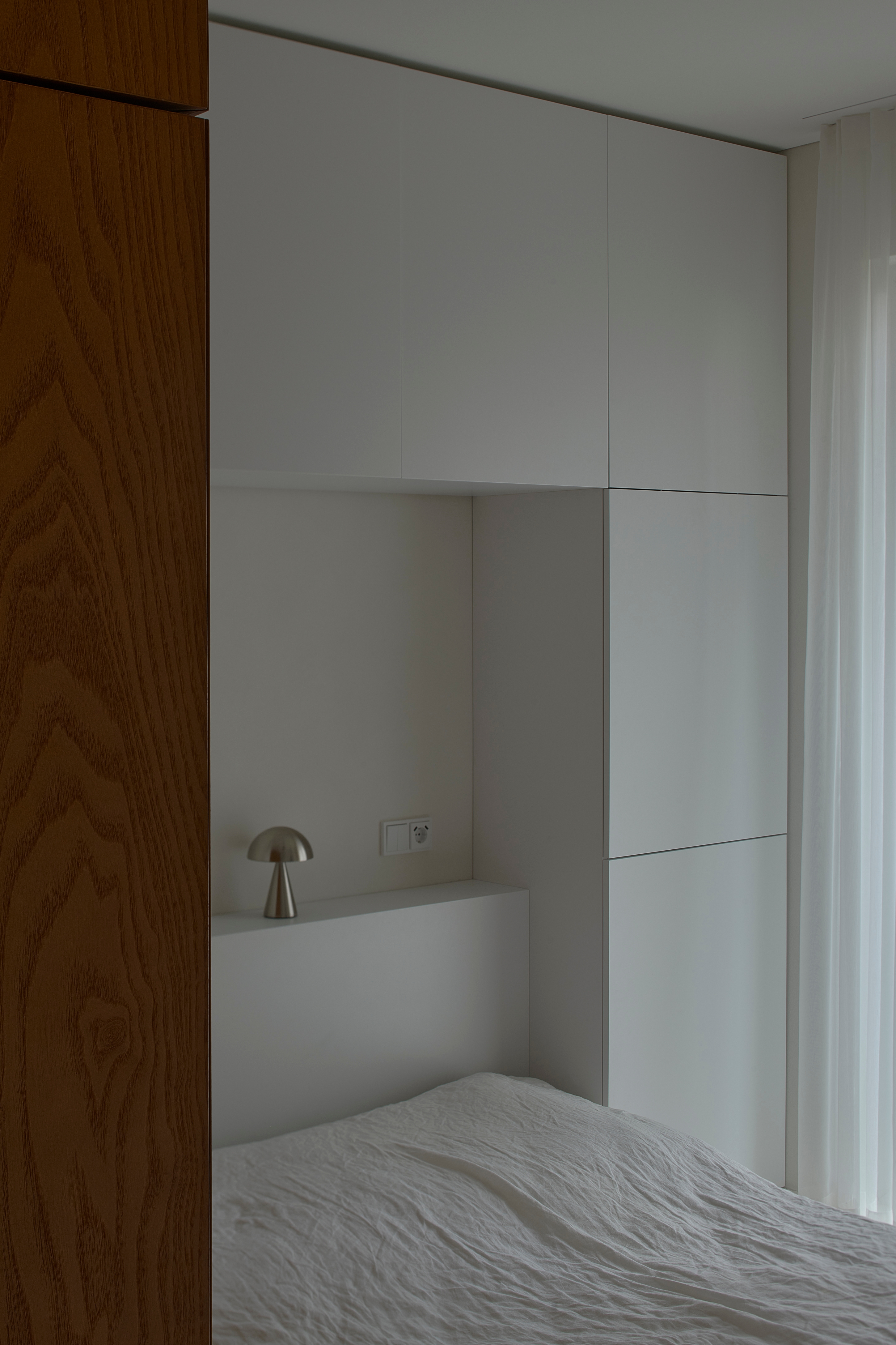 Within this bare-bones context, the remainder of the interior takes on a transformative role, providing both spatial definition and material depth. It is not merely functional but architectural — organizing space and unifying the apartment through a coherent textural and material language. At the heart of the project lie two continuous closet elements that act simultaneously as separators and connectors: they shape bedrooms, conceal auxiliary areas, and introduce a warm, tactile counterpoint to the otherwise restrained palette through their natural wood finish.