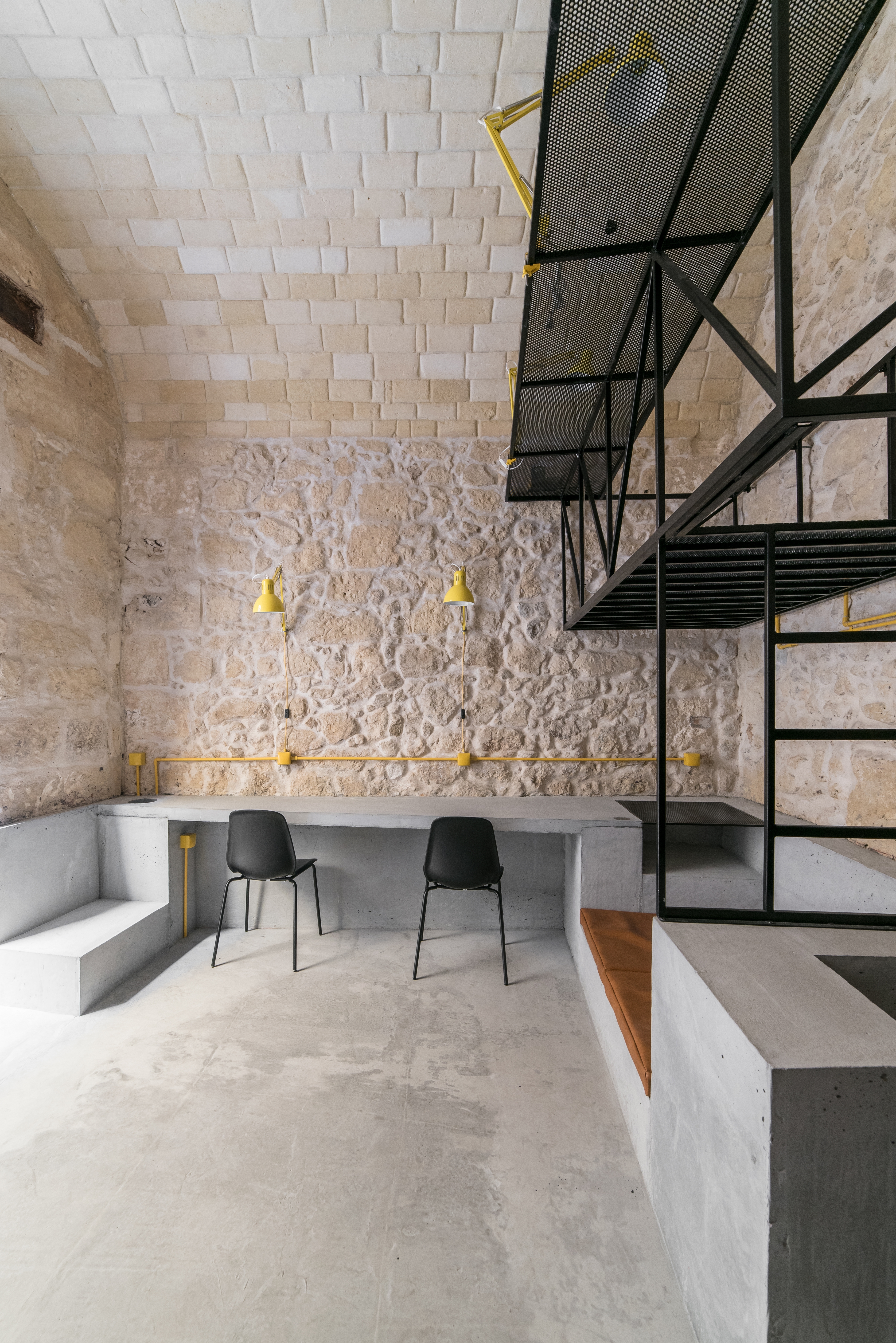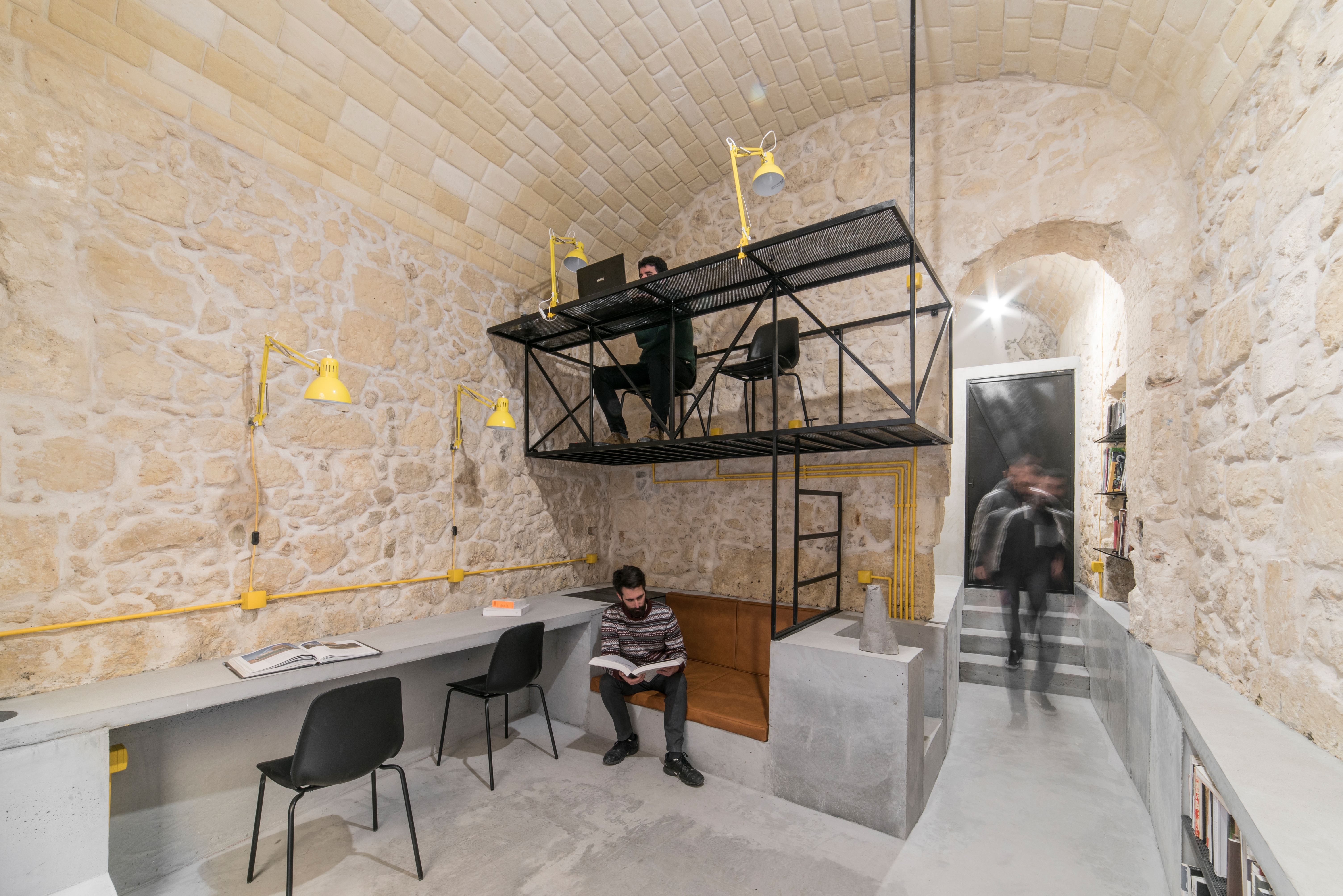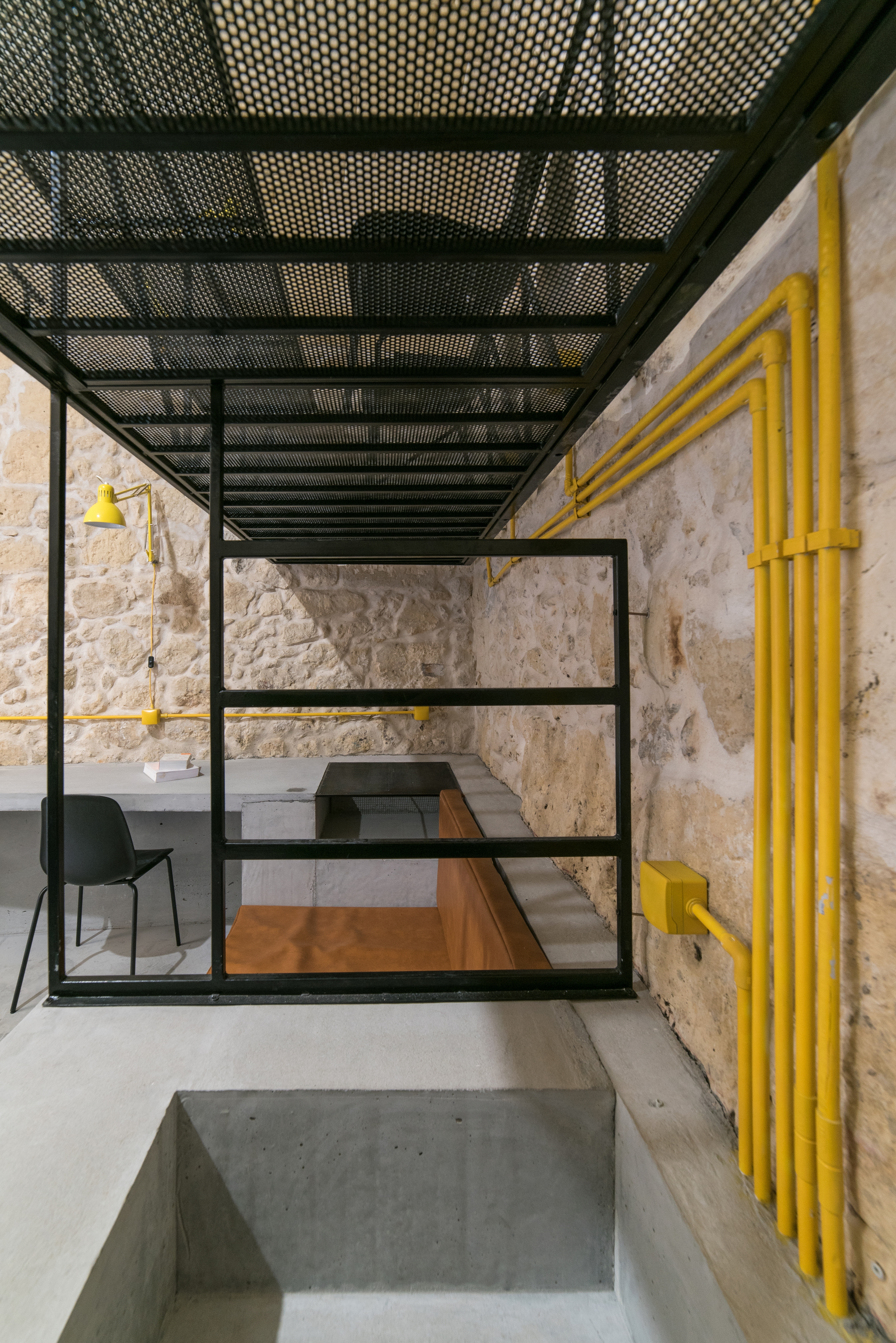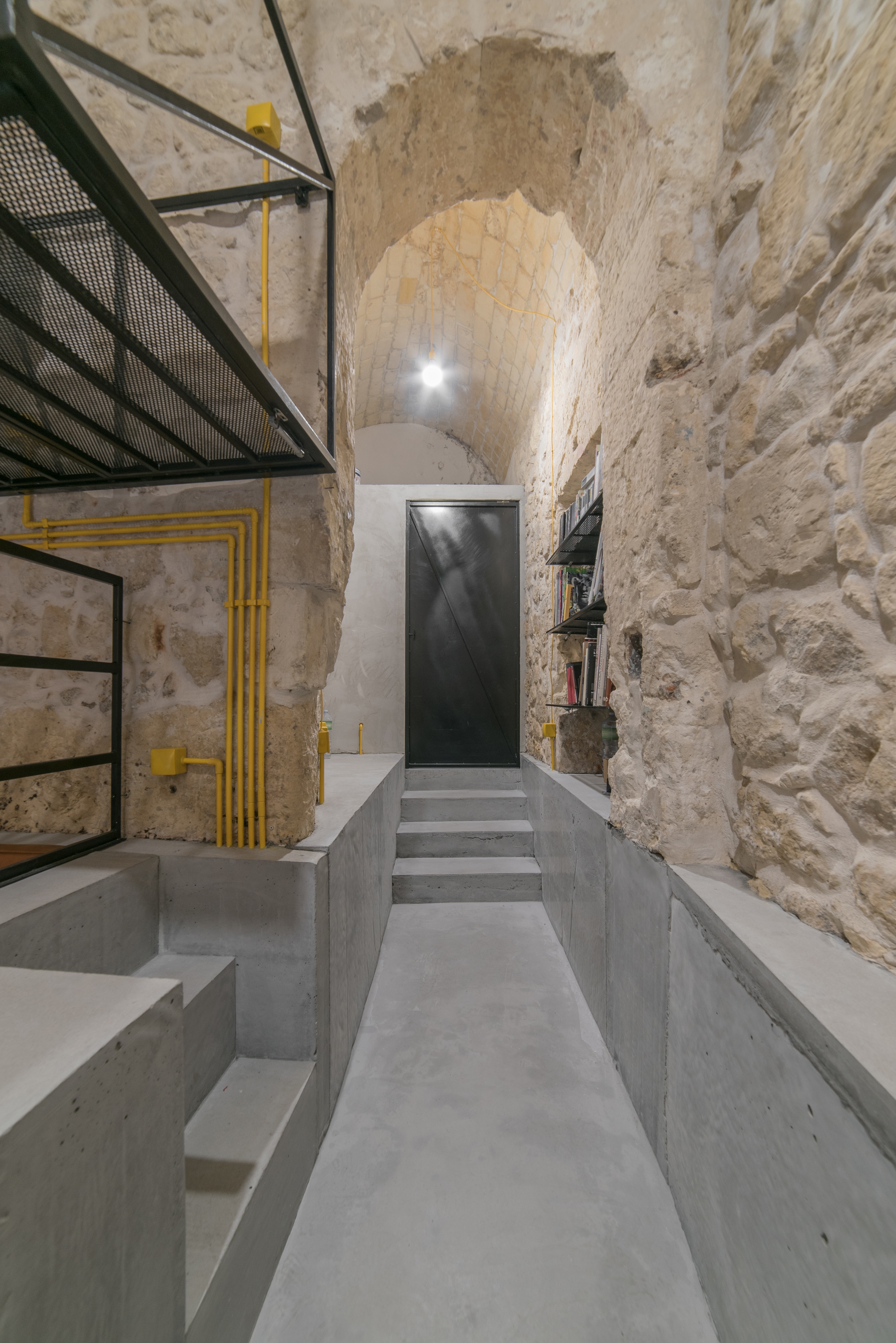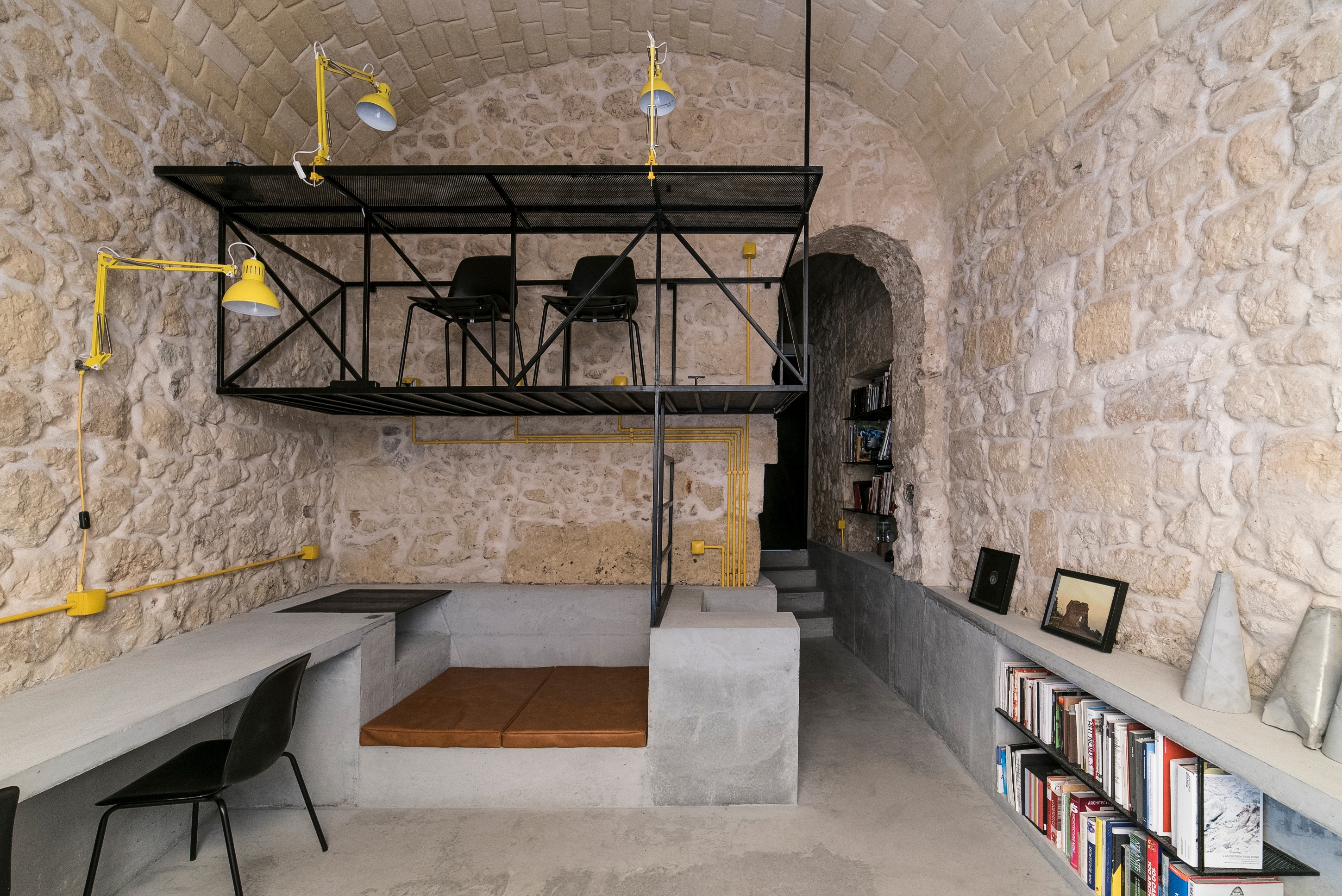 The office is composed of a single 16 m2 room that is connected to a small toilet through a short corridor. Both walls and vaulted ceiling are made of tuff which is the most common material for the area.