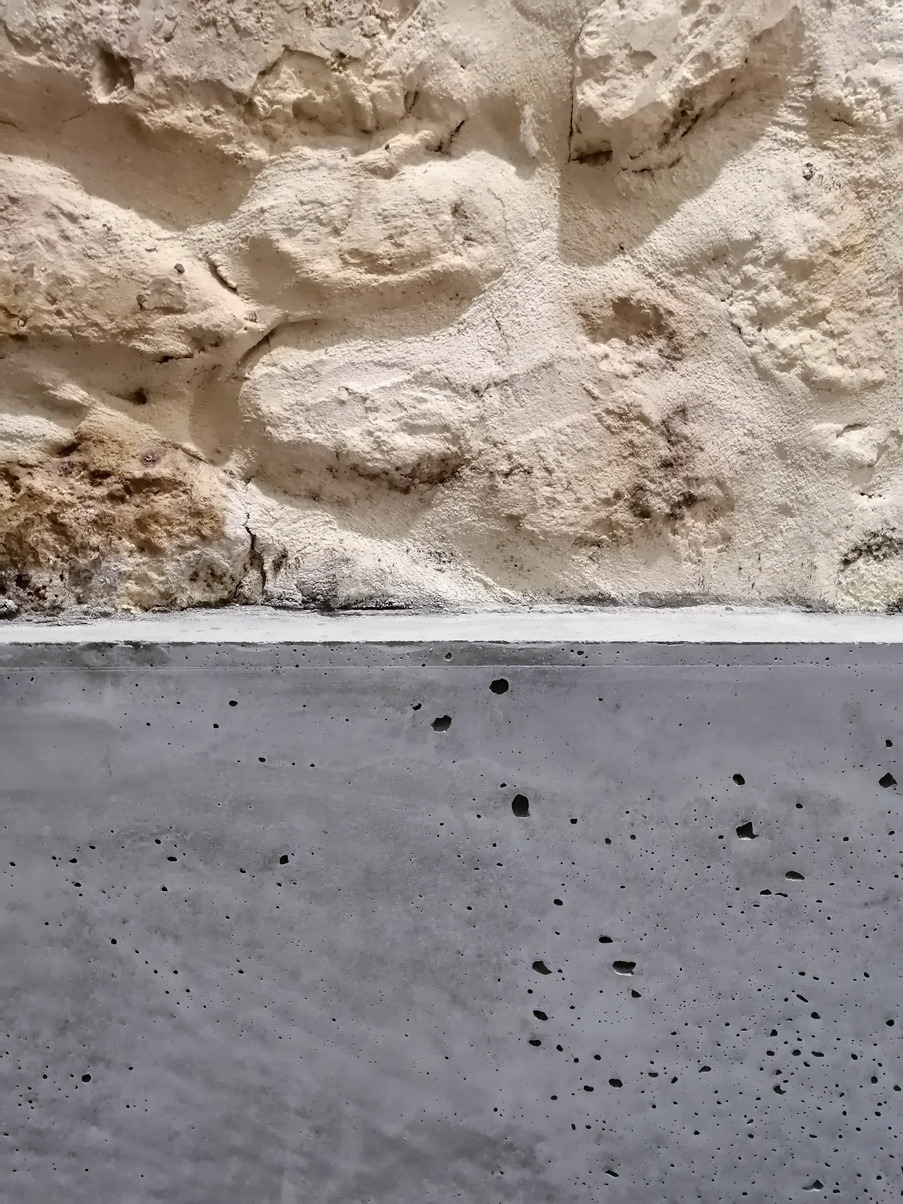 The smooth grey concrete, remains ar 80 cm constant heigts all along the perimeter, creating a kind of net aorizon. Furthermore it produces a strong contraste with the rough texture of the stone walls.
