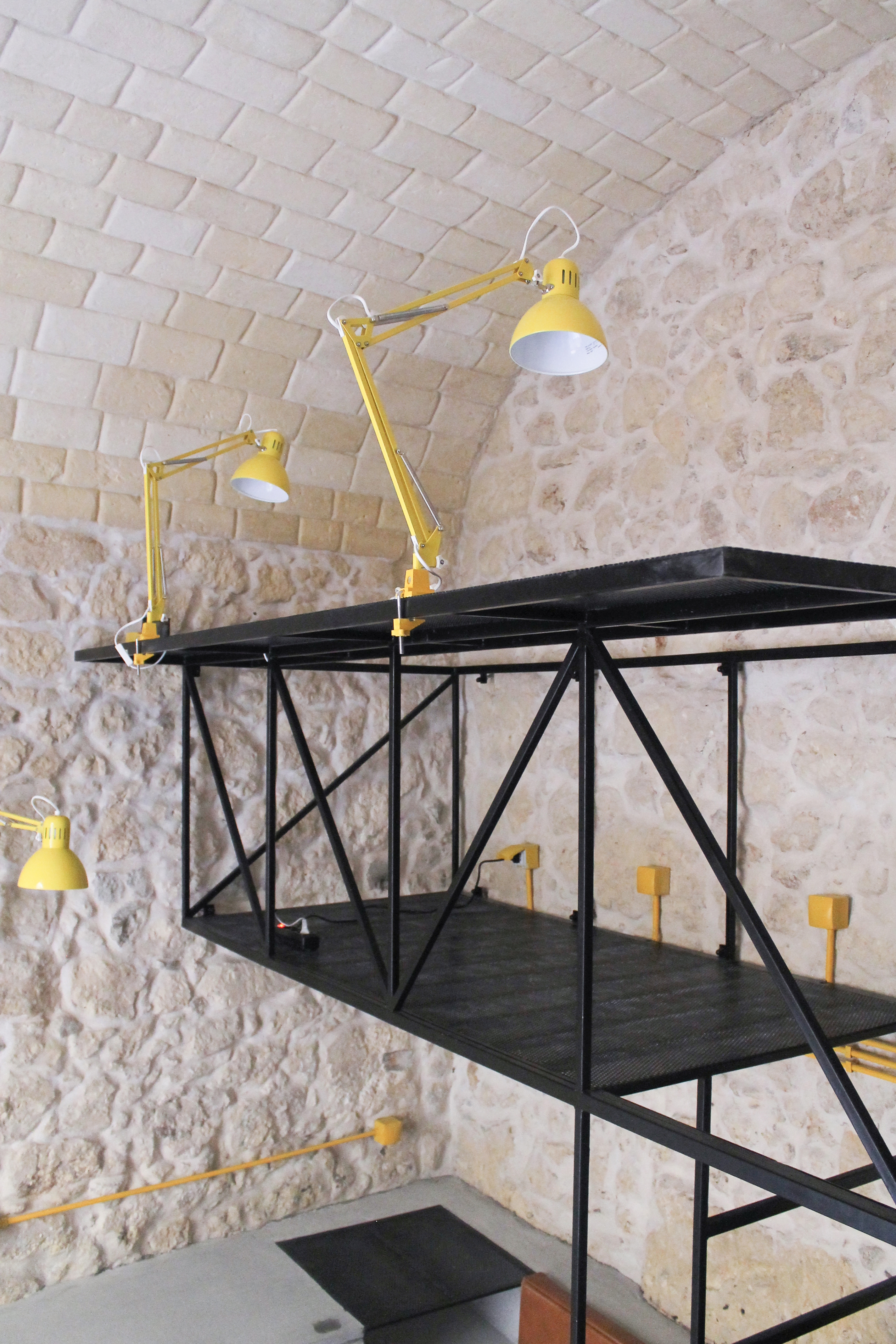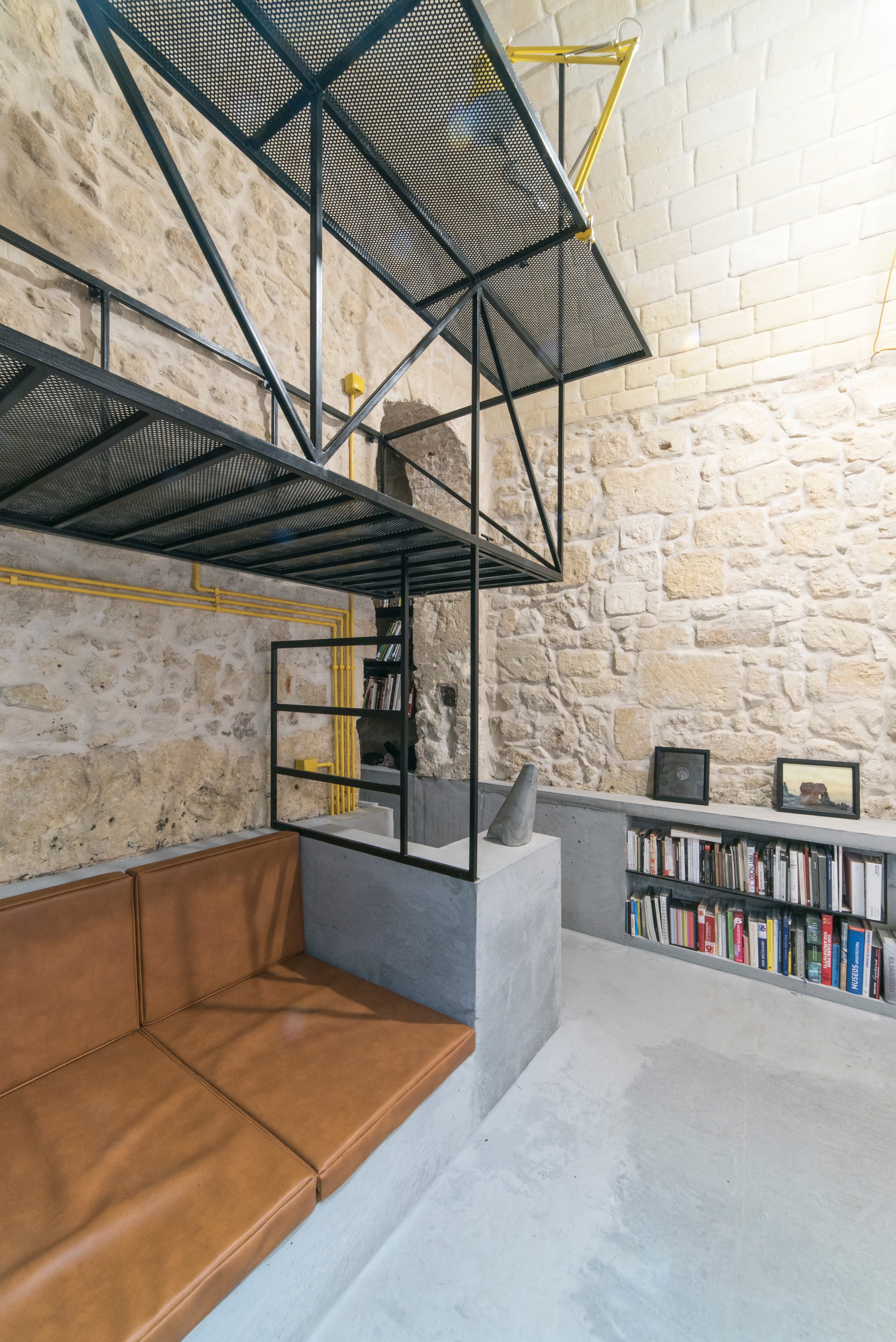 The light reticular structure is suspended above the wall mounted couch and it is accesible though a stepladder and a hatch. This addictional space canbe used as a further workstation.